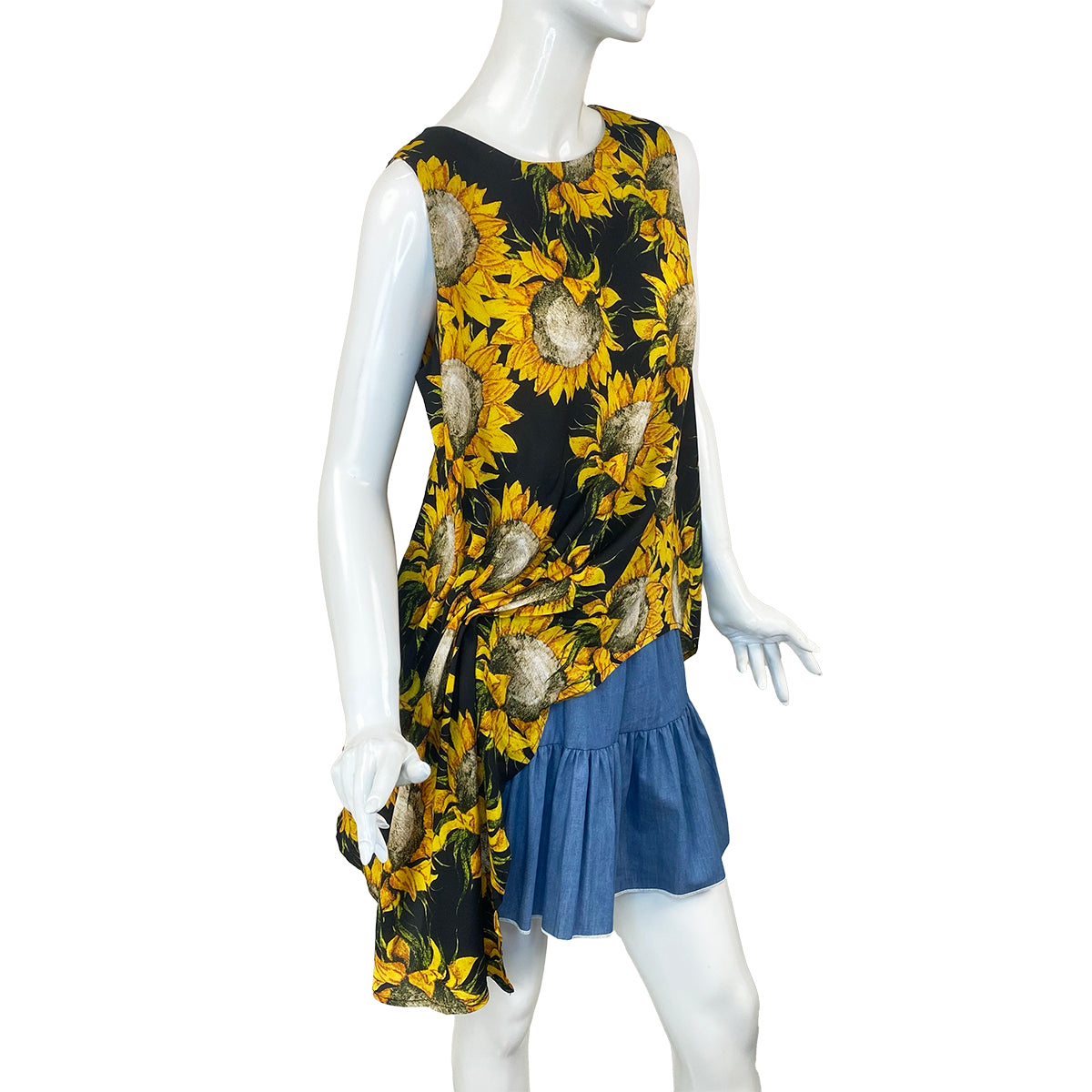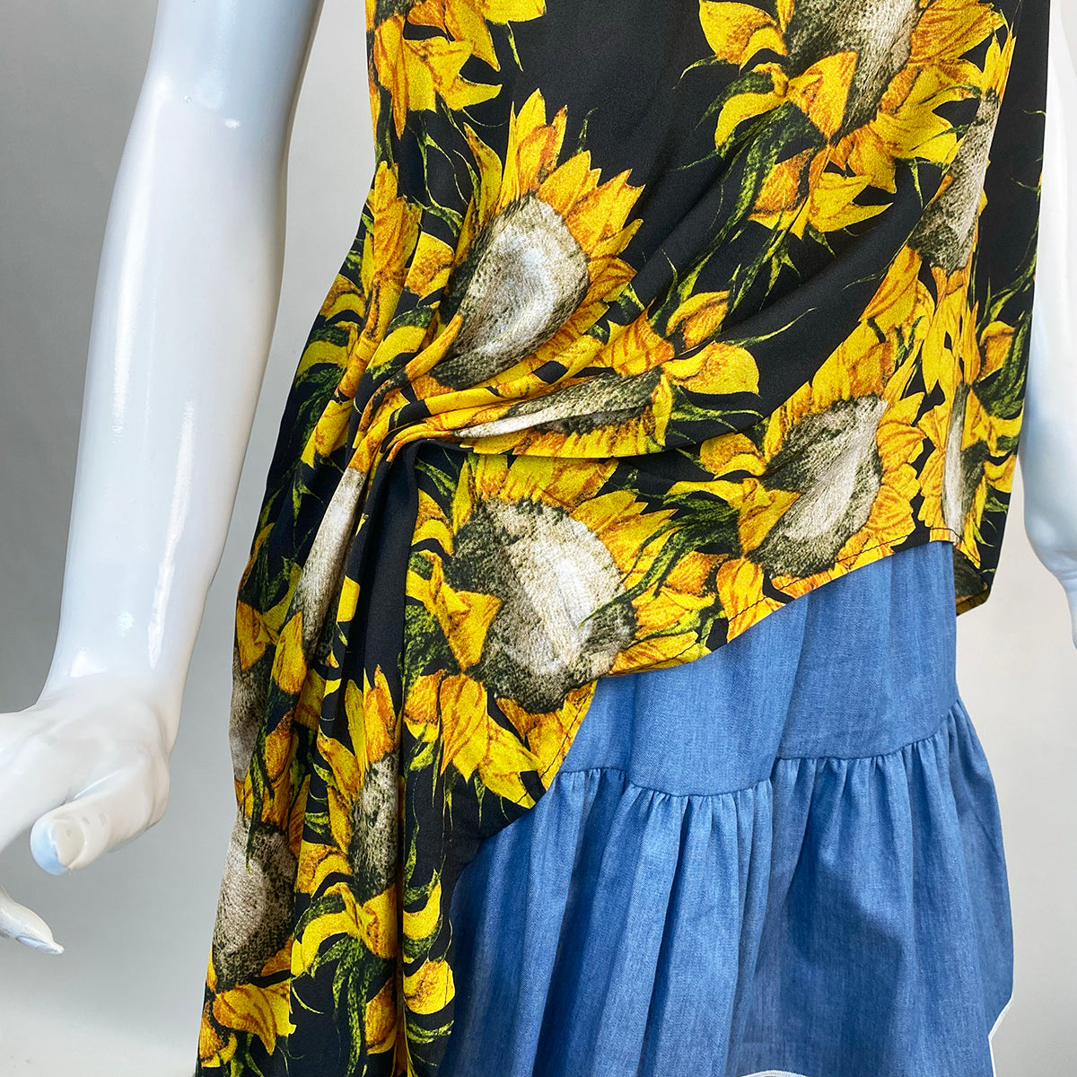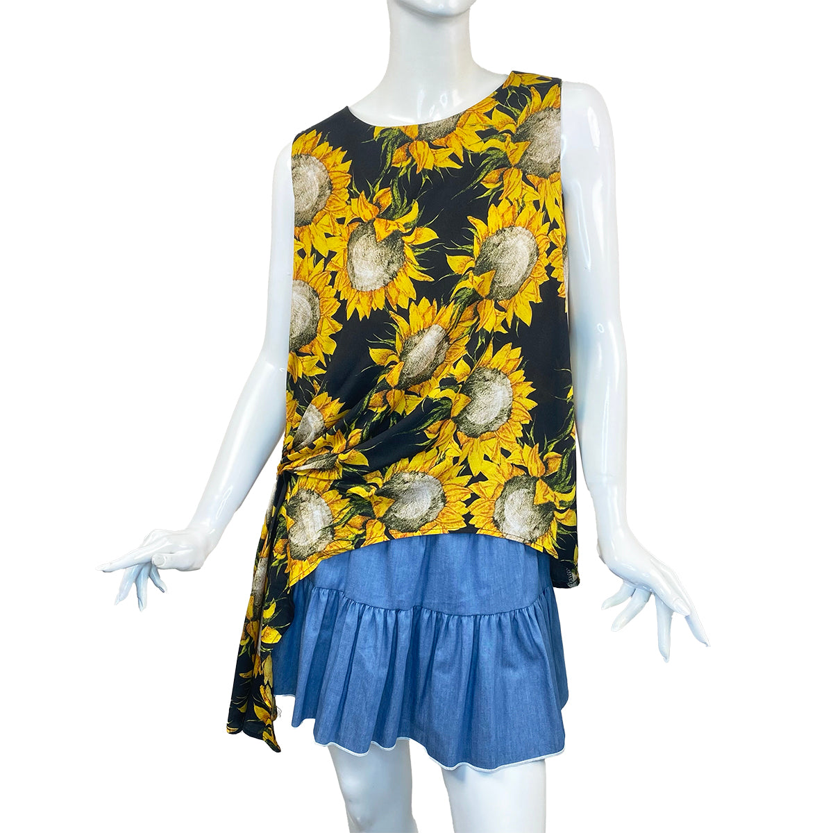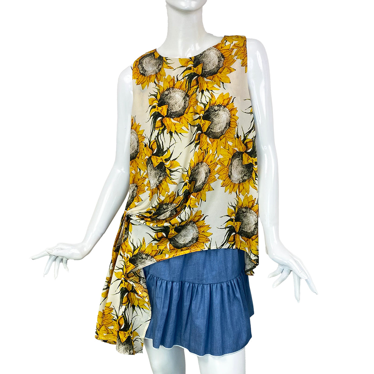 Brighten up your wardrobe with this stunning sunflower print asymmetrical drape blouse, designed to flatter every figure while making a bold statement. Featuring a vibrant sunflower motif on soft, breathable fabric, this blouse is perfect for adding a touch of sunshine to any look.
