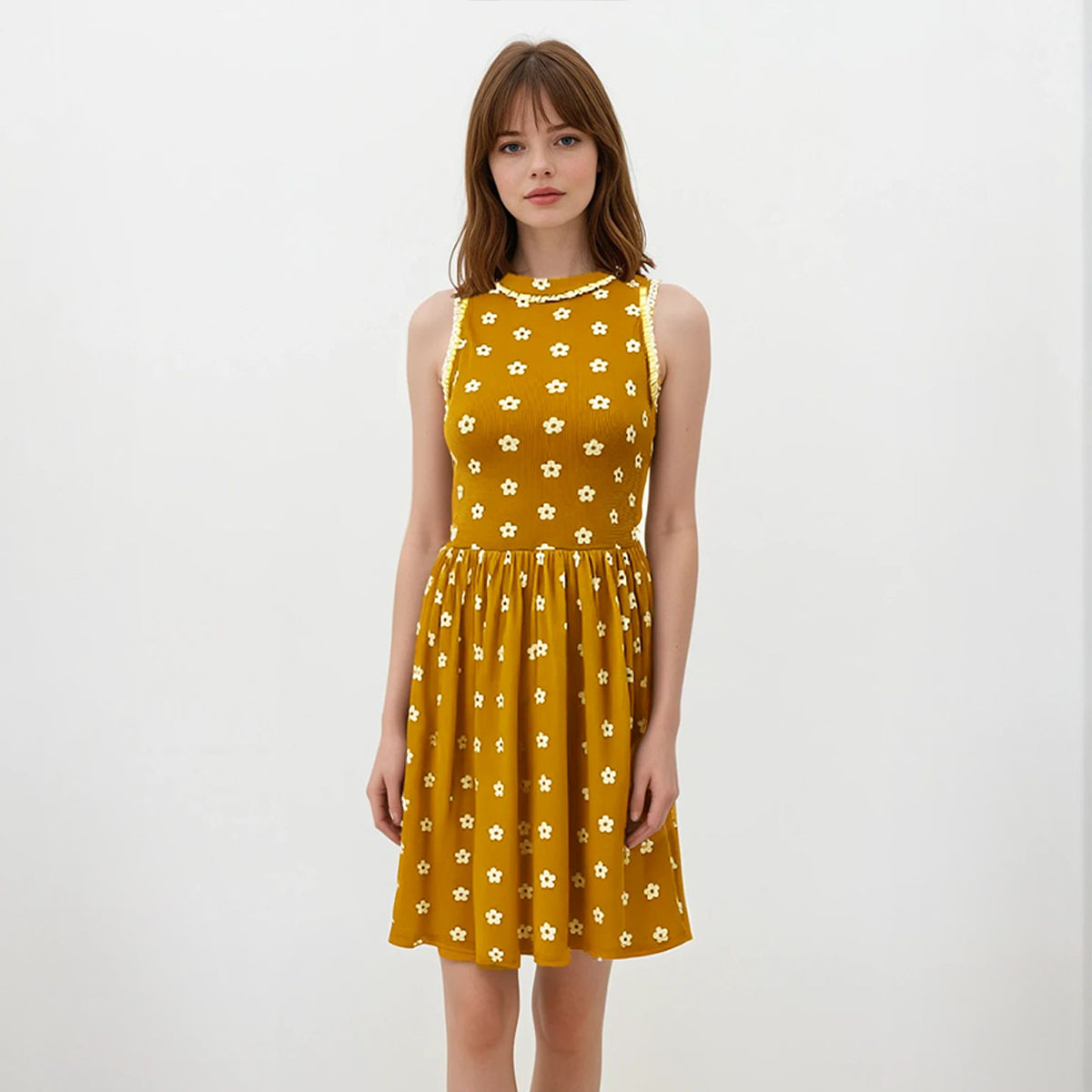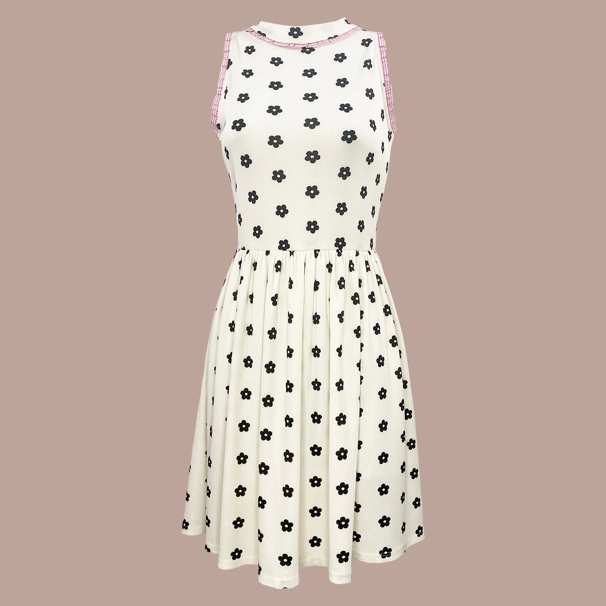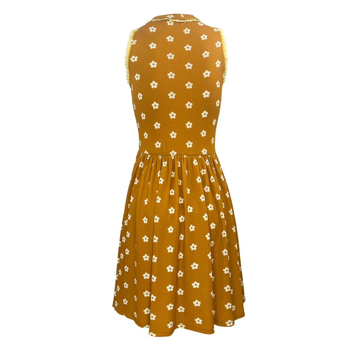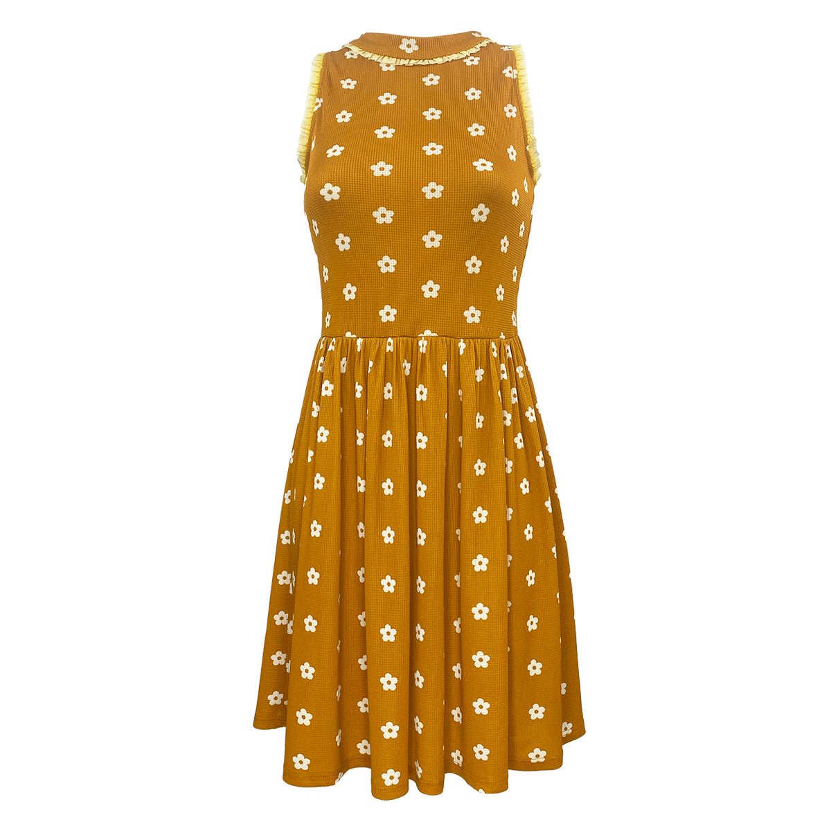 This knee-length dress features a charming sakura print on soft waffle knit fabric, offering gentle stretch for a comfortable fit. Delicate mini ruffles add a playful, kawaii touch, making it perfect for those who love cute and stylish outfits. Ideal for everyday wear or special occasions, this dress combines comfort and feminine flair effortlessly.