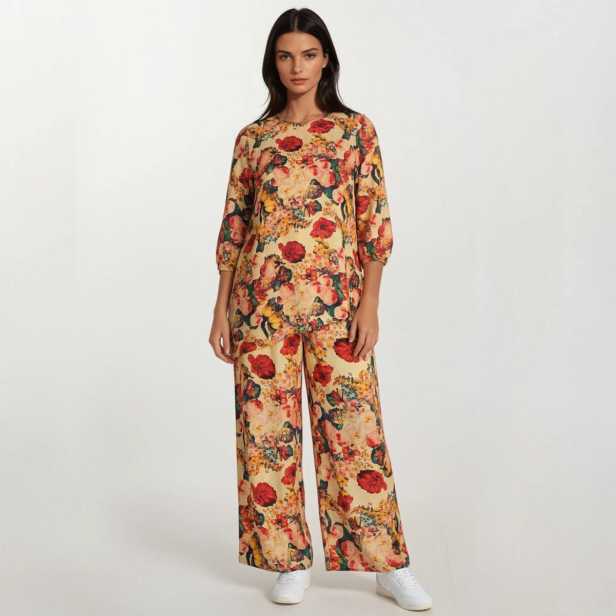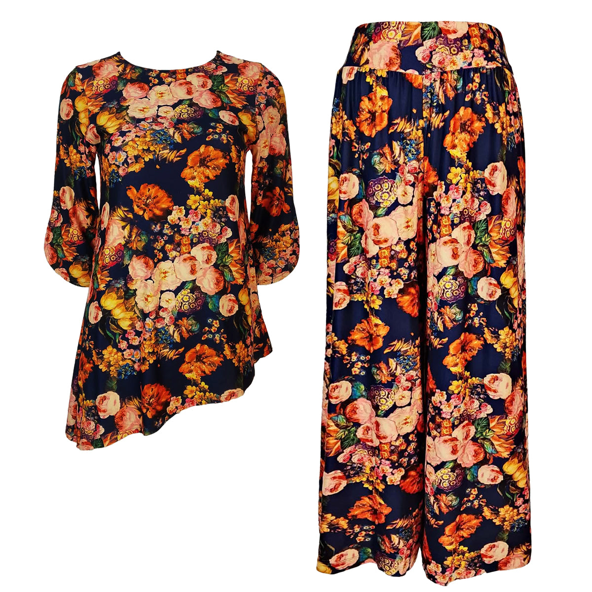 Elevate your casual wardrobe with this coordinated set featuring our signature digitally printed marshmallow fabric. The top showcases an asymmetrical hemline and comfortable elbow sleeves, while the matching easy pants offer relaxed, effortless styling. Crafted from soft, stretchy material, this ensemble delivers both comfort and visual impact. Perfect for those who appreciate thoughtful design and quality construction in their everyday pieces.