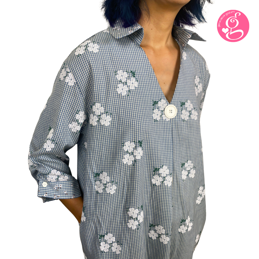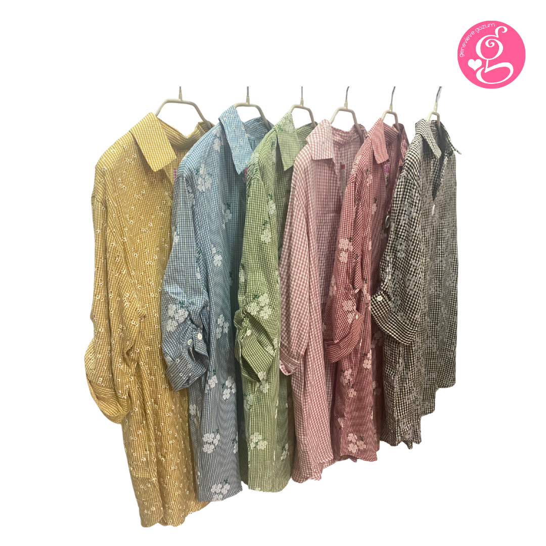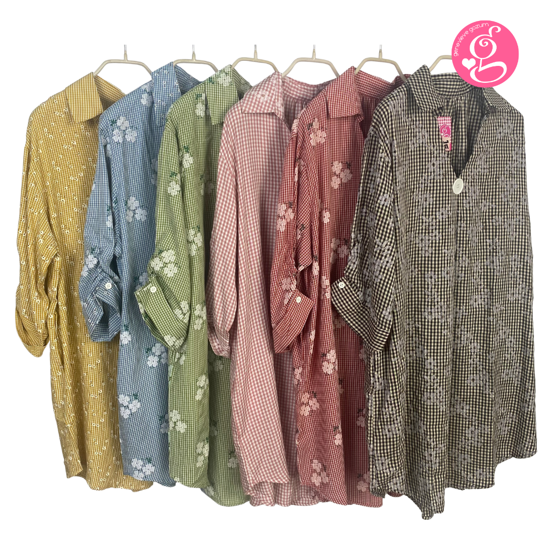 The Genevieve Gozum Candy Checkered & Floral Shirt Dress is a classic style, loose fitting, knee length dress.