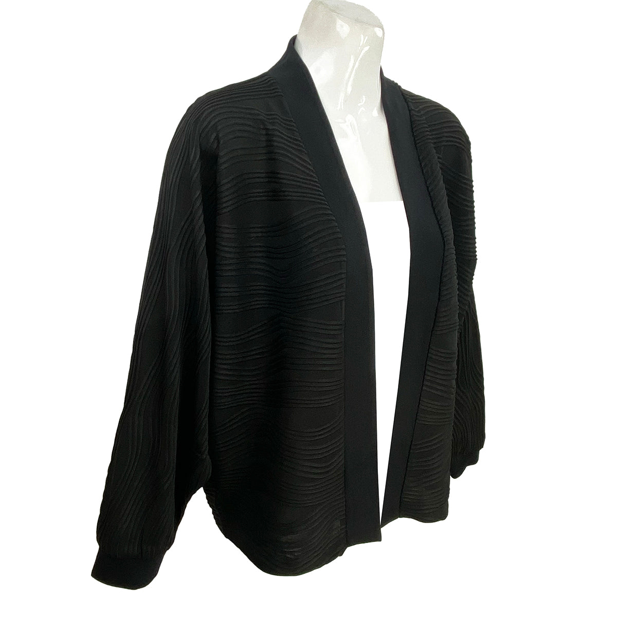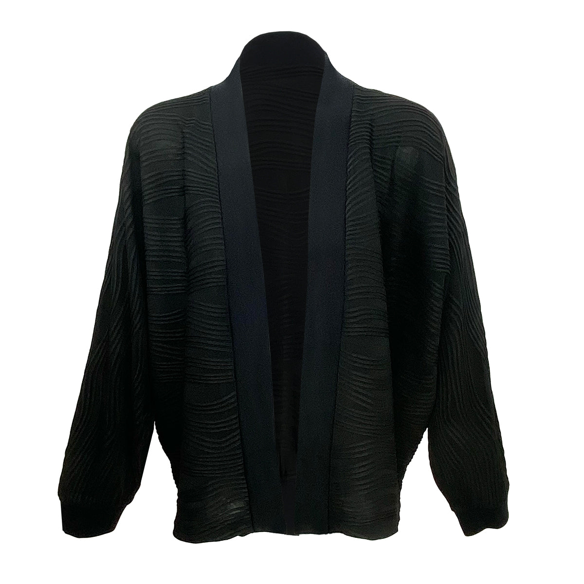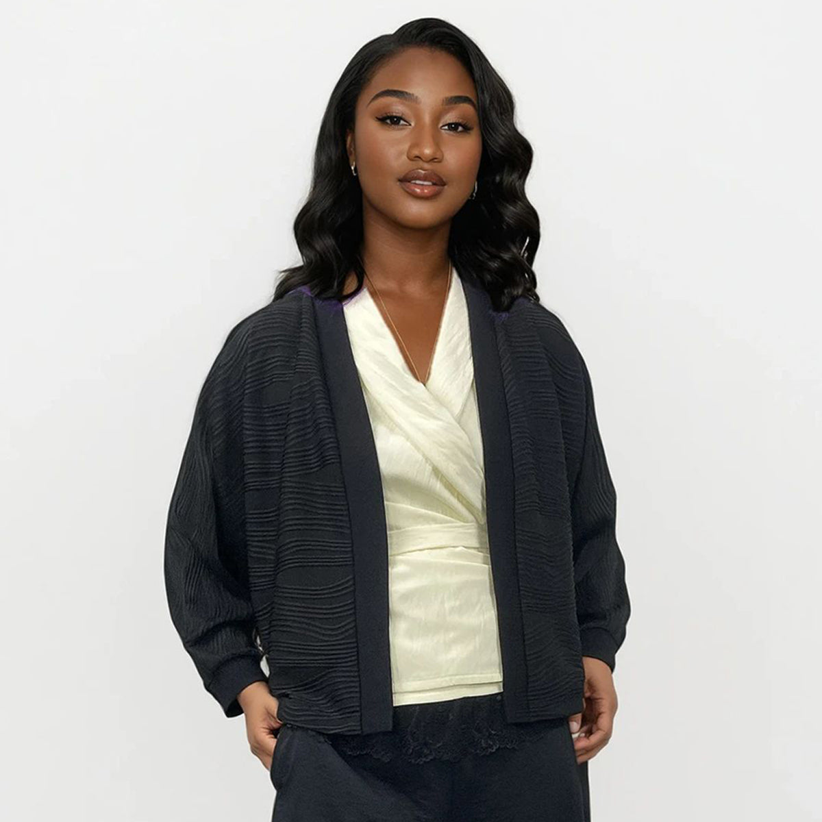 This dolman cardigan, crafted from our unique Cartoon Waves fabric, offers a textured feel and a figure-friendly fit that accommodates larger sizes comfortably. Its relaxed silhouette makes it an ideal go-to jacket for layering, combining style and versatility with ease.