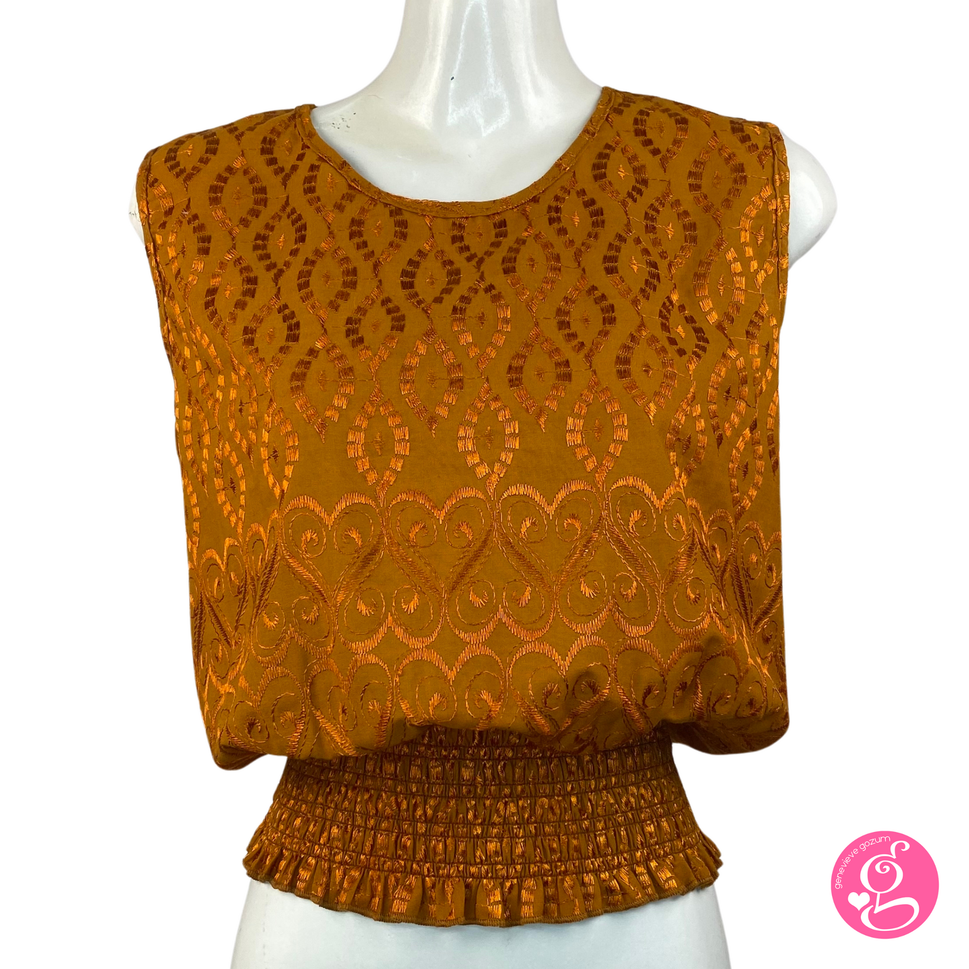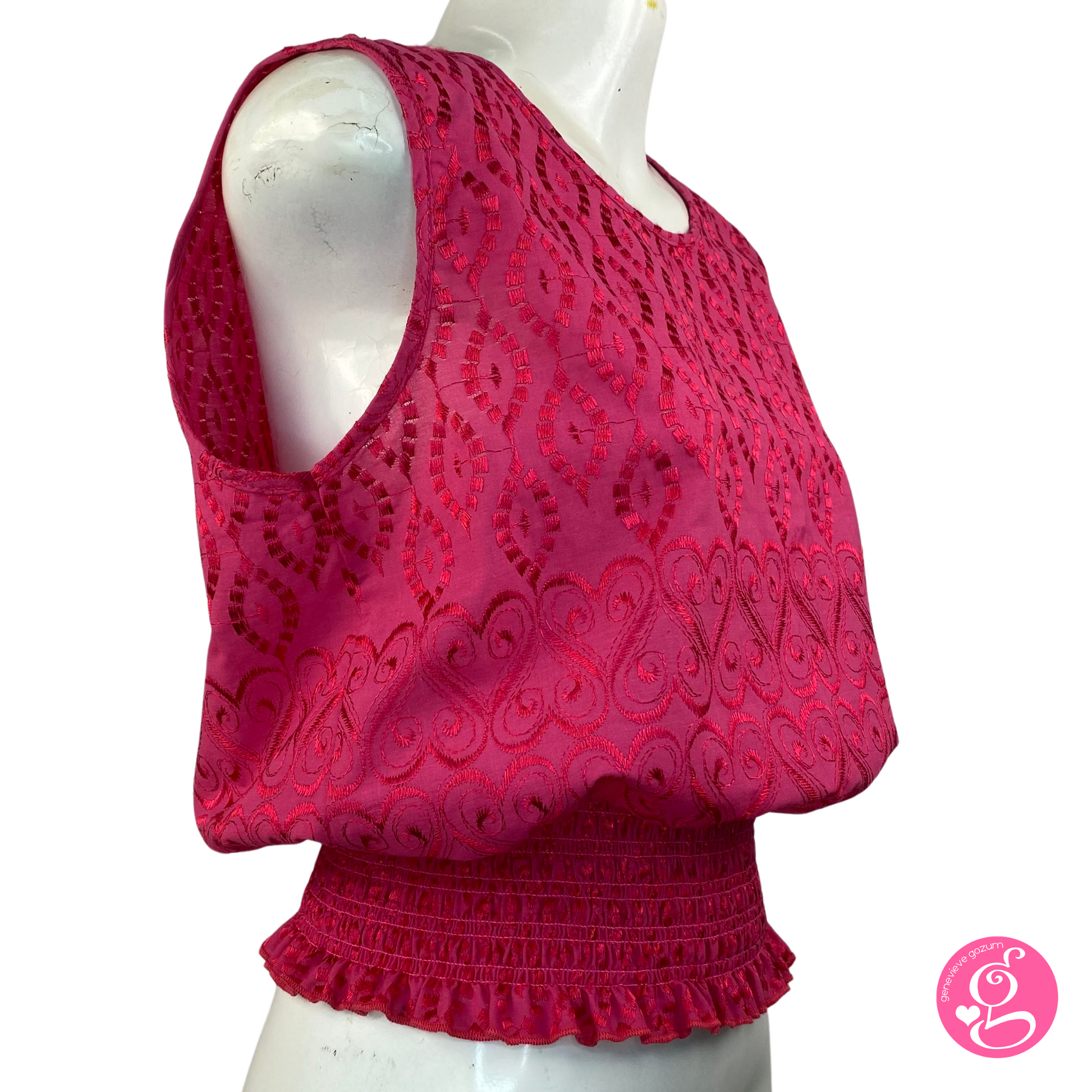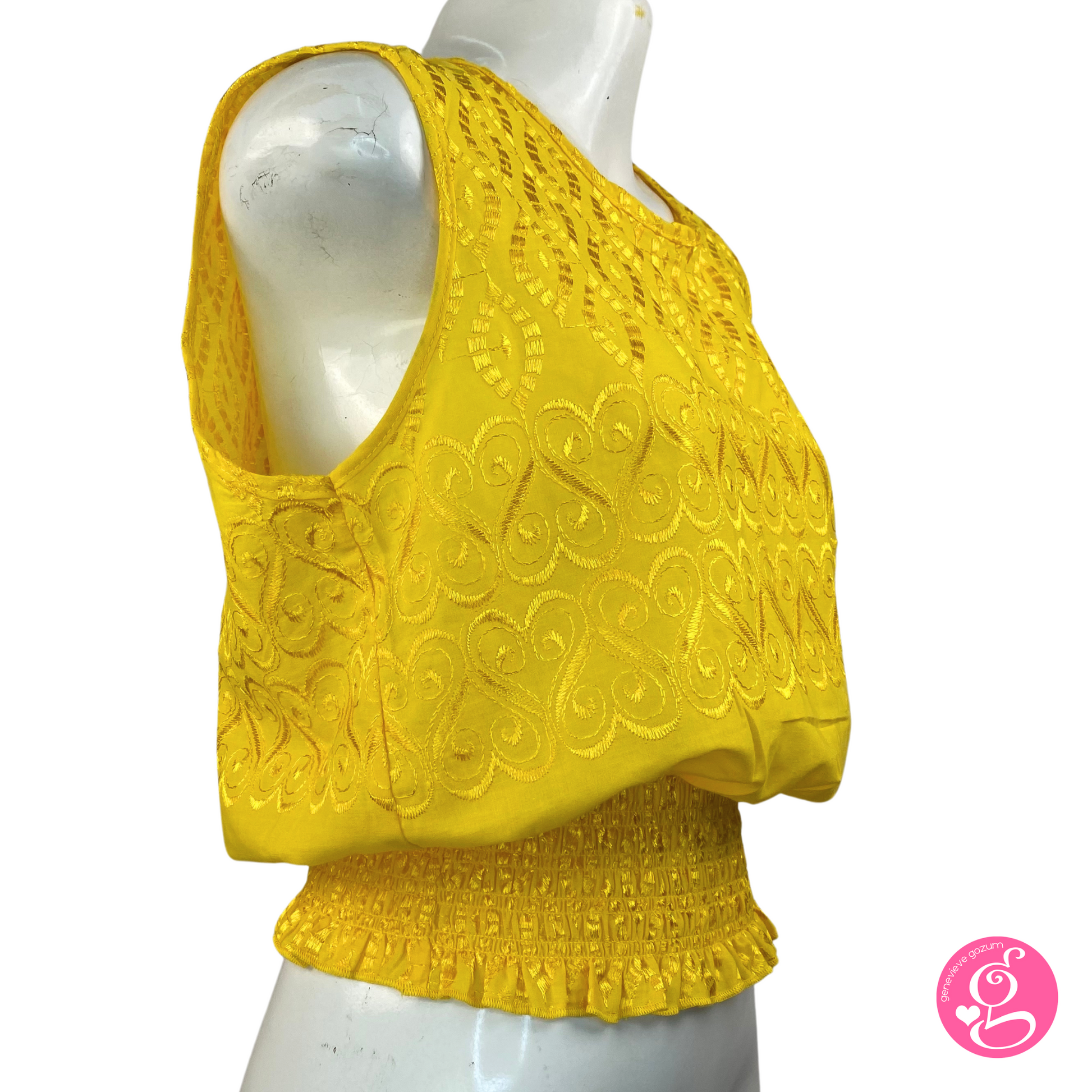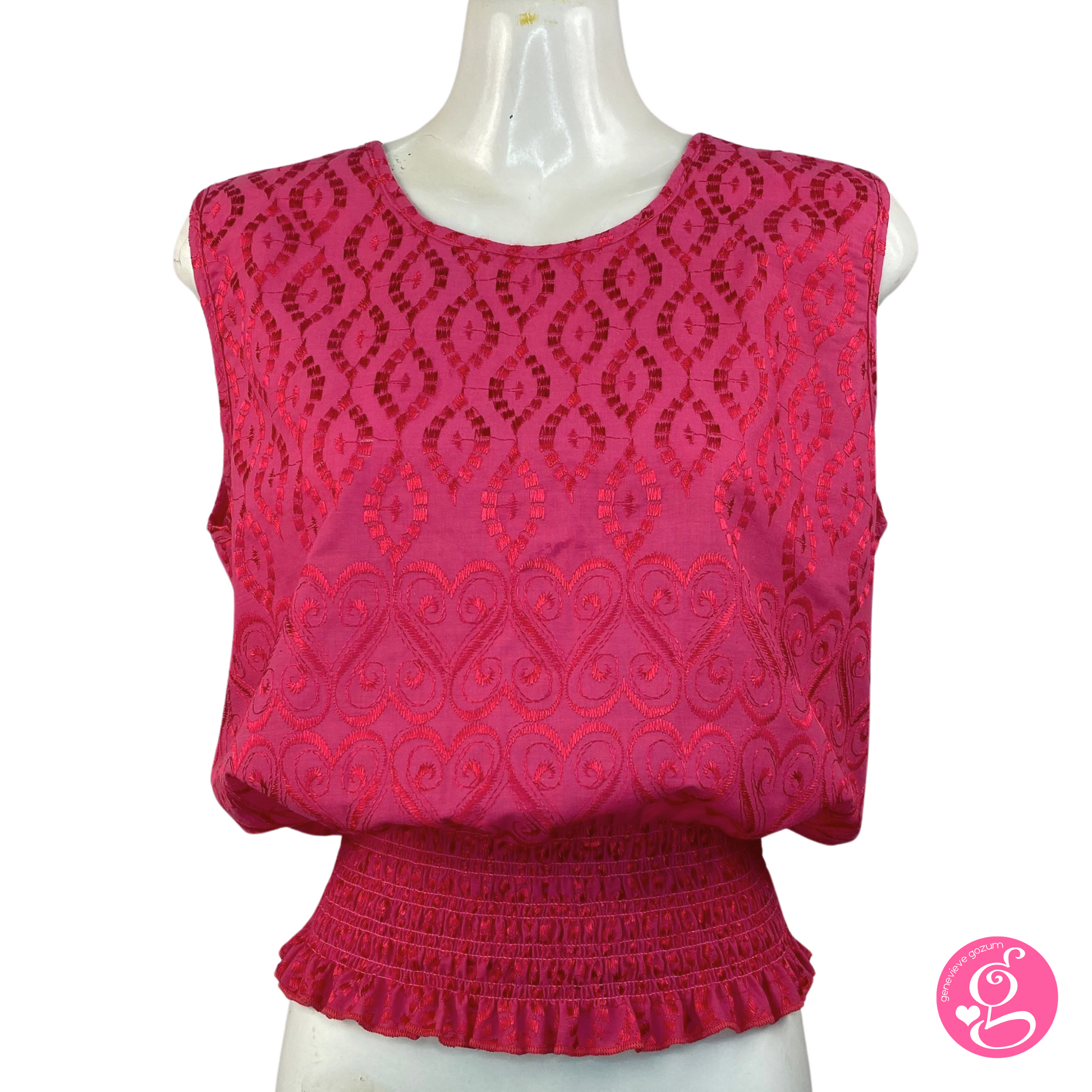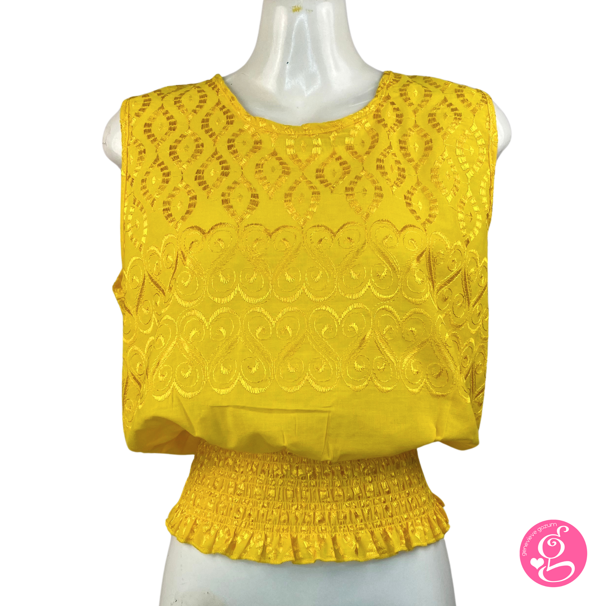 Introducing our fan favorite Genevieve Gozum Cheryl Eyelet Sleeveless Blouse. Made of embroidered cotton eyelet, with a halter style neckline and tie back.