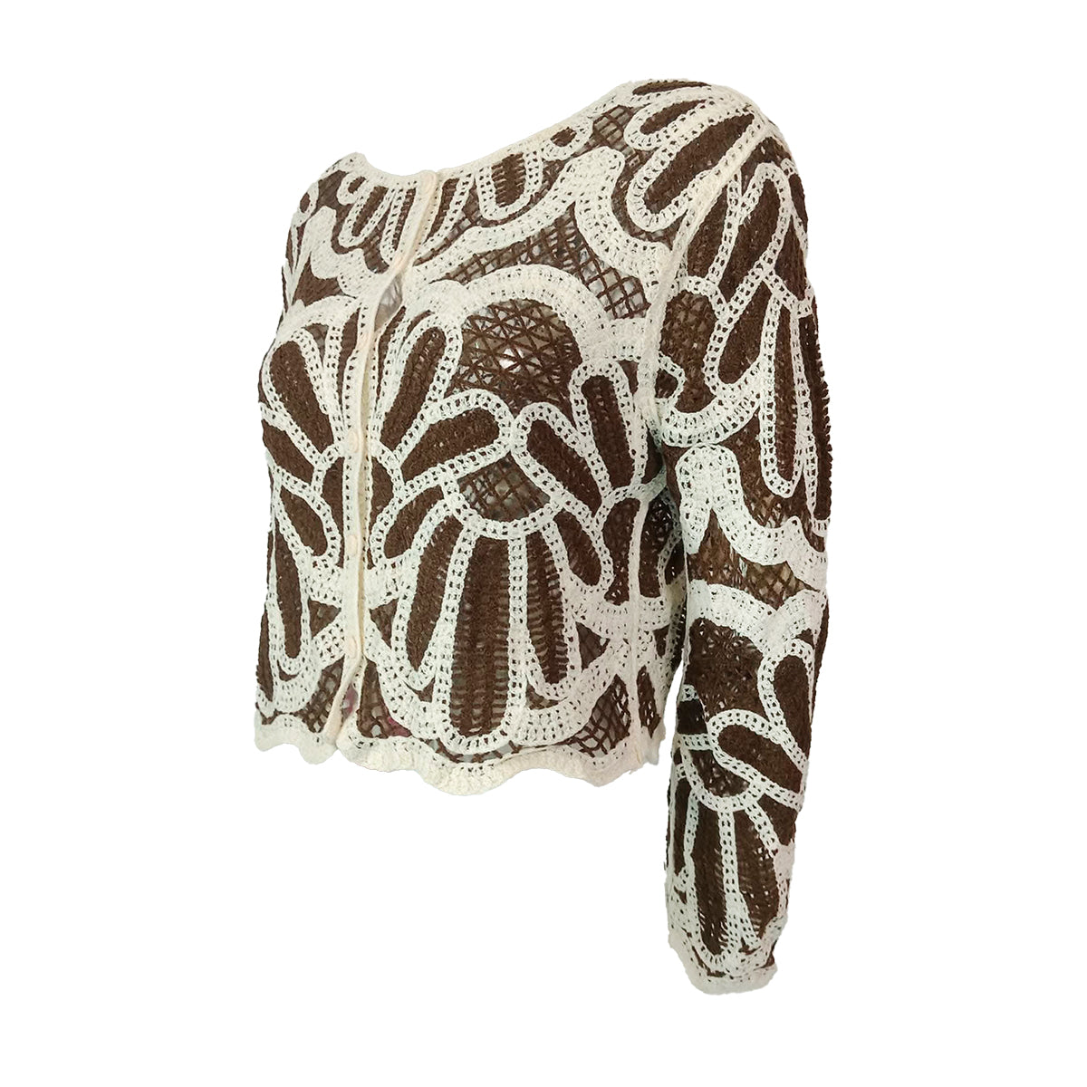 Handcrafted crochet cardigan featuring delicate floral motifs that transitions seamlessly between seasons and occasions. The open-front design and lightweight construction make it ideal as a standalone blouse for warmer days or layered as a sophisticated jacket over your favorite pieces. Intricate stitch work showcases artisanal craftsmanship while the versatile silhouette ensures maximum styling flexibility. Perfect for those who appreciate quality handmade pieces that offer both elegance and practicality.