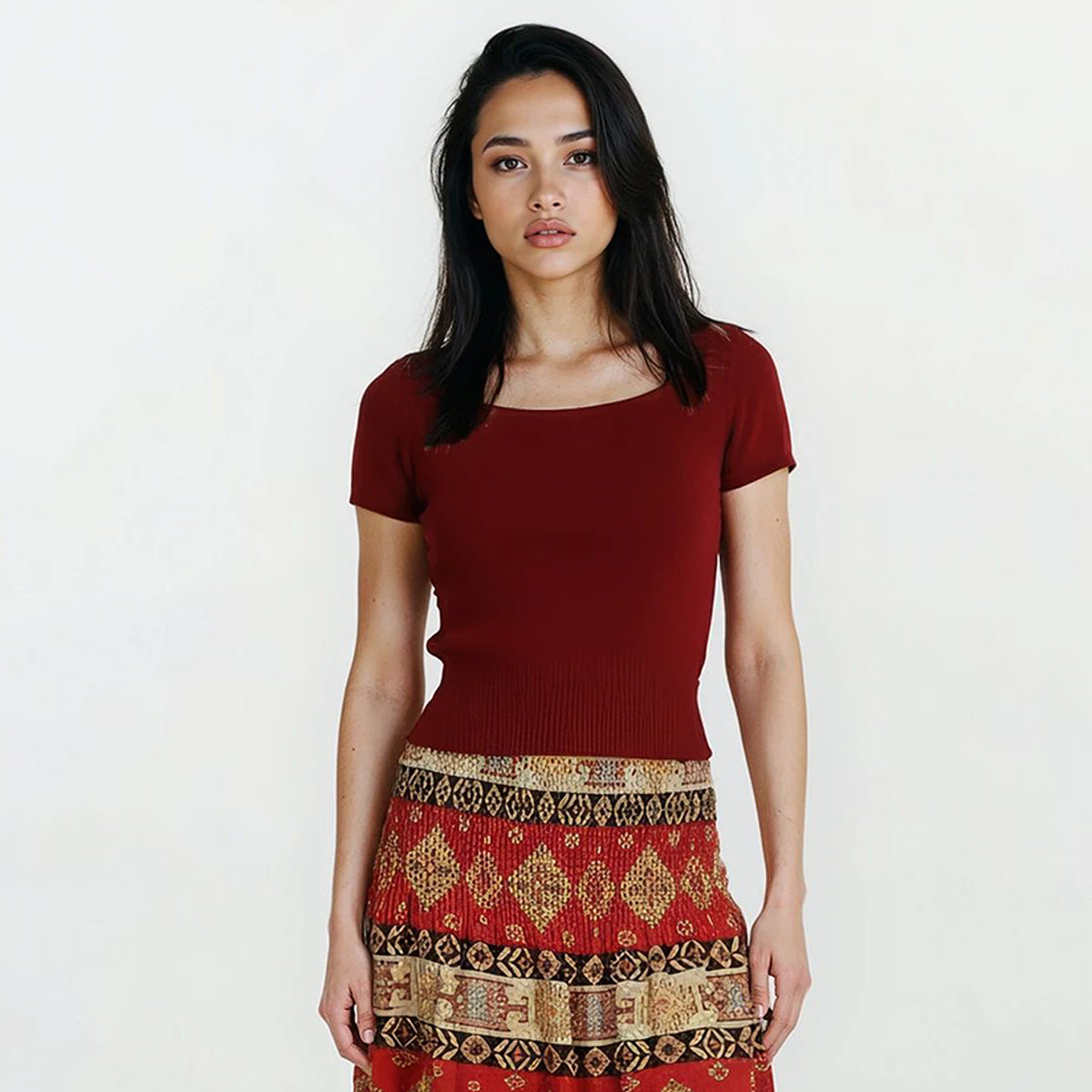 Crafted from premium knit fabric, this square-neck tee delivers exceptional softness and stretch for all-day comfort. The figure-flattering silhouette skims the body without clinging, while the classic square neckline adds timeless sophistication. Versatile enough for casual wear or layering, this essential piece moves with you seamlessly. Perfect for building a wardrobe of reliable basics that feel as good as they look.