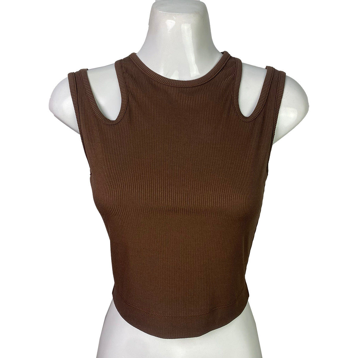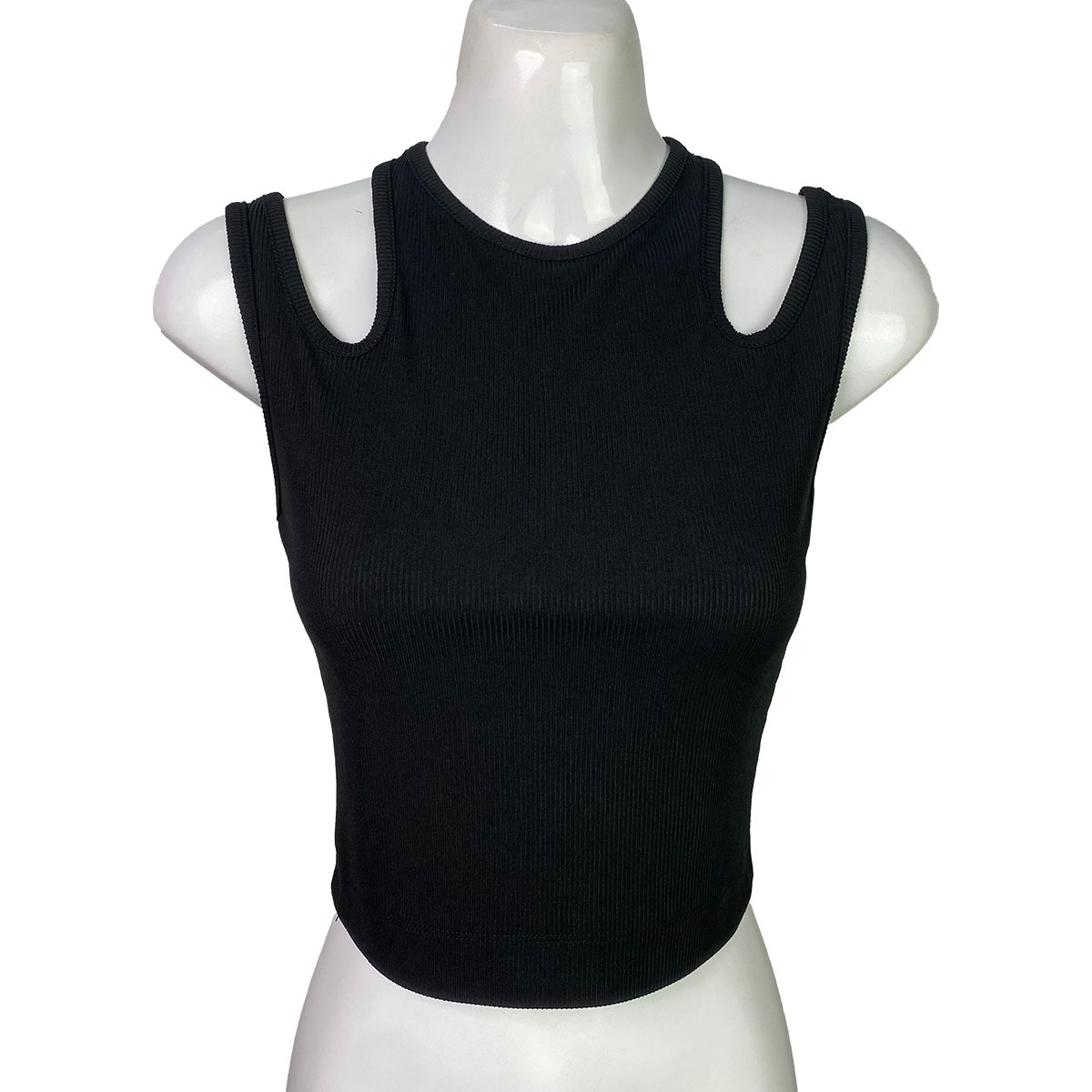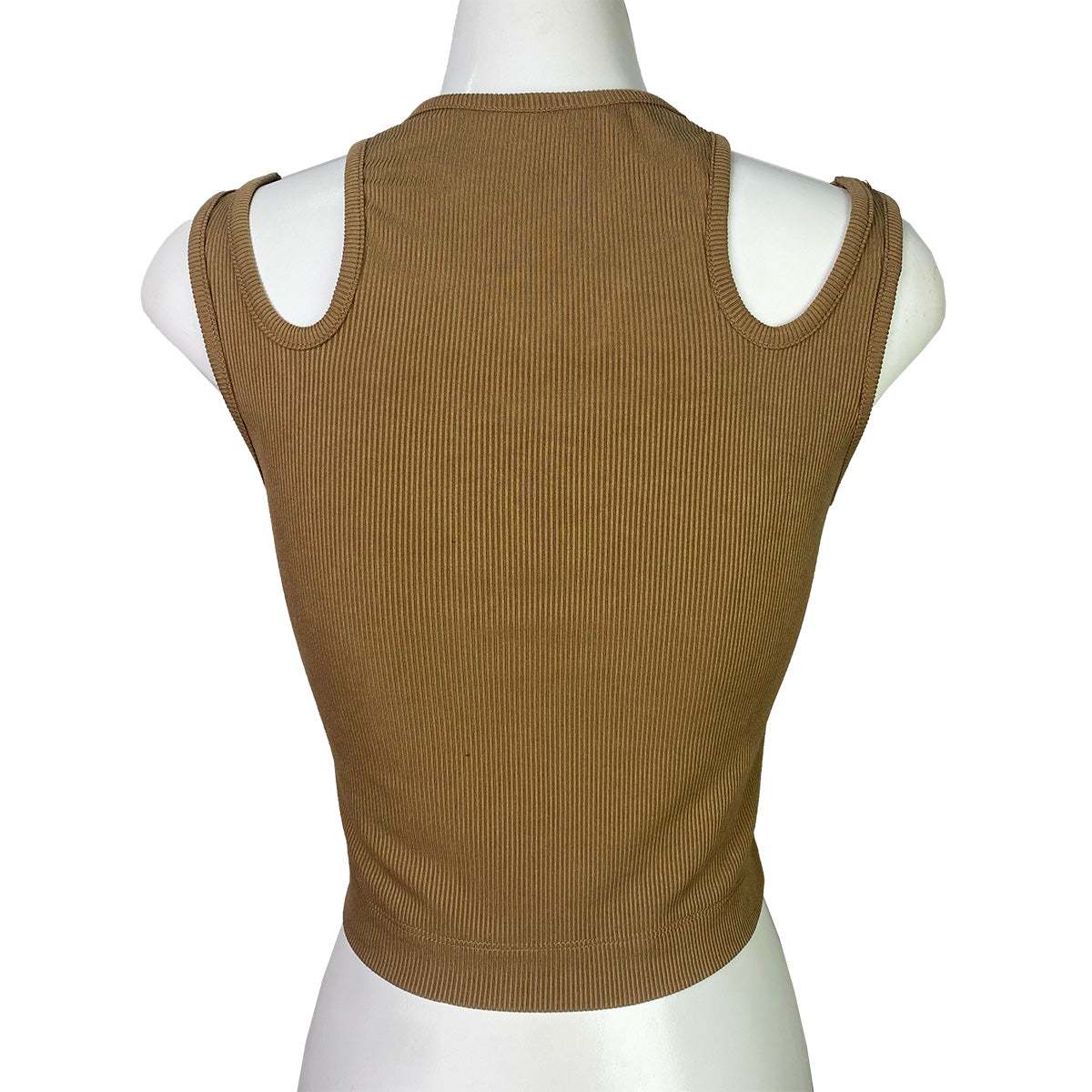 A cut-out tank top crafted from ribbed, stretchable fabric that hugs the figure for a flattering, comfortable fit. Its sleek, minimalist design features a subtle cut-out detail, adding a modern twist to a timeless wardrobe essential. Perfect for layering or wearing solo, this top combines classic simplicity with a unique touch.