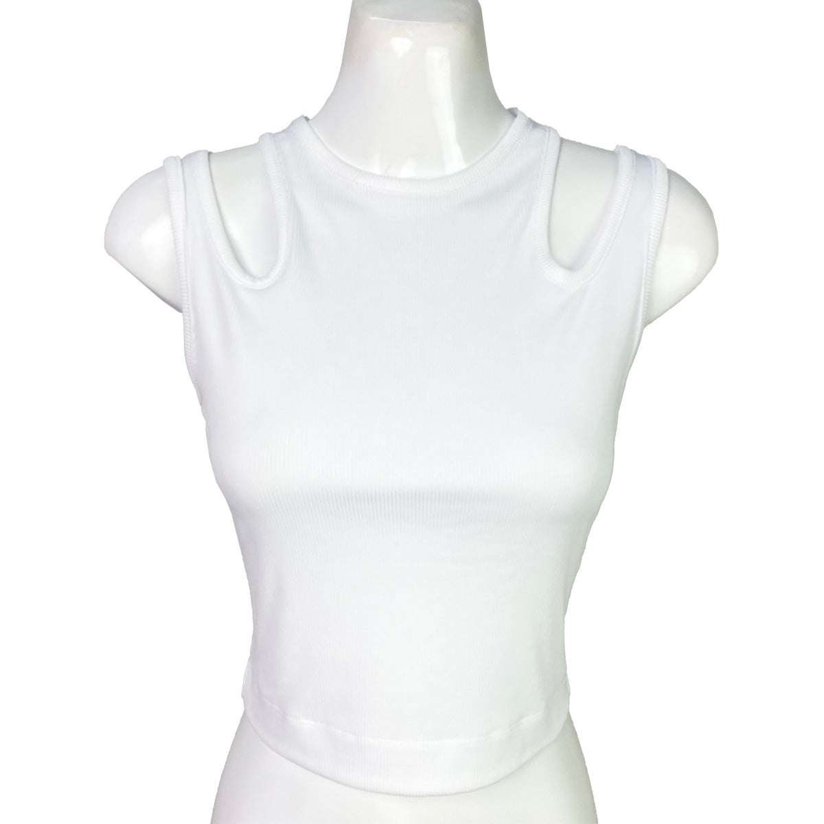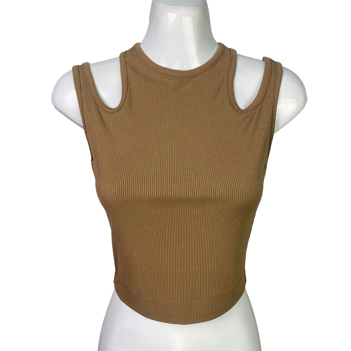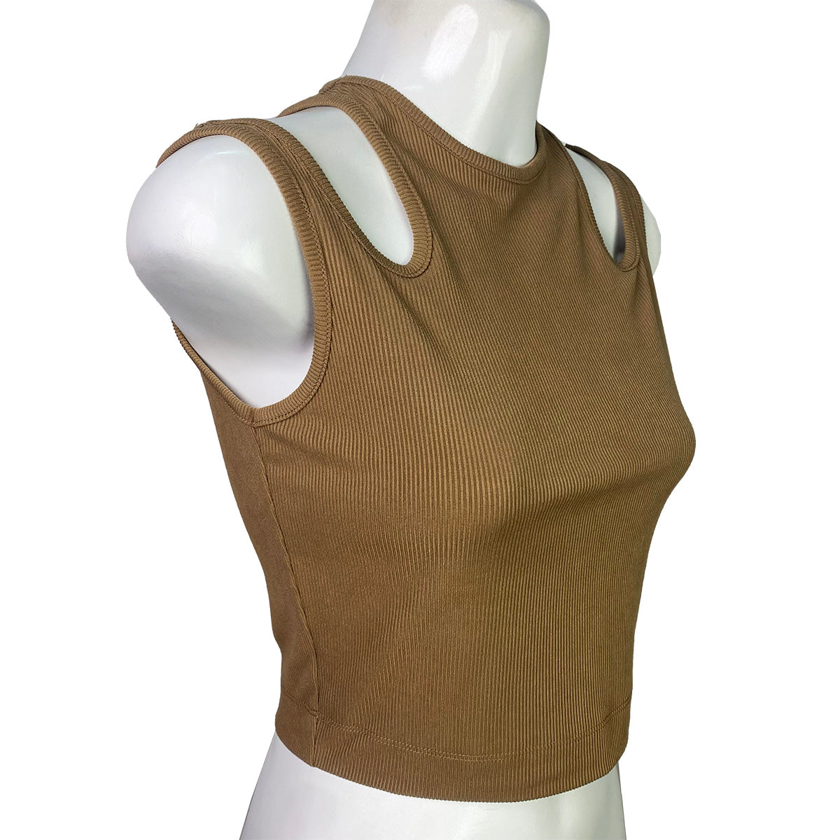A cut-out tank top crafted from ribbed, stretchable fabric that hugs the figure for a flattering, comfortable fit. Its sleek, minimalist design features a subtle cut-out detail, adding a modern twist to a timeless wardrobe essential. Perfect for layering or wearing solo, this top combines classic simplicity with a unique touch.