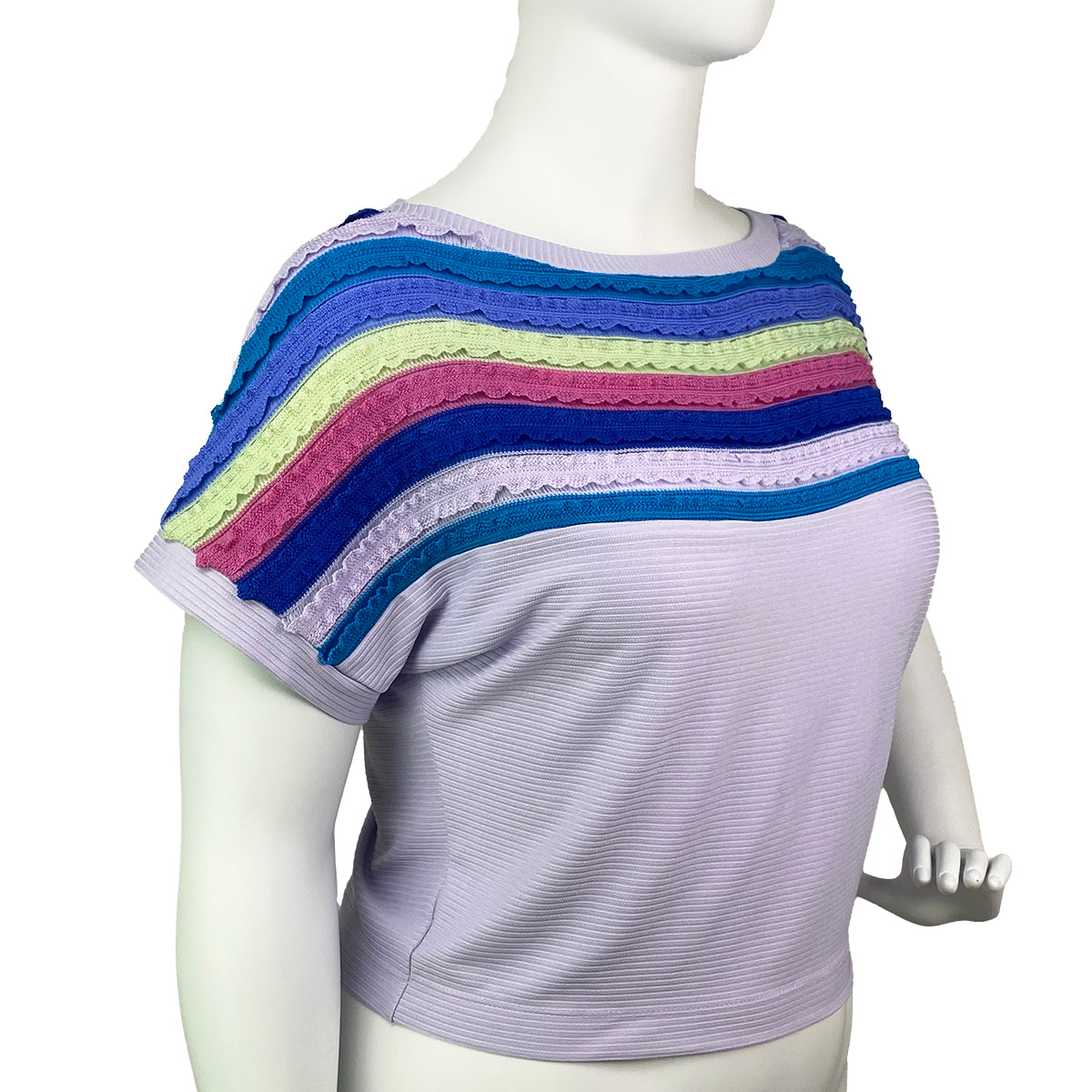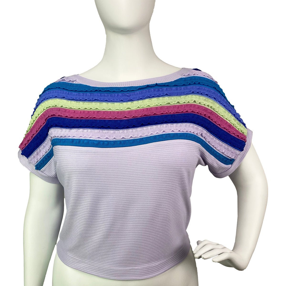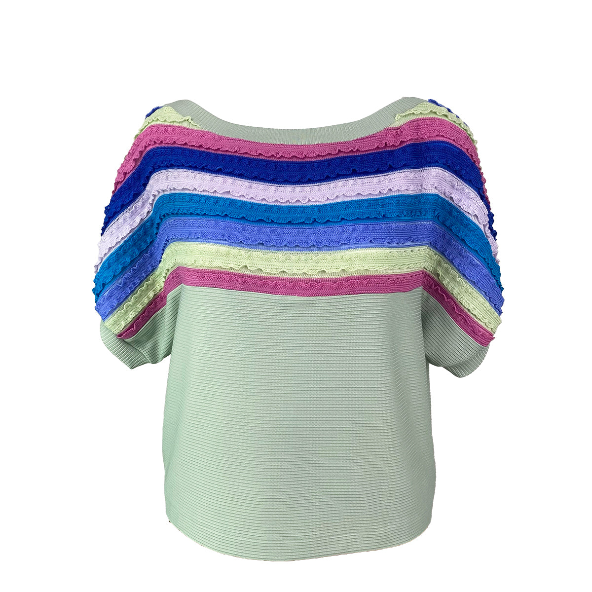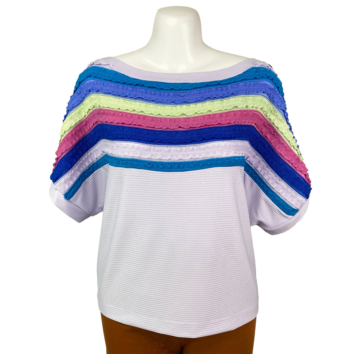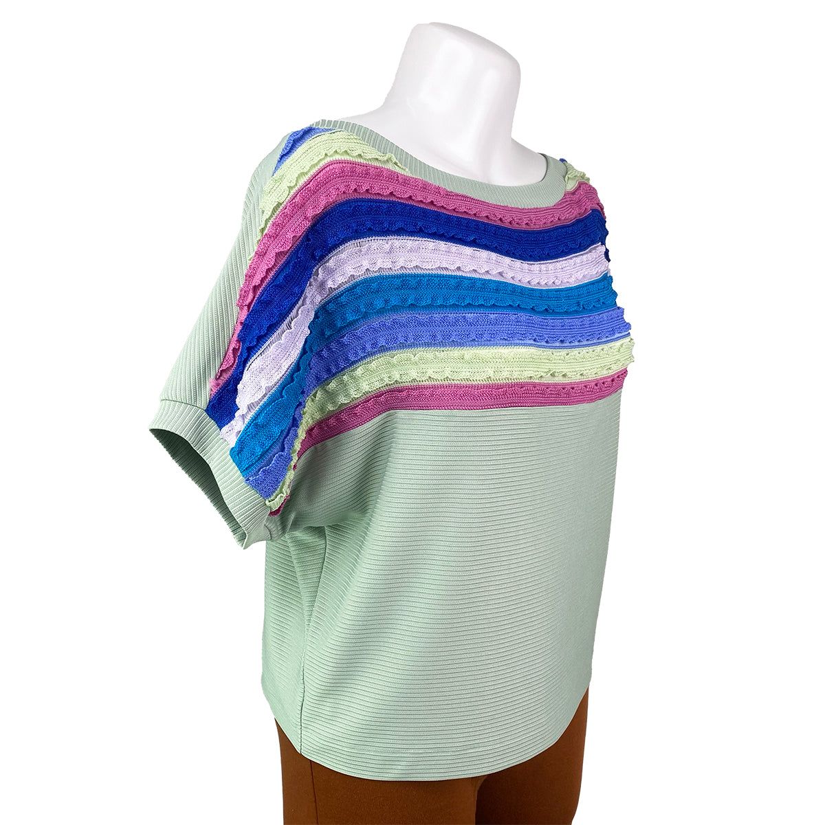 This playful blouse features a slimming dolman cut and extended sleeves adorned with lively stripes. Crafted from a blend of knitted and ribbed fabrics, it offers stretch and comfort in a roomy fit.