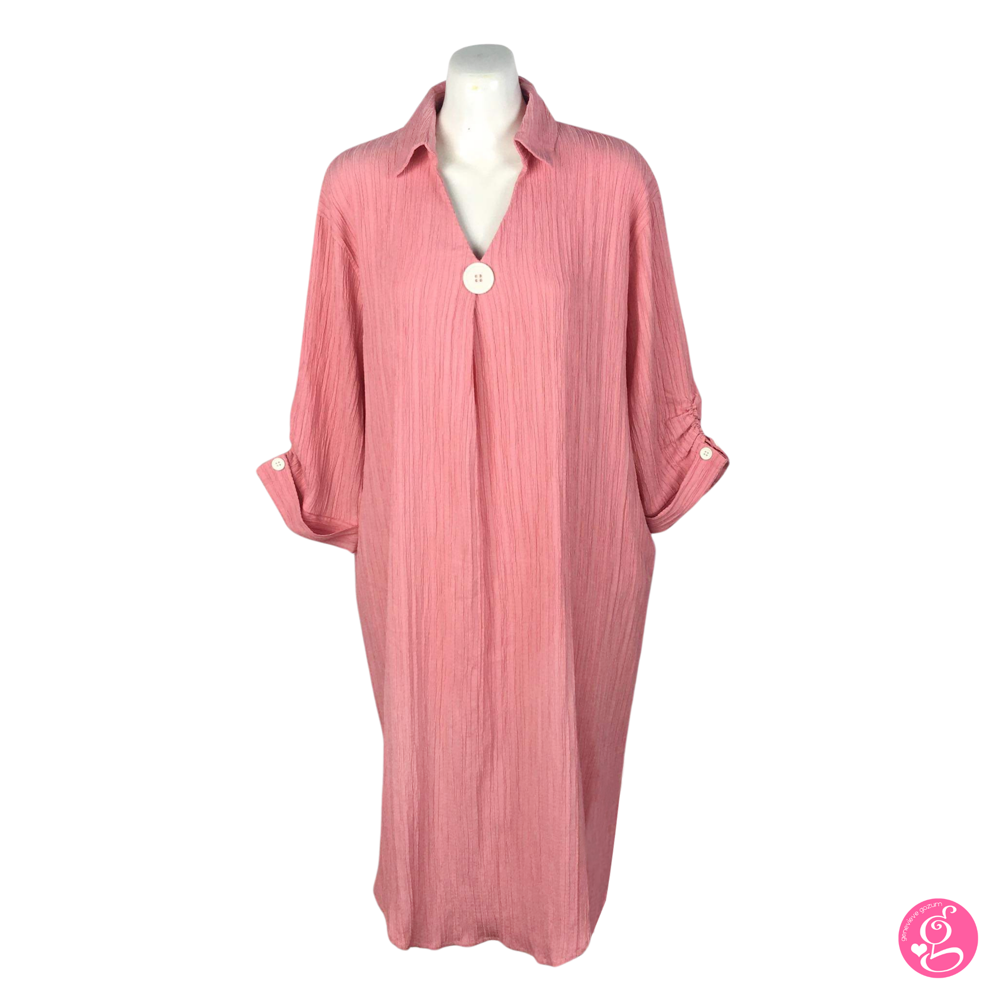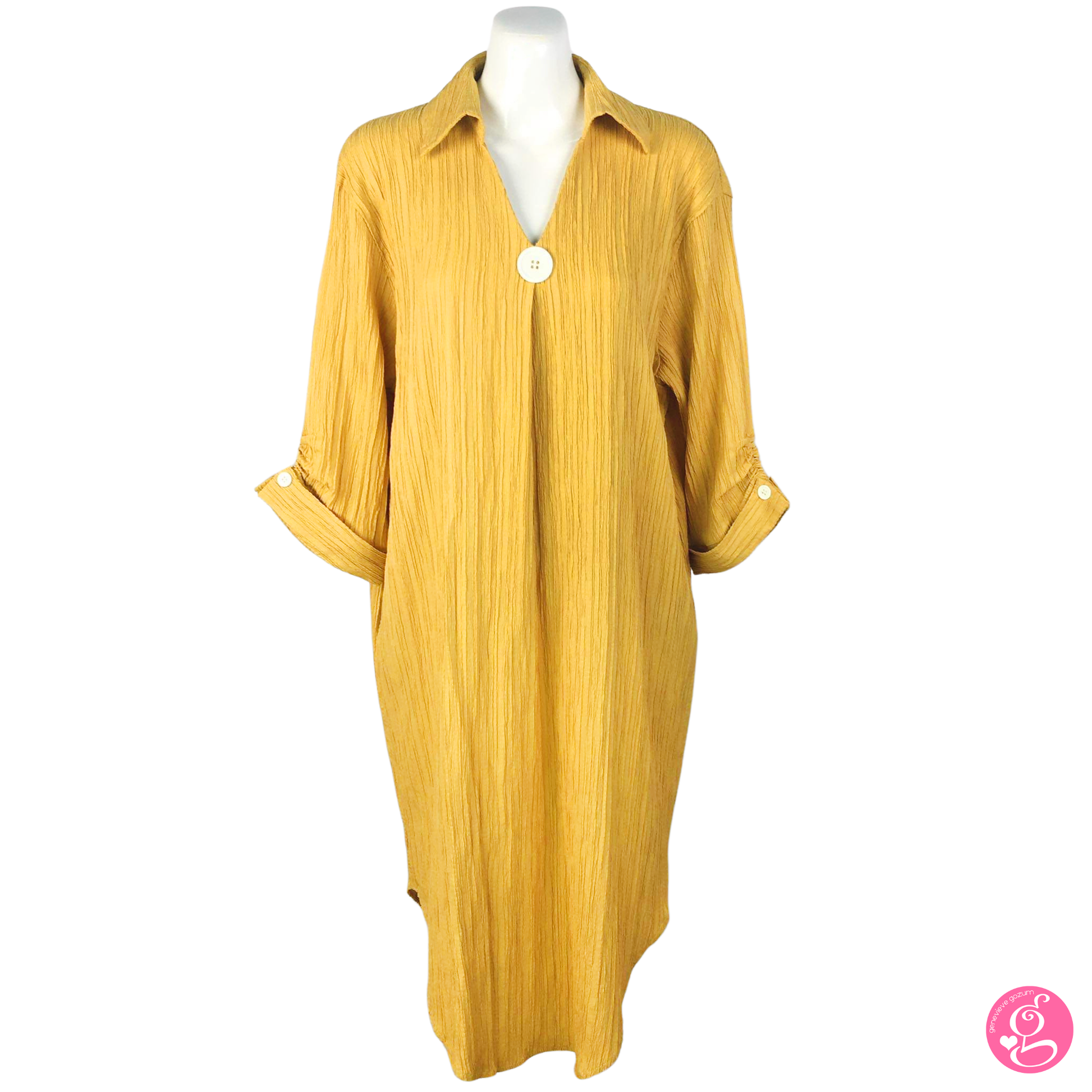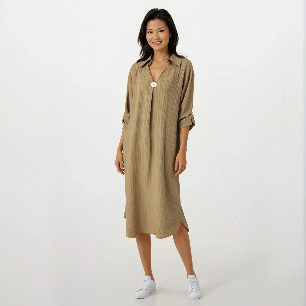 It features a large button centerpiece and cuffed sleeves. Sleeves end below the elbow. The dress has a modern half collar with a V-neckline. The fit is loose and flowy and truly figure friendly.