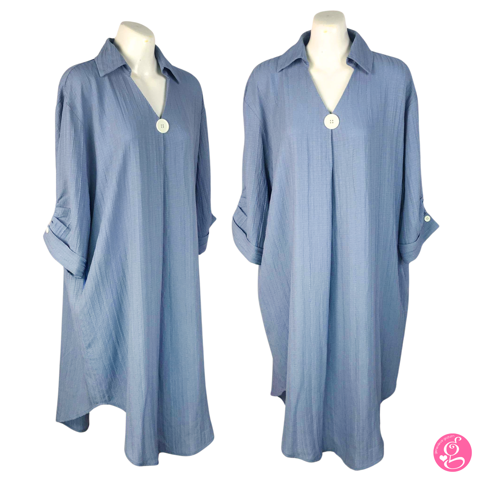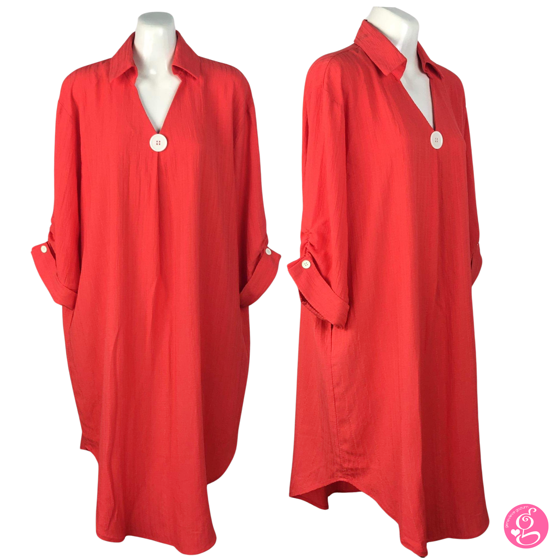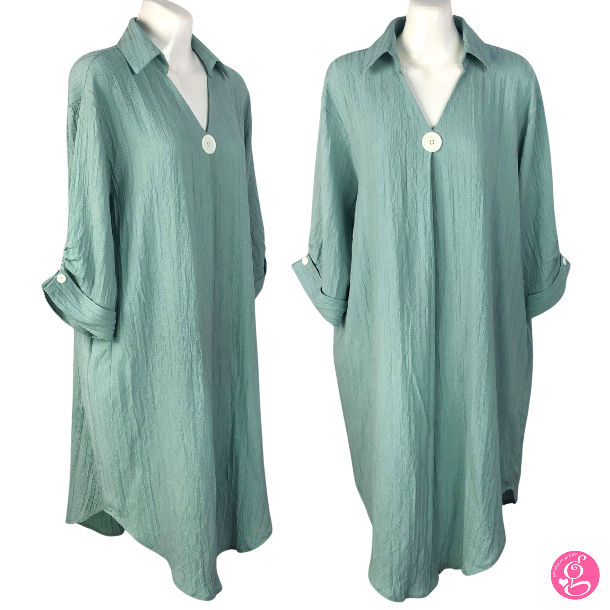 It features a large button centerpiece and cuffed sleeves. Sleeves end below the elbow. The dress has a modern half collar with a V-neckline. The fit is loose and flowy and truly figure friendly.