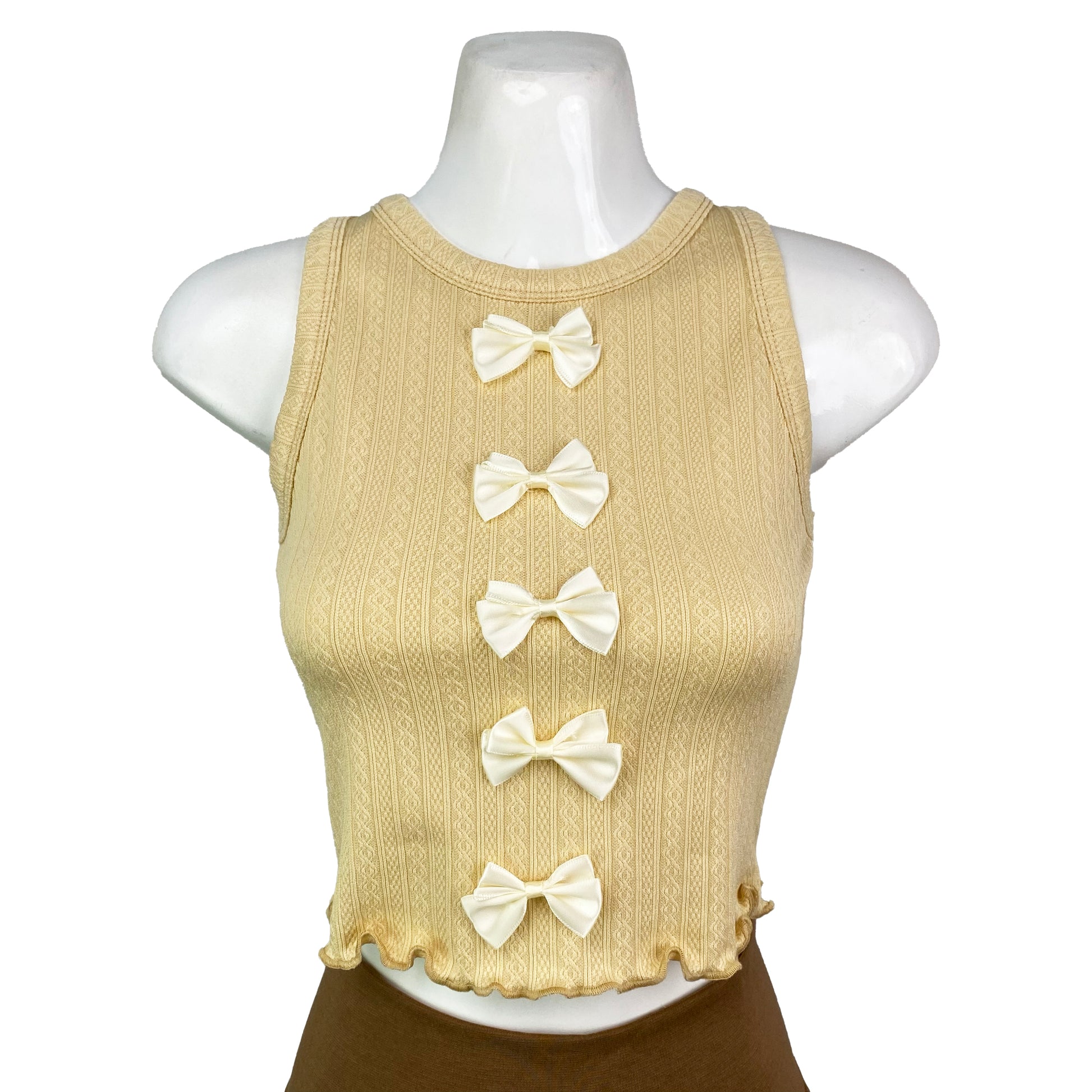 This charming tank top combines effortless comfort with delicate detailing. Crafted from a lightweight, breathable fabric, it feels soft against the skin and offers just the right amount of stretch for a flattering, flexible fit. The surface features a classic cable knit pattern, adding texture and a cozy, handcrafted look. Designed to stand out, the tank is adorned with five decorative bows—tastefully placed to enhance its feminine charm. Perfect for layering or wearing on its own, this piece effortlessly bridges casual and chic.