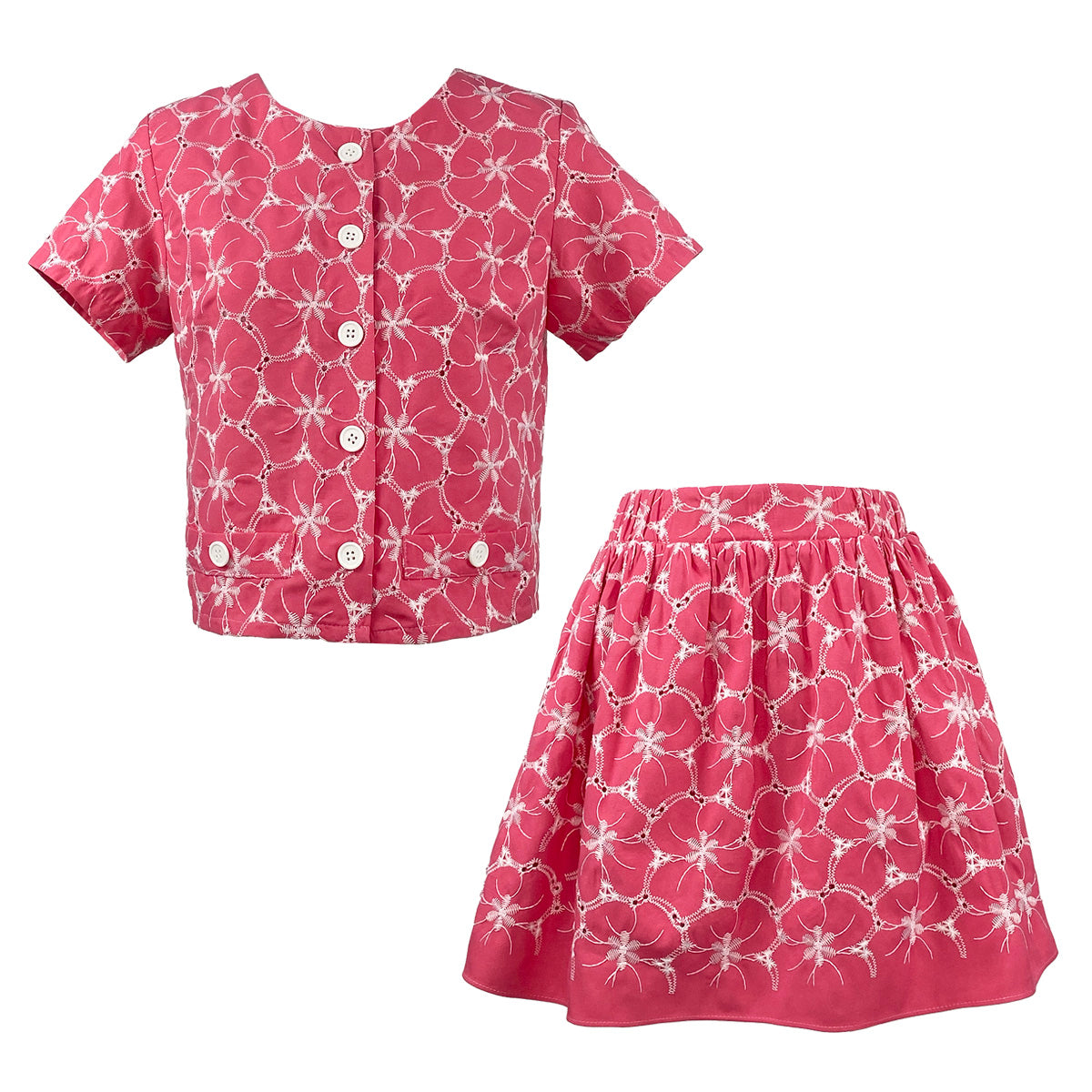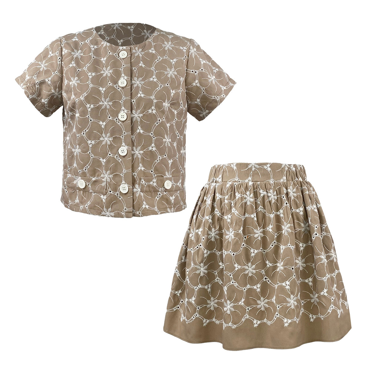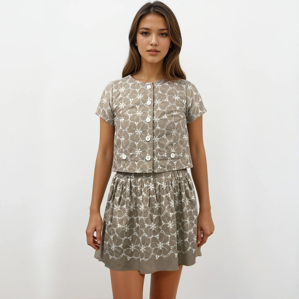 This eyelet cotton set features a button-down top adorned with delicate embroidered flowers, versatile enough to wear as a blouse or a lightweight cardigan. Its breathable fabric and intricate detailing make it an elegant layering piece. The matching mini skirt complements the top perfectly and can also be styled with other favorite shirts, offering flexible outfit options for a refined, coordinated look.