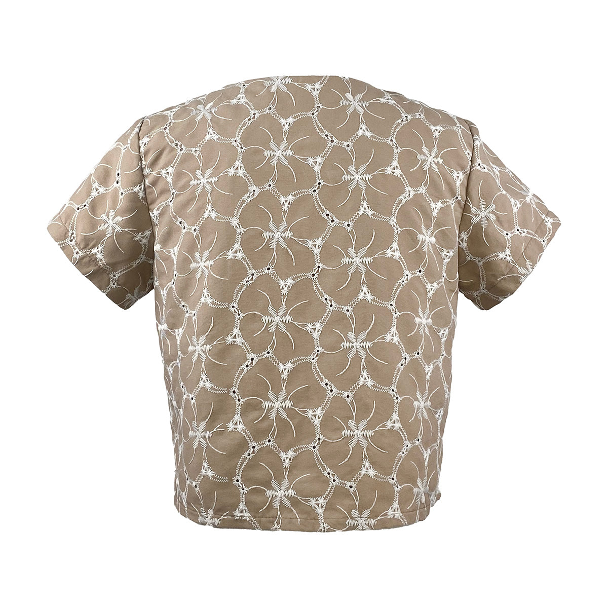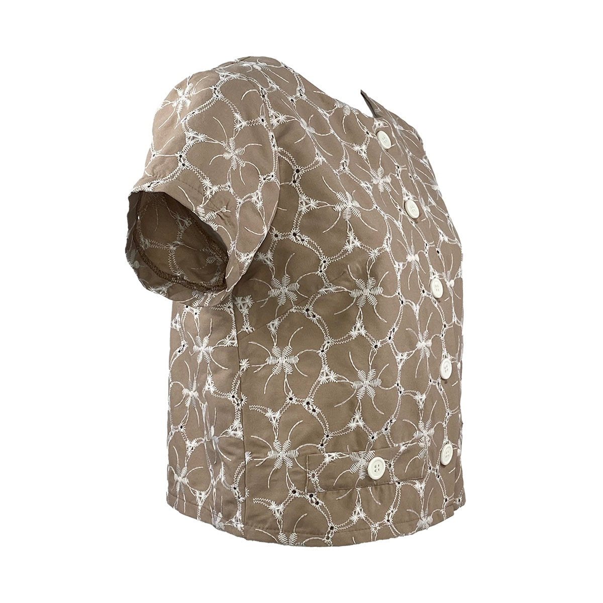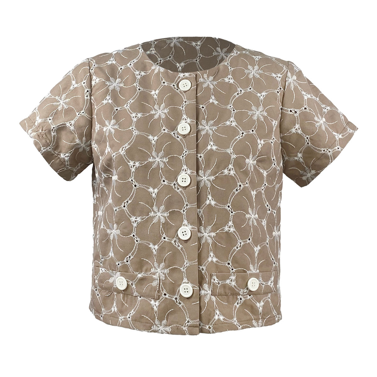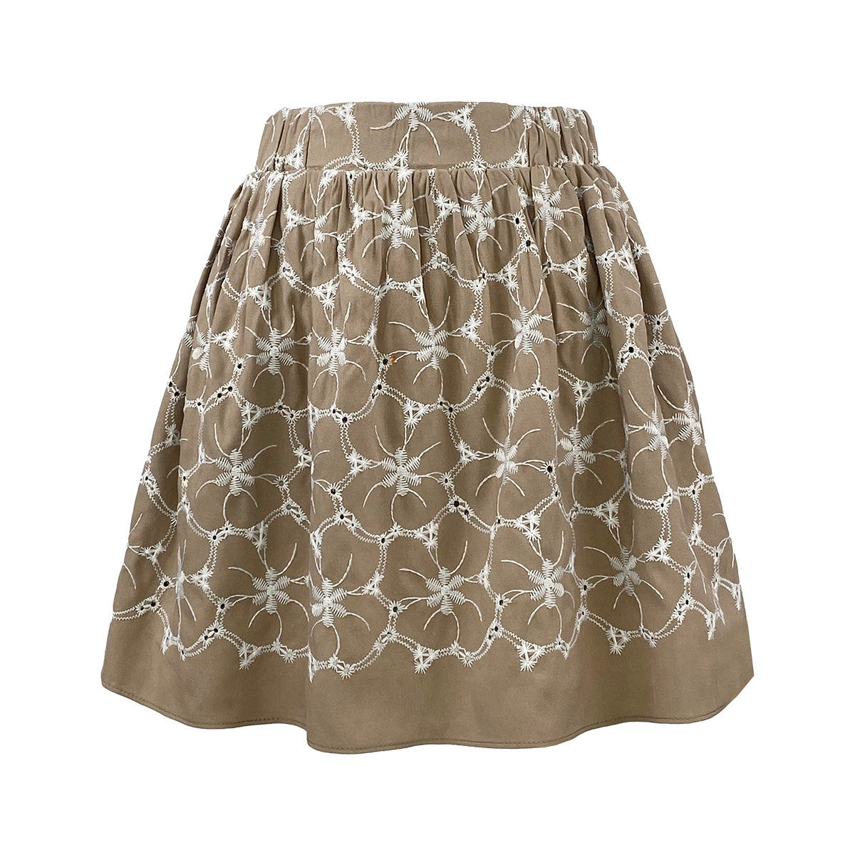 This eyelet cotton set features a button-down top adorned with delicate embroidered flowers, versatile enough to wear as a blouse or a lightweight cardigan. Its breathable fabric and intricate detailing make it an elegant layering piece. The matching mini skirt complements the top perfectly and can also be styled with other favorite shirts, offering flexible outfit options for a refined, coordinated look.