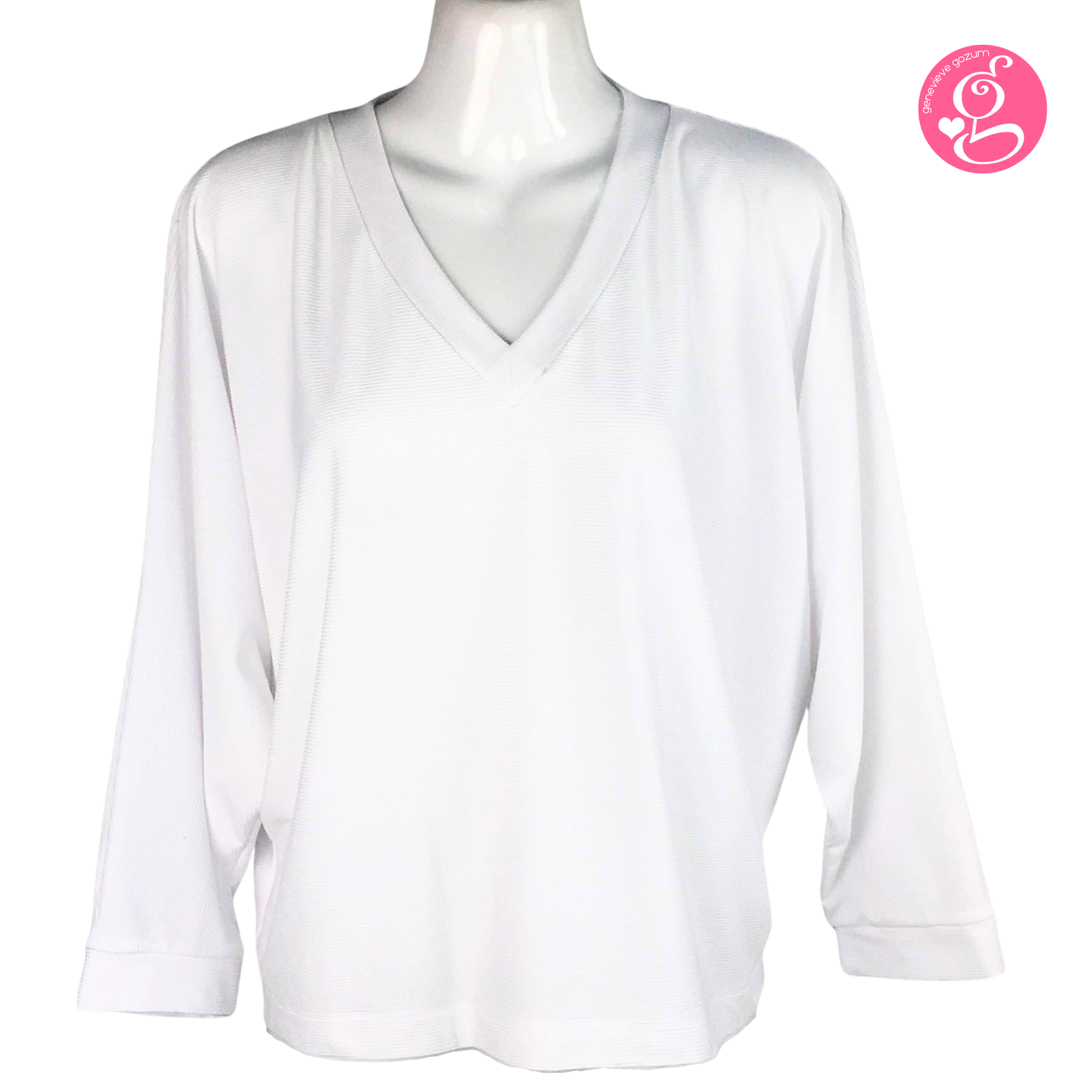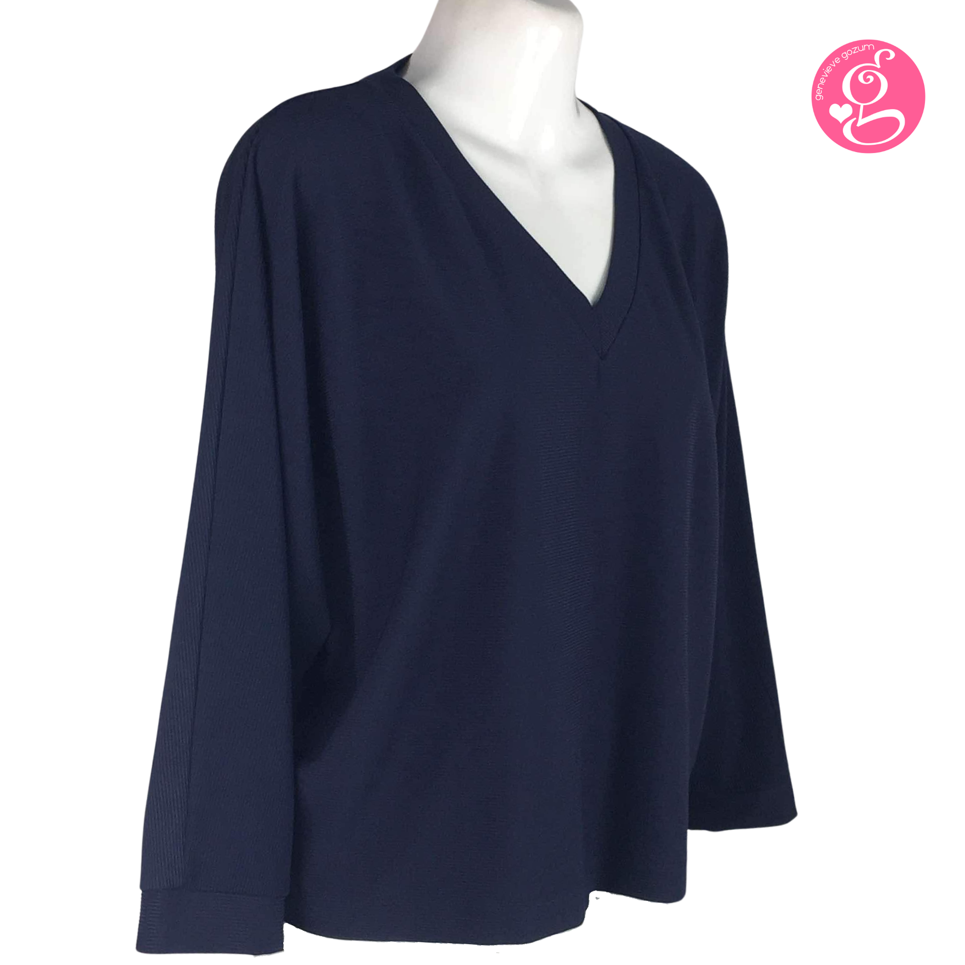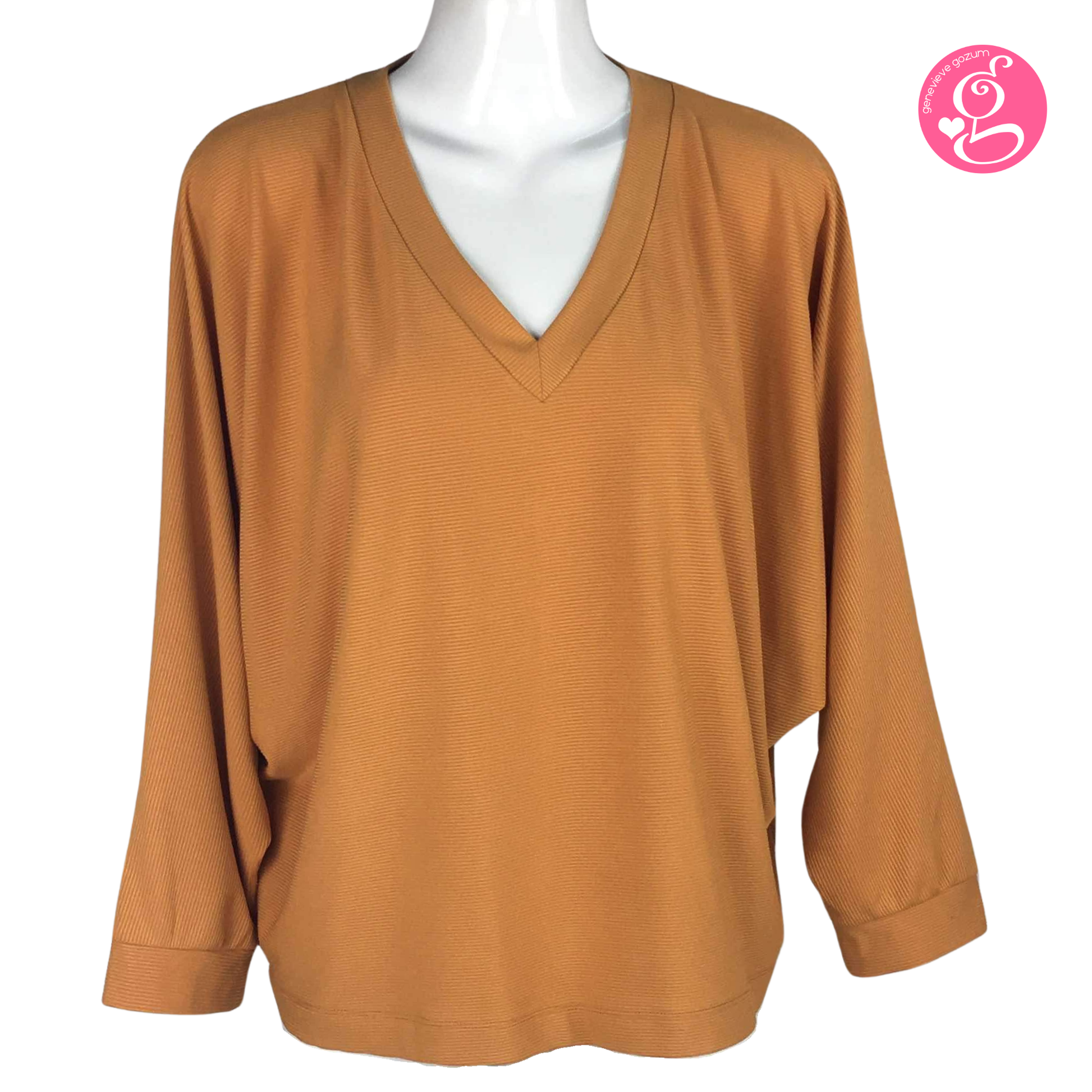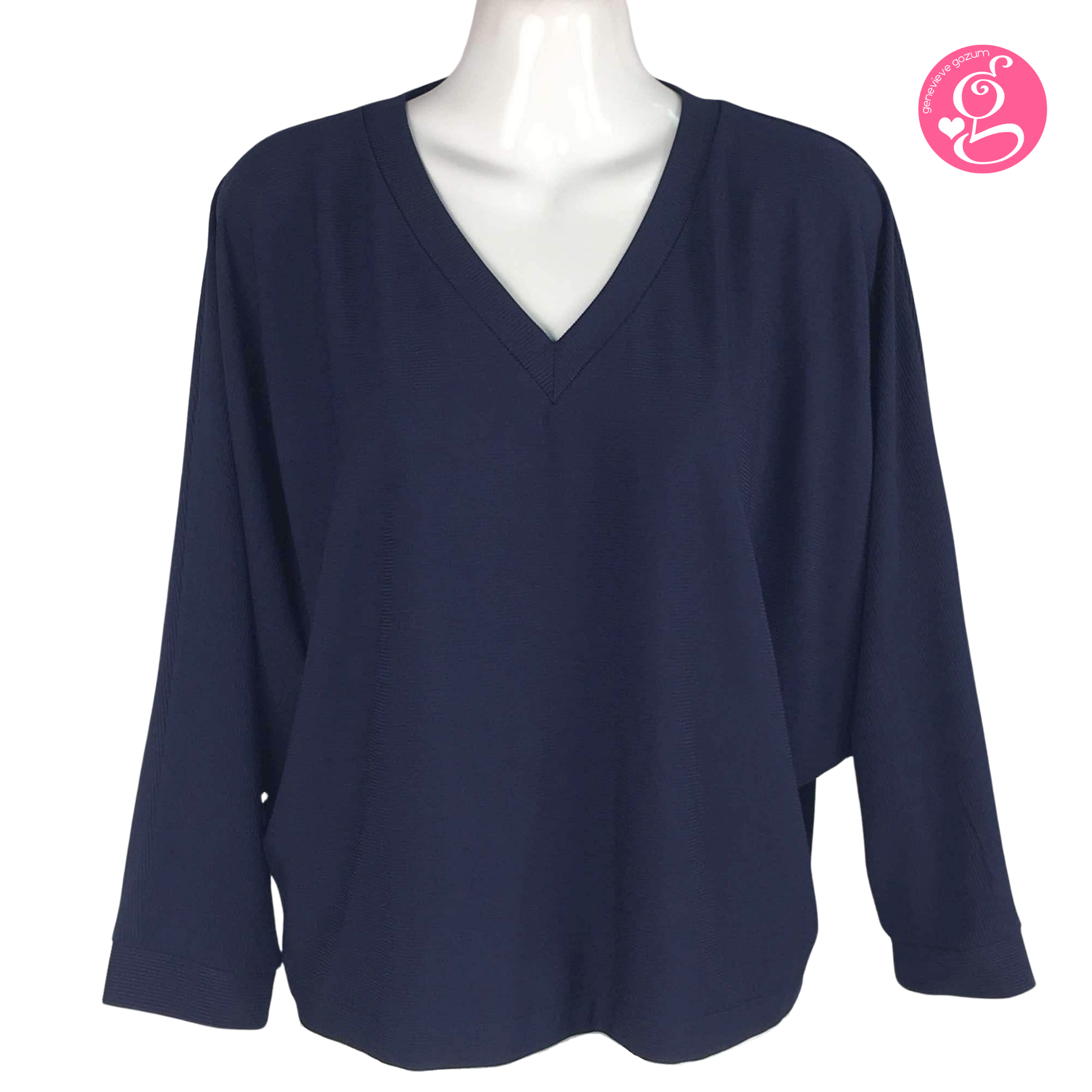 Elevate your wardrobe with the V-neck dolman blouse from Genevieve Gozum, the V-neck version of our best-selling pullover. This stylish blouse features trendy 3/4 length dolman sleeves that add a touch of sophistication to any outfit. Crafted from soft and comfortable cotton spandex, it offers a perfect blend of stretch and ease, making it a versatile piece you'll reach for again and again.