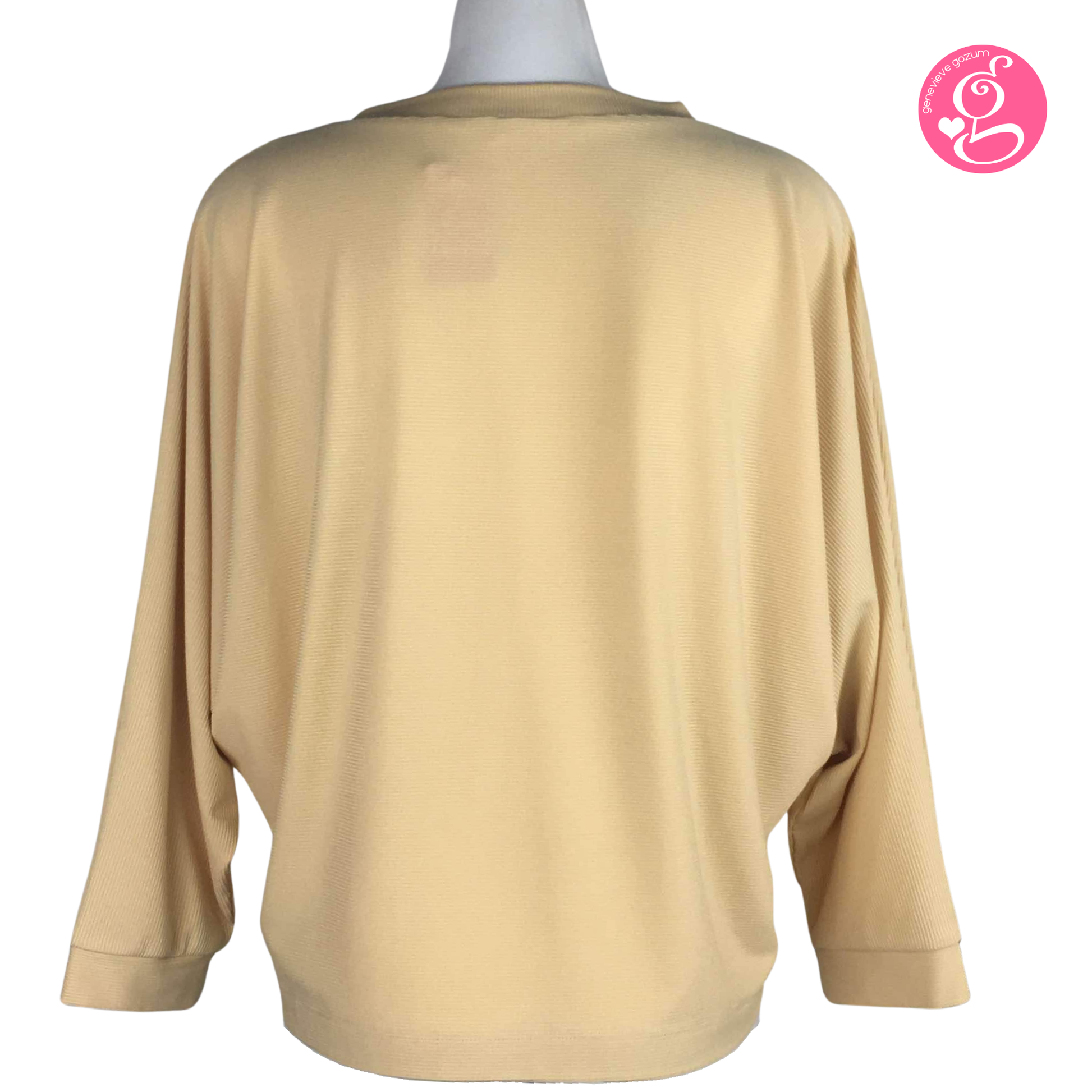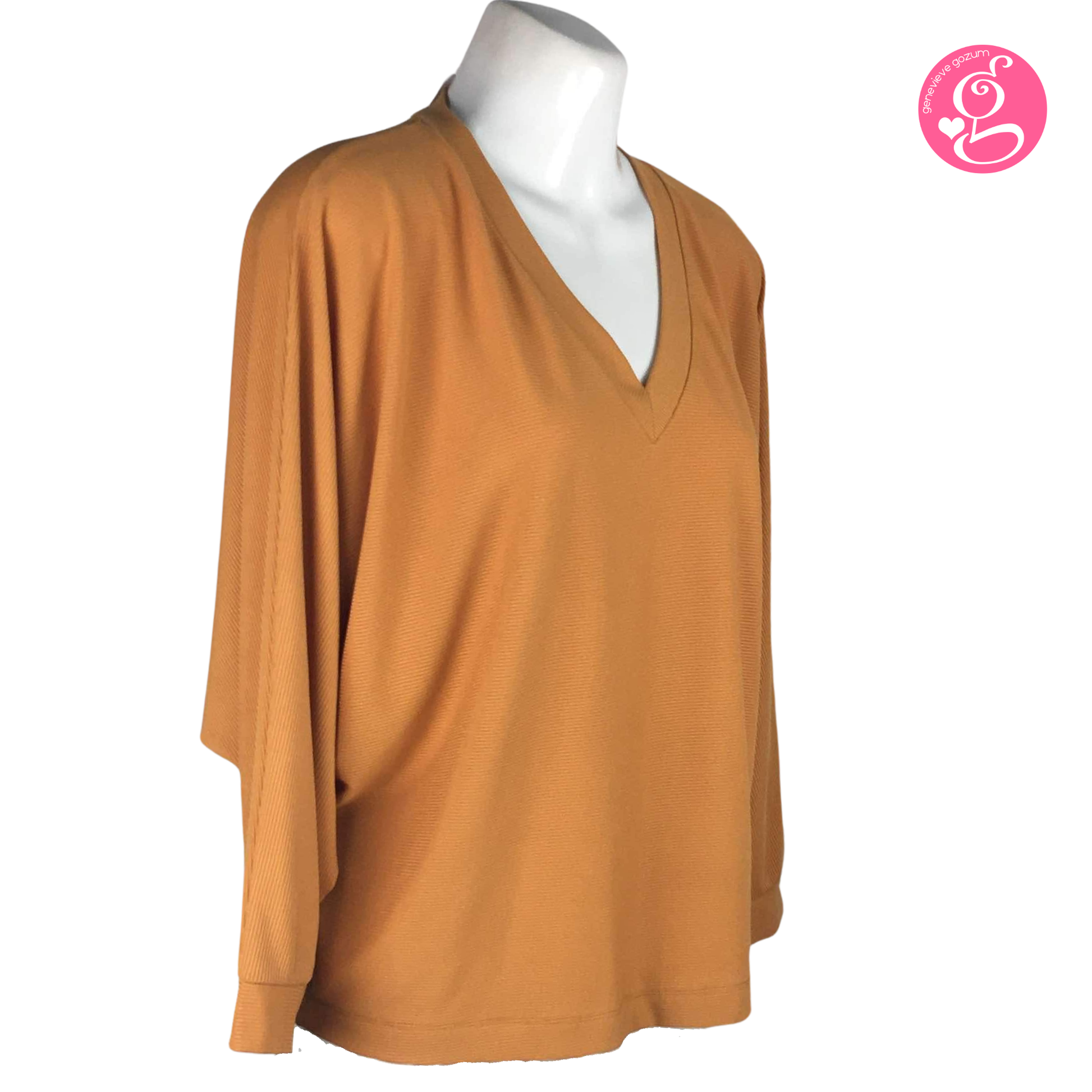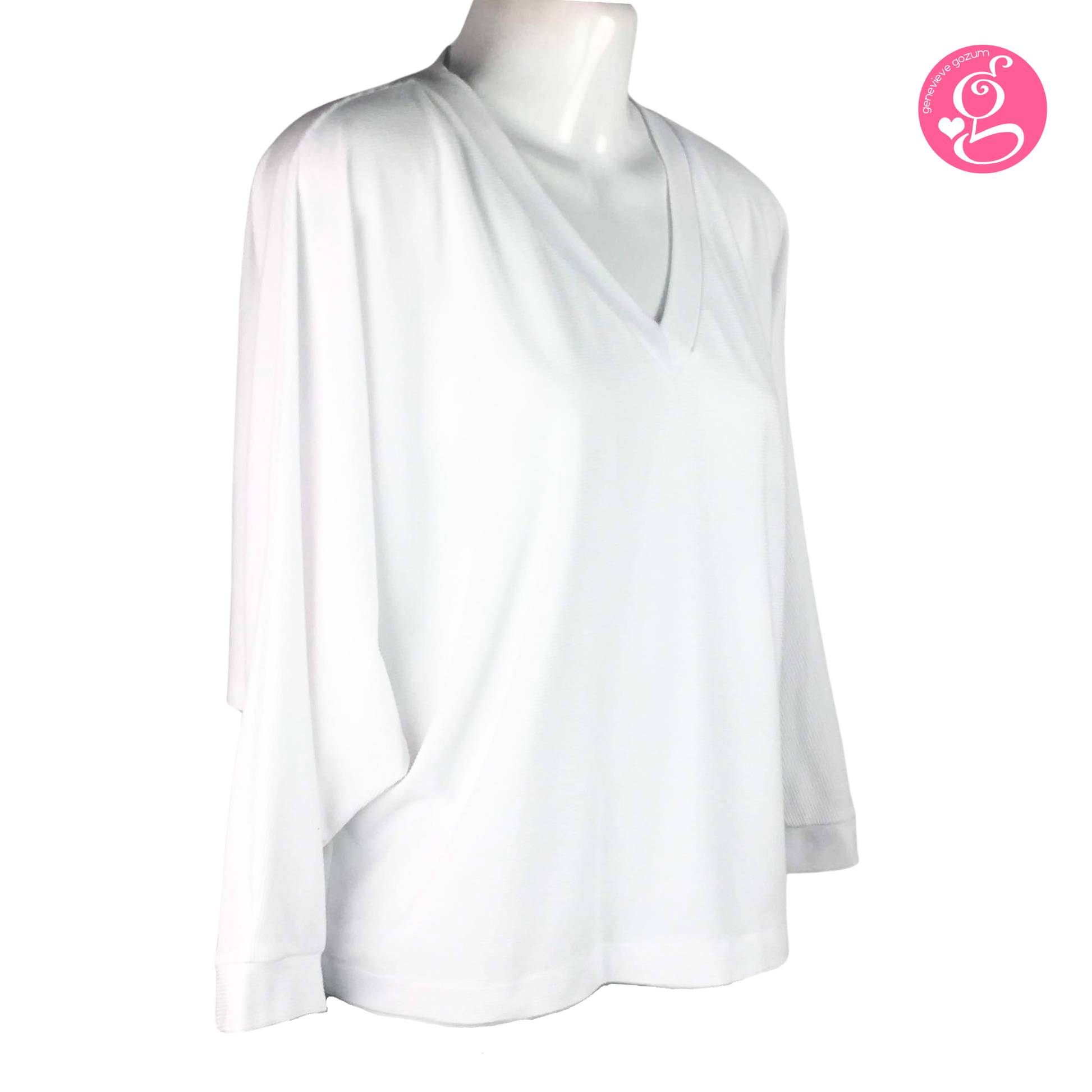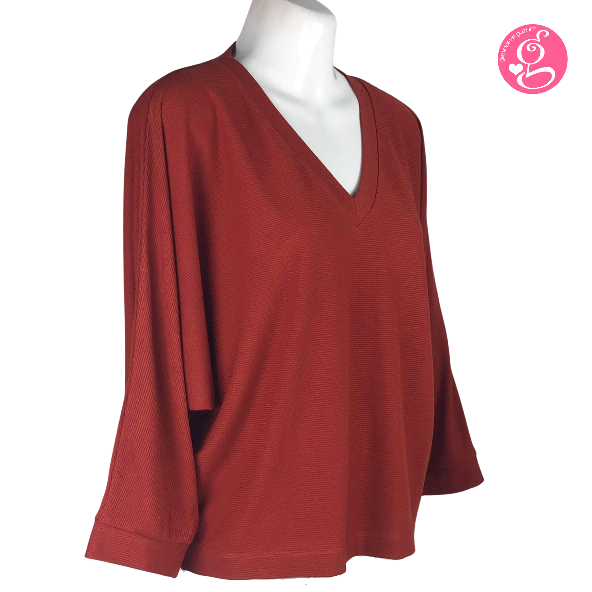 Elevate your wardrobe with the V-neck dolman blouse from Genevieve Gozum, the V-neck version of our best-selling pullover. This stylish blouse features trendy 3/4 length dolman sleeves that add a touch of sophistication to any outfit. Crafted from soft and comfortable cotton spandex, it offers a perfect blend of stretch and ease, making it a versatile piece you'll reach for again and again.