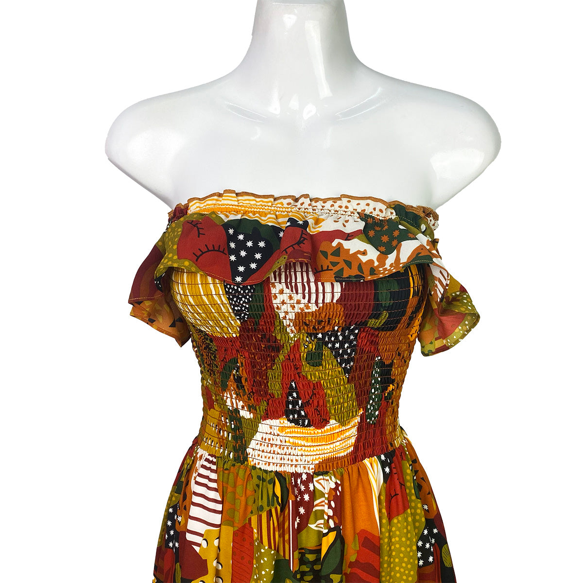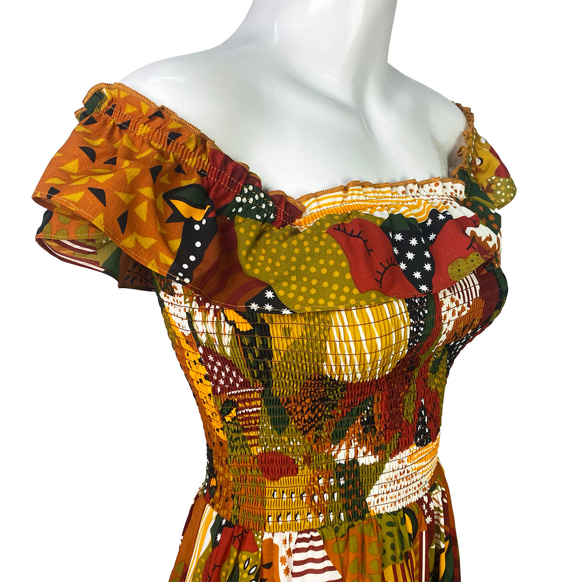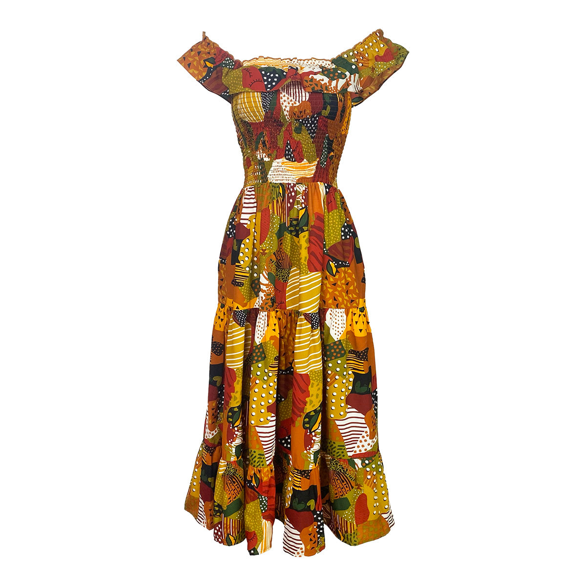 The Giselle long dress features earthy tone prints, a smocked bodice for a flattering fit, and versatile multiway off-shoulder ruffles. Its figure-friendly design makes it perfect for any occasion, combining comfort and elegance effortlessly.