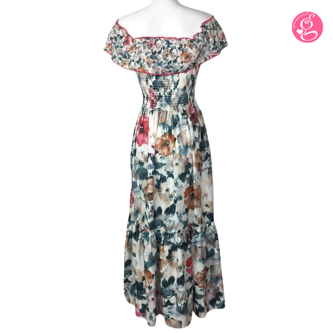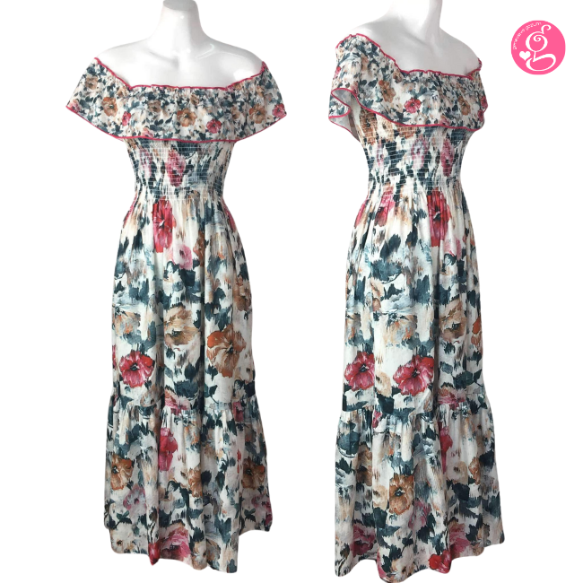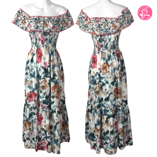 Introducing the epitome of effortless elegance: the Genevieve Gozum Giselle Maxi Dress in Floral Green & Red Print. Crafted from a light and airy fabric, this dress is the perfect companion for warm weather days, offering both style and comfort in one stunning package.