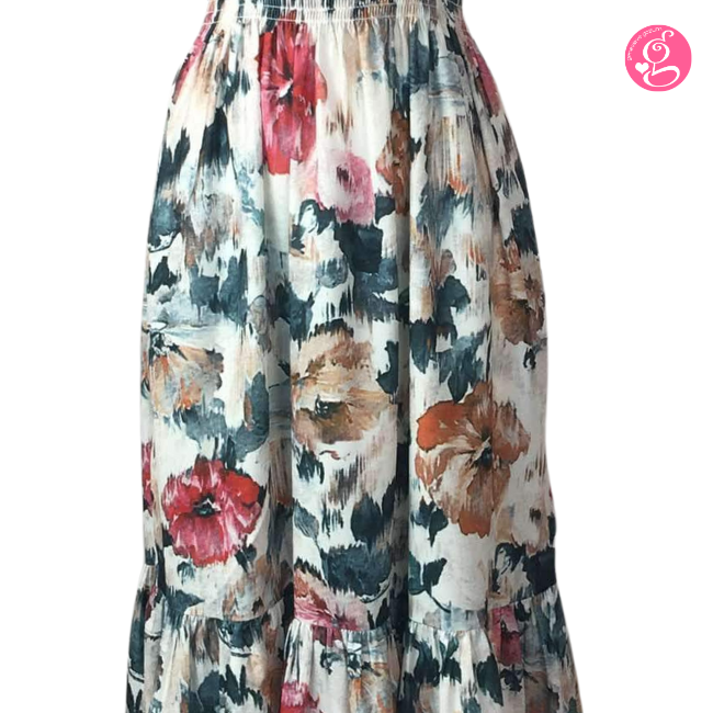 Featuring a captivating print in rich green and red tones as well as and blue tones, this dress is a true work of art that adds a touch of elegance and style to any wardrobe. The intricate printing detail ensures that each dress is unique, making it a standout piece that will turn heads wherever you go.