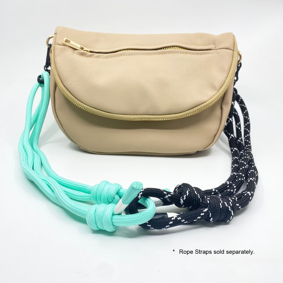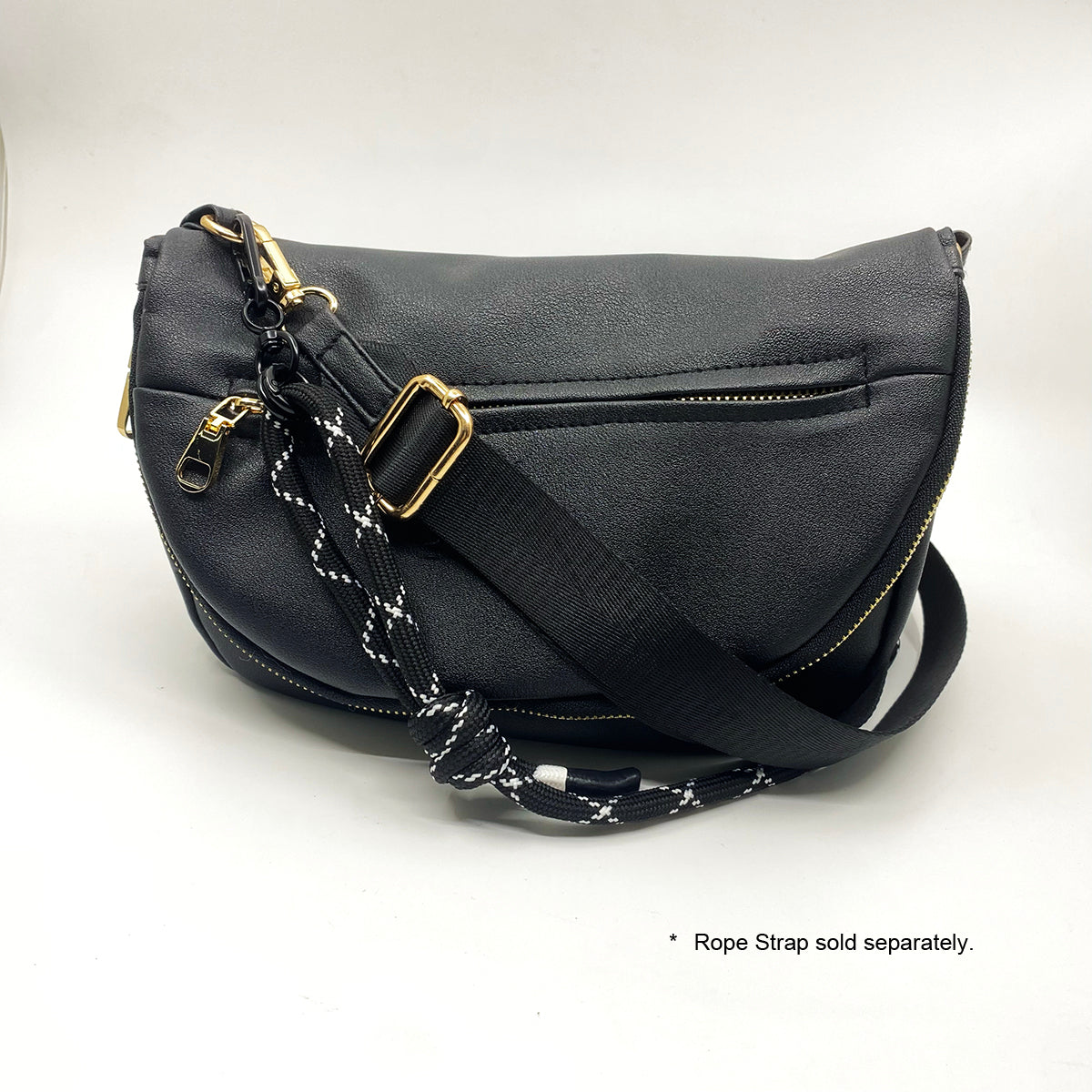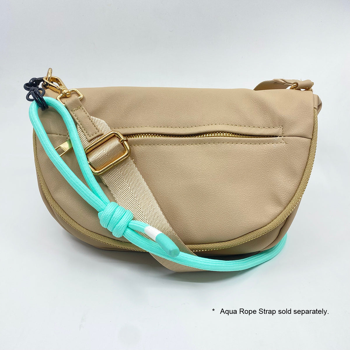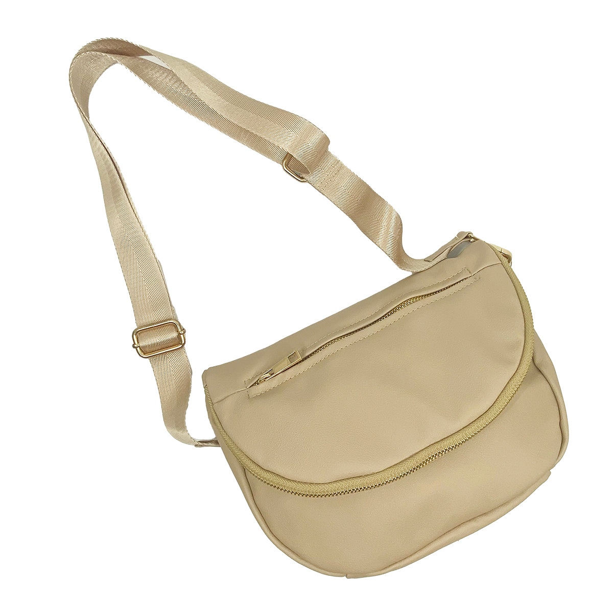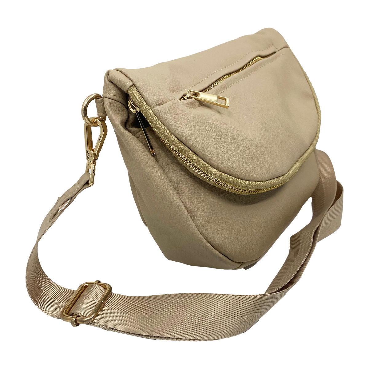 This beige half-moon bag features a sleek silhouette, gold hardware, a top zip pocket, and an adjustable strap for easy, everyday style. Soft, structured, and effortlessly cool — your go-to for on-the-go days.