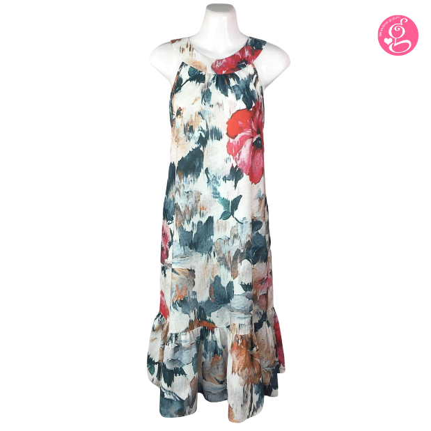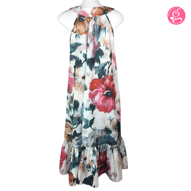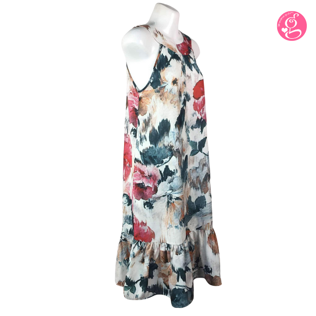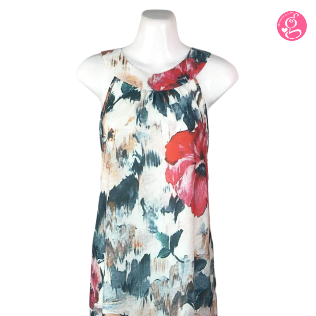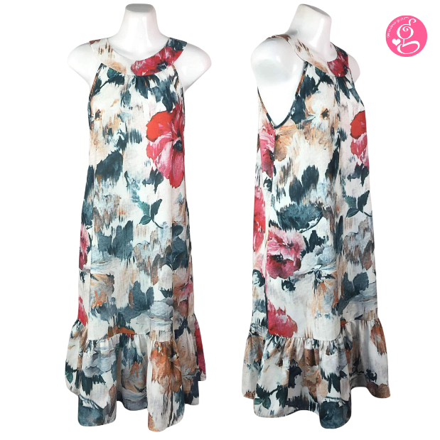 The Genevieve Gozum Half Moon Collar Midi Dress Maya Organic Linen Big Blooms Brushstrokes Print is an elegant organic linen, tea length dress made of our signature fabric. Tea length is around mid calf.