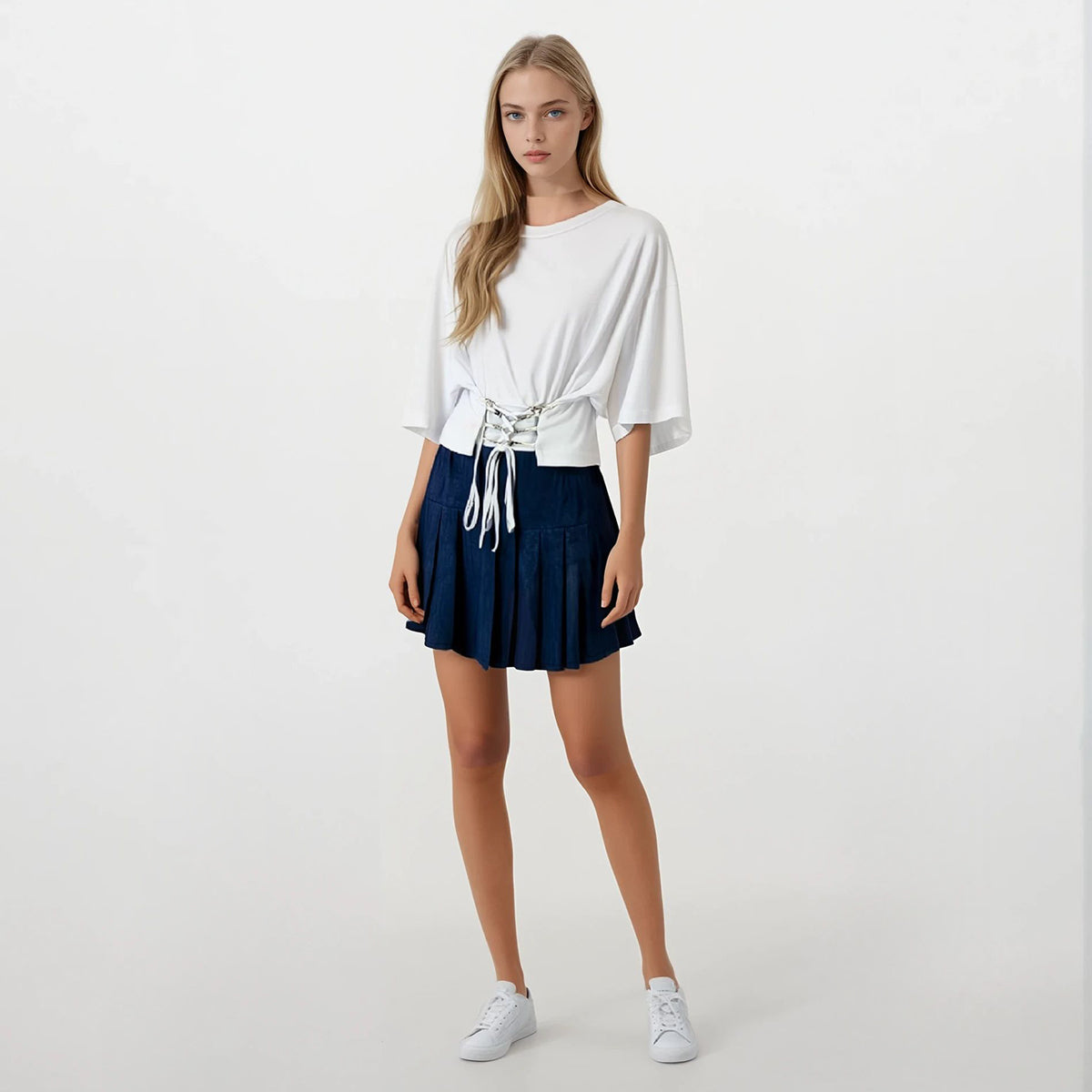 This cotton rich tee features a loose with and unique criss-cross corseting detail that can easily flipped to the front or back. Wear it loose or fitted and pair with with skirts or pants.