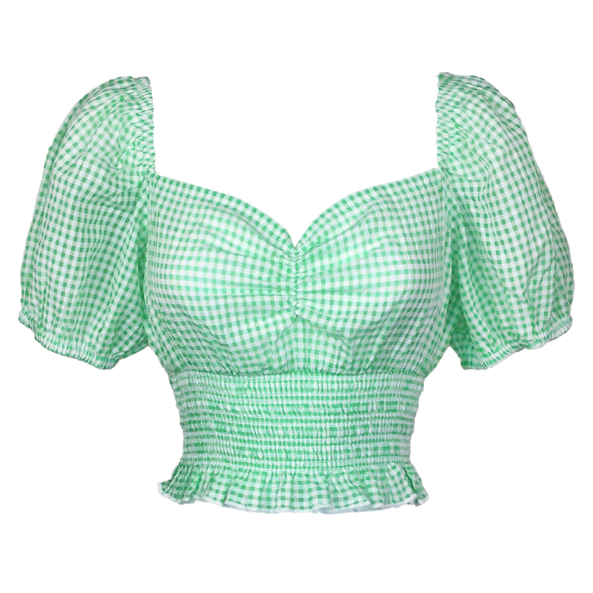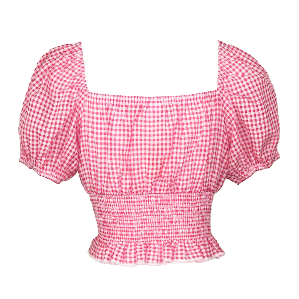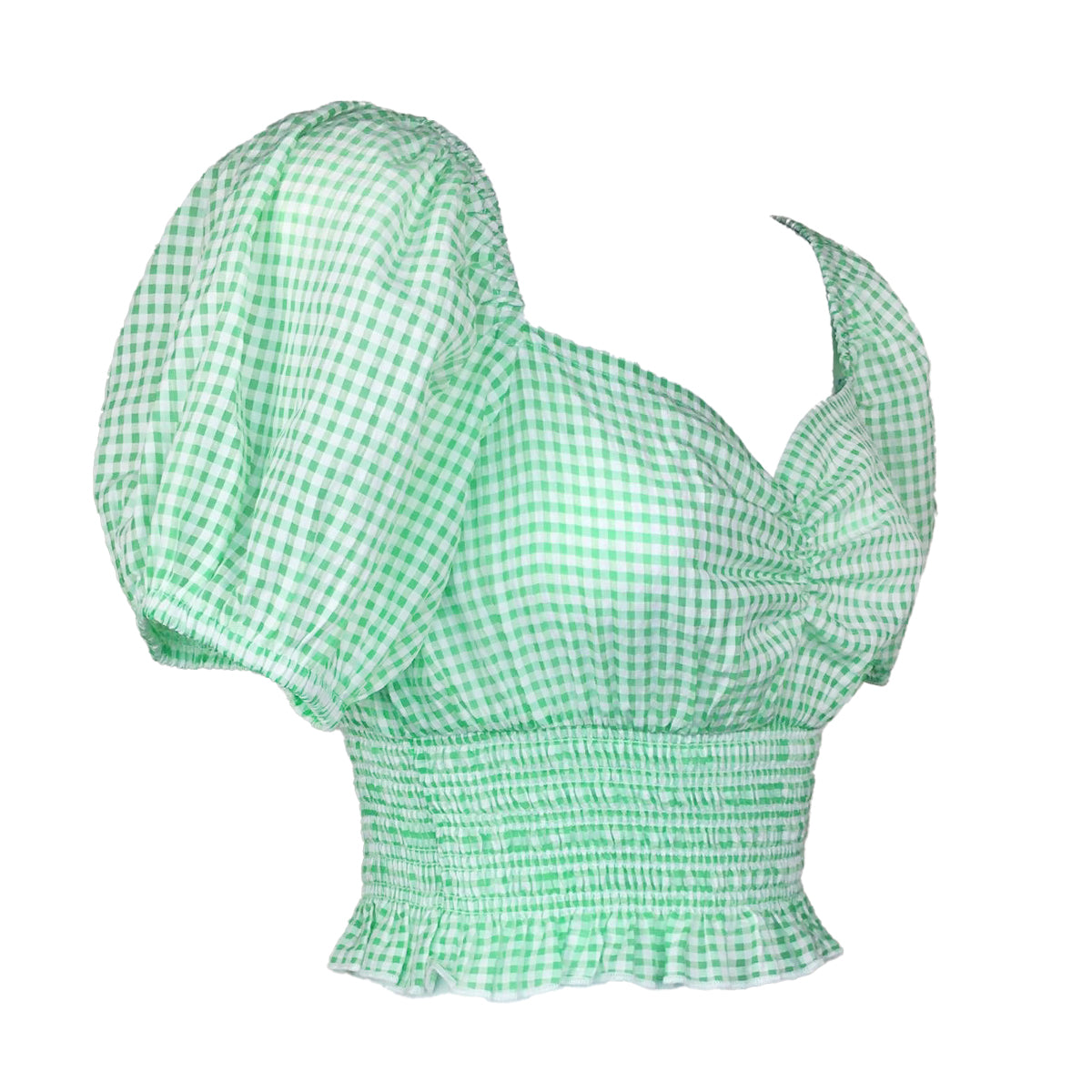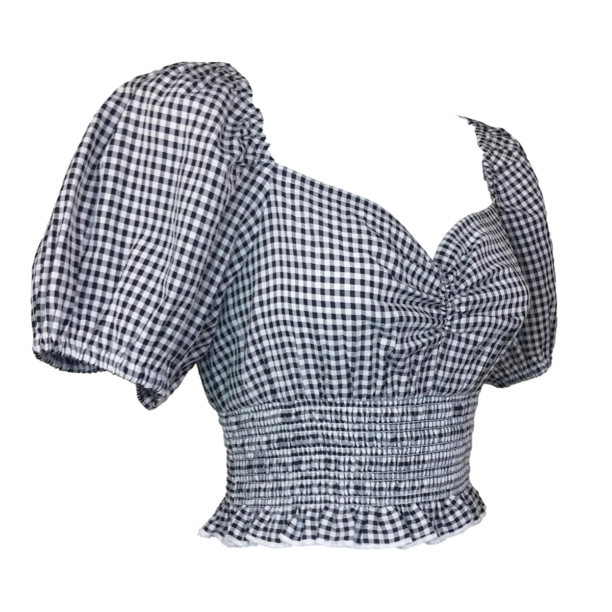 This light gingham blouse is a delightful fusion of classic charm and contemporary flair. Crafted with an exquisite sweetheart neckline, it exudes a sense of femininity and elegance. The smocked waist adds a flattering touch, accentuating your silhouette with a hint of playful sophistication.