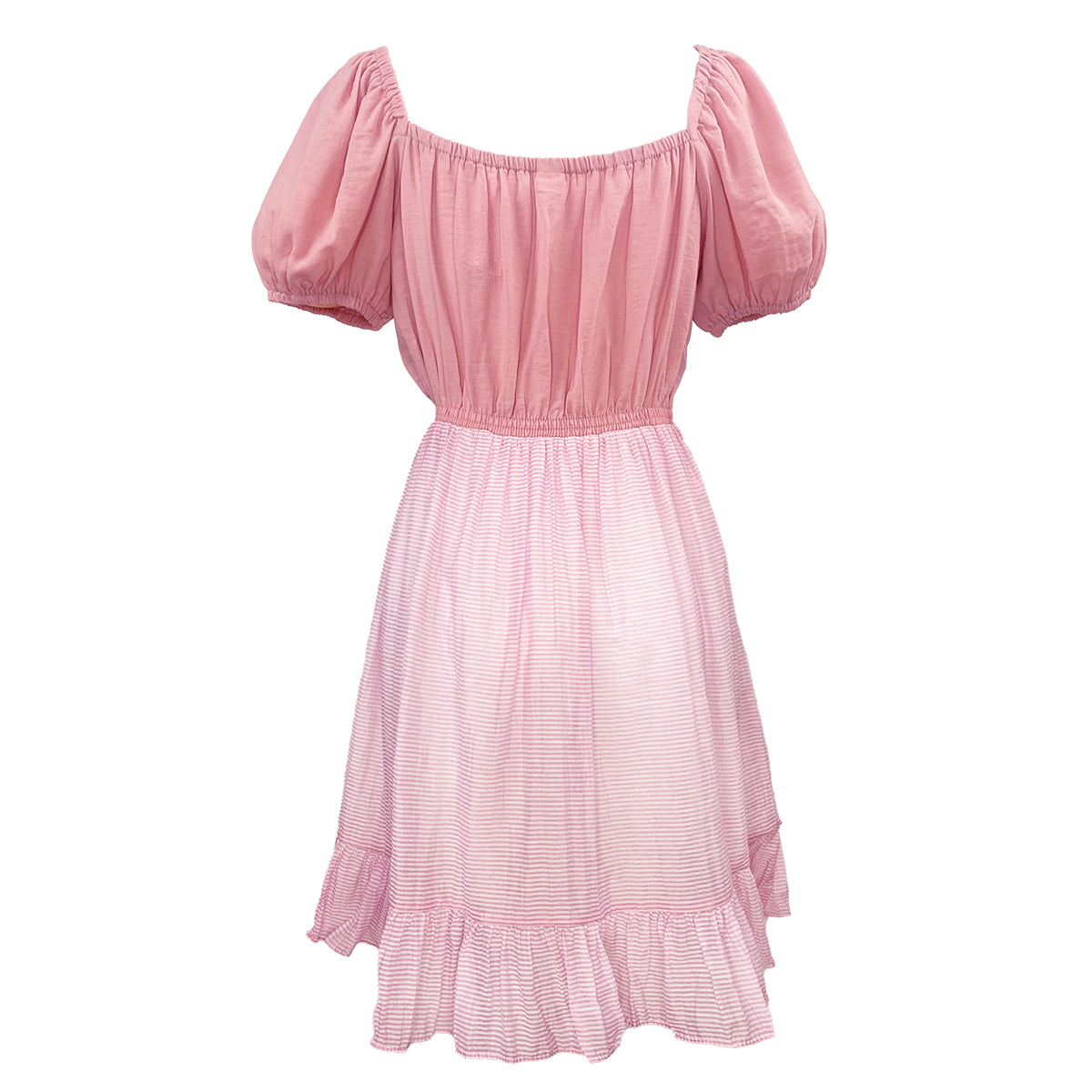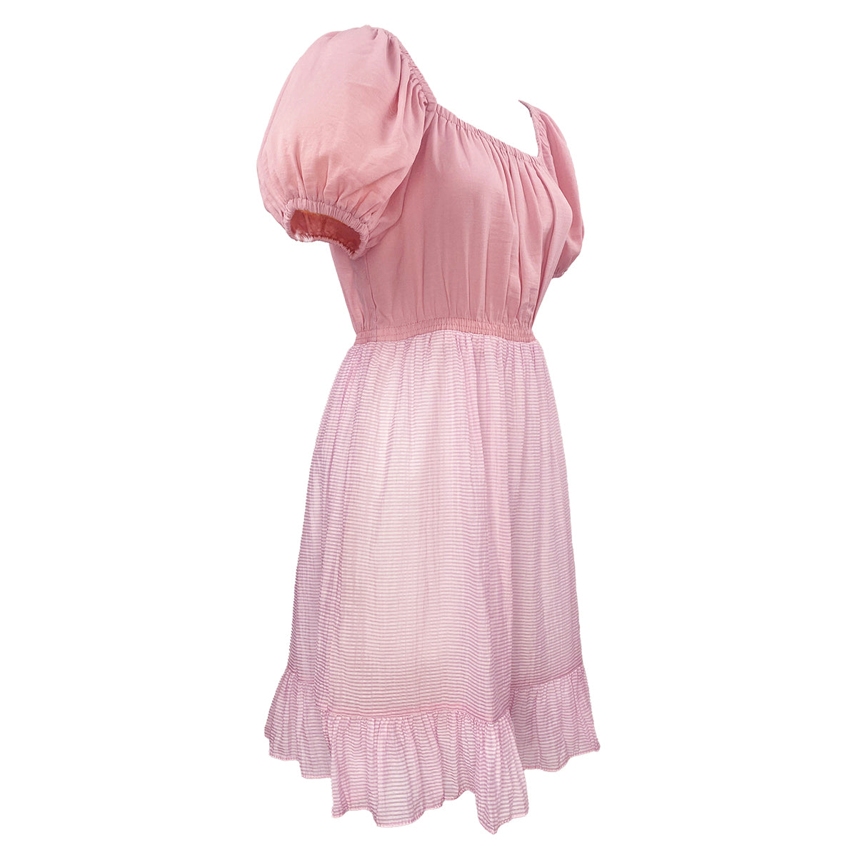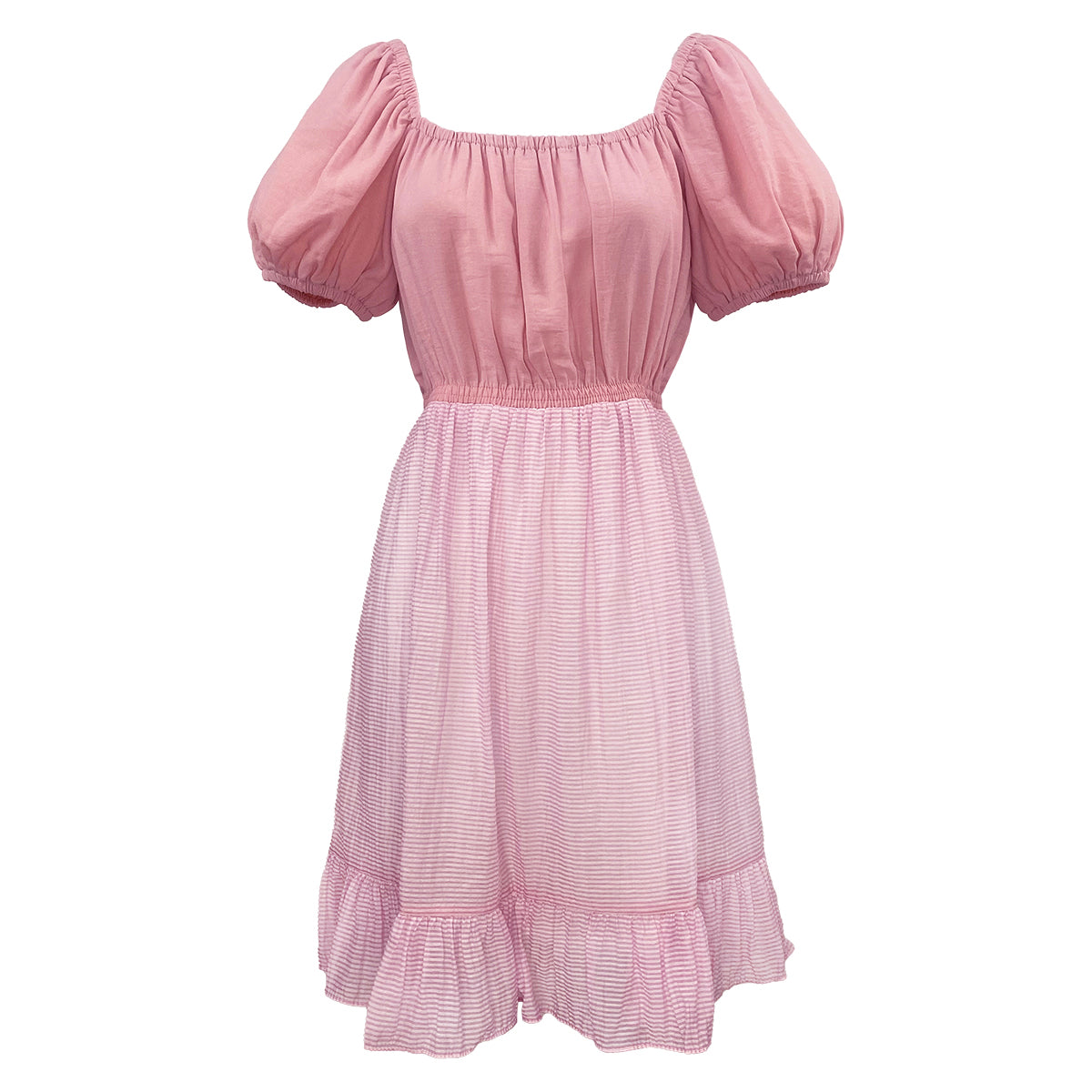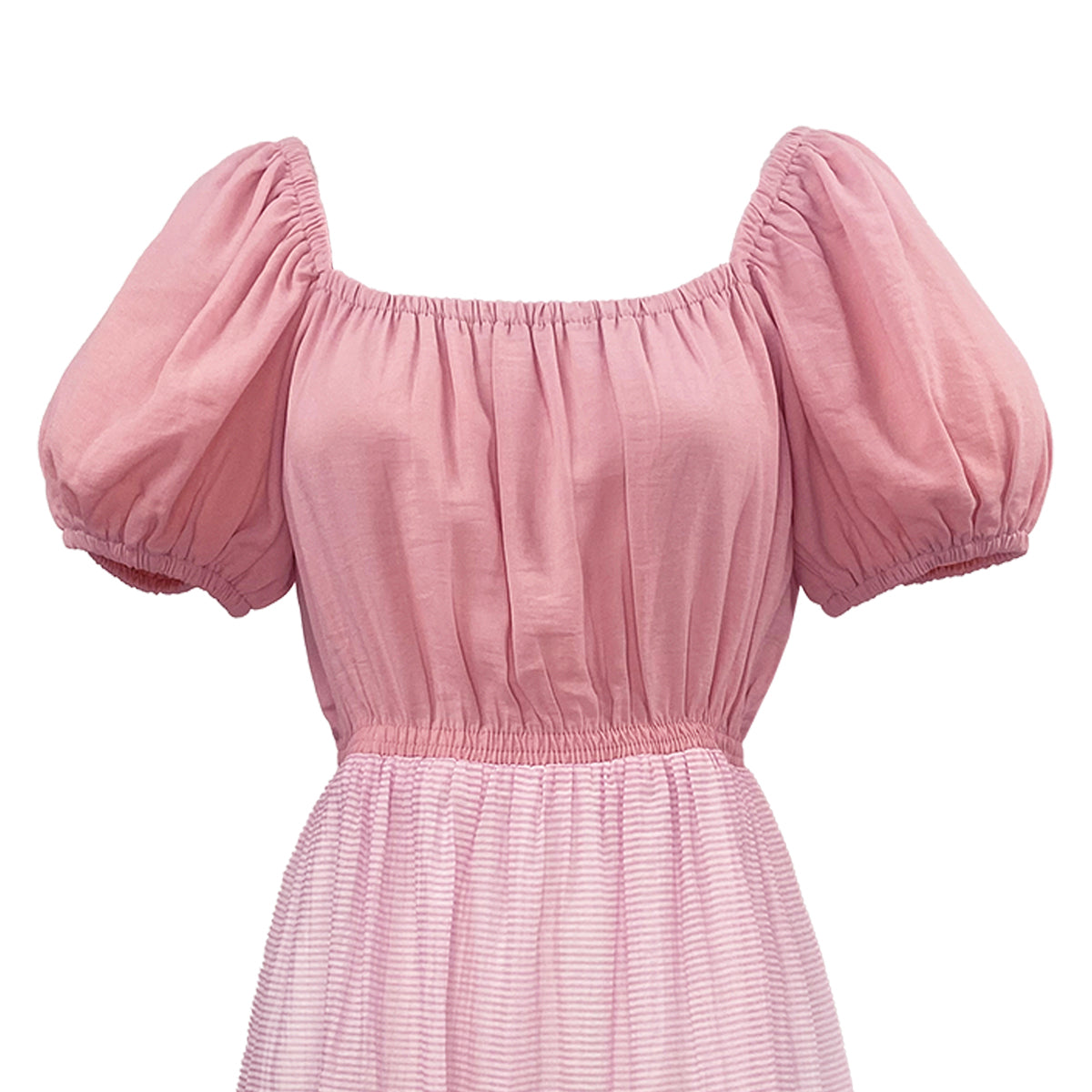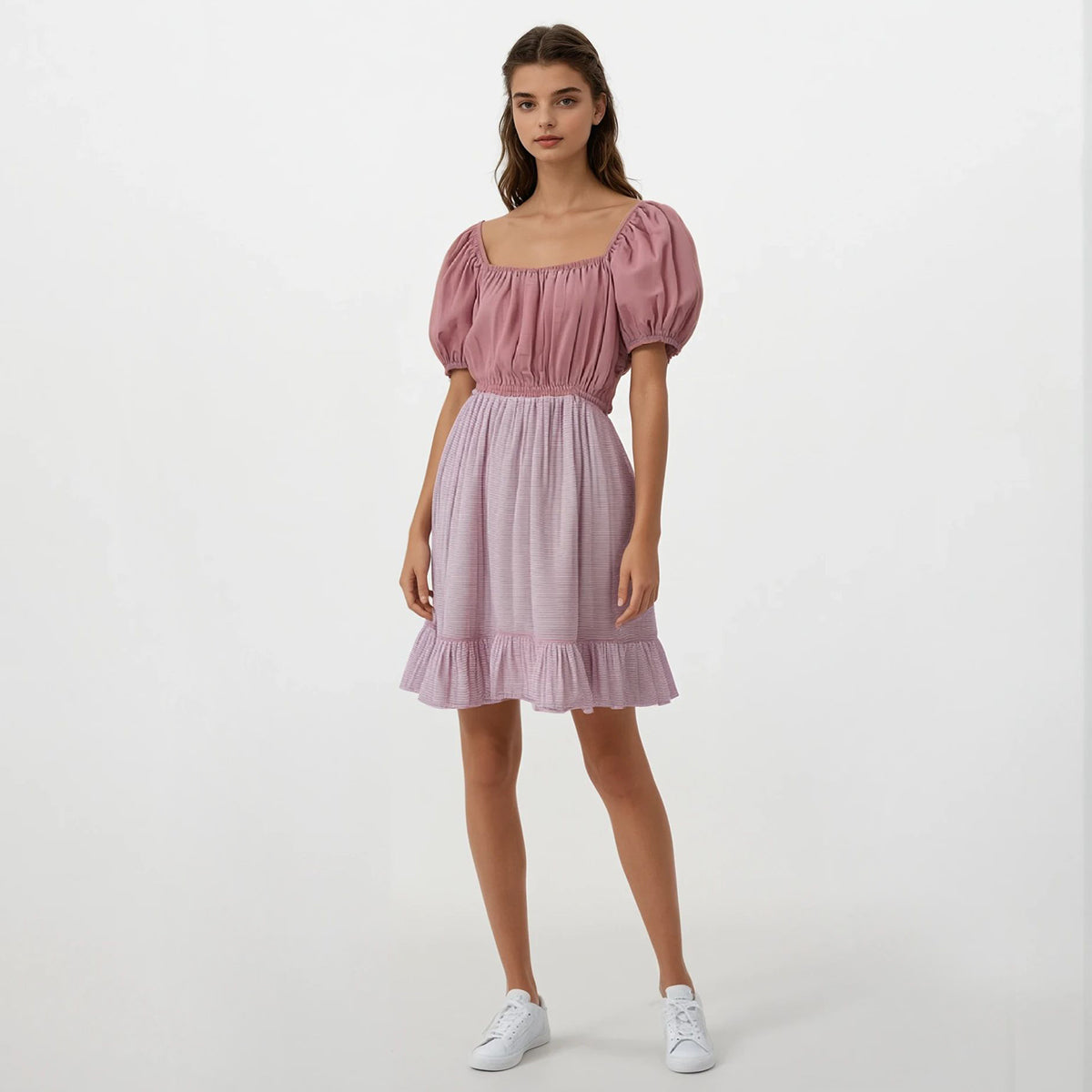 This knee-length dress features a charming square neckline and playful puff sleeves, blending plain and striped crepe fabrics for a unique, stylish look. Lined for comfort, its light and airy design keeps you feeling fresh all day. Perfect for adding a fun, elegant touch to your wardrobe.