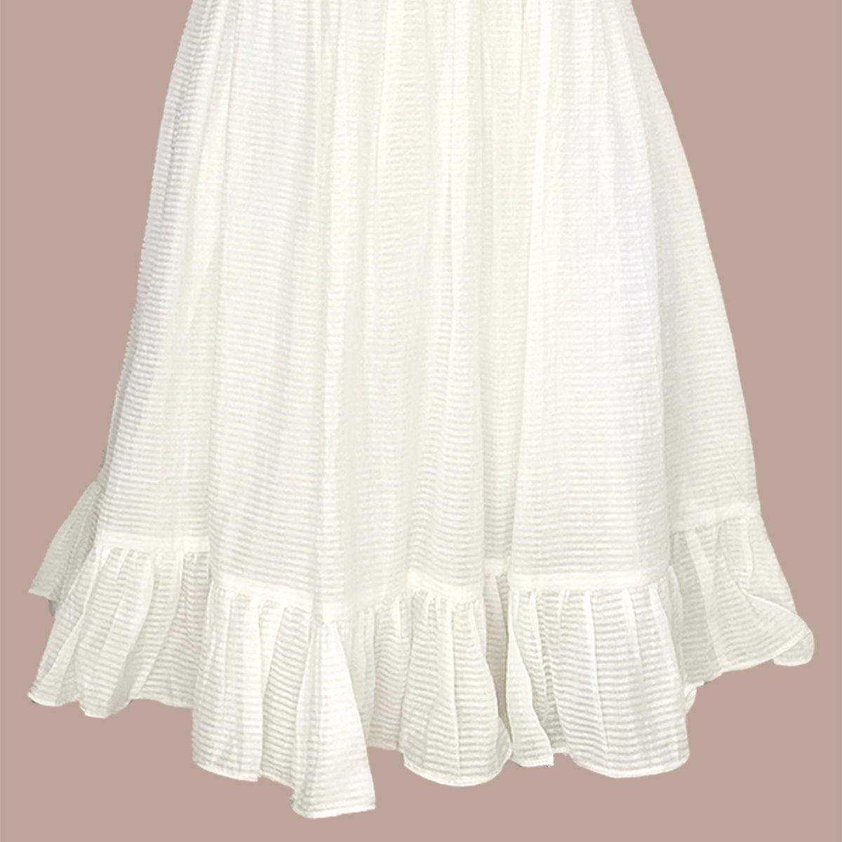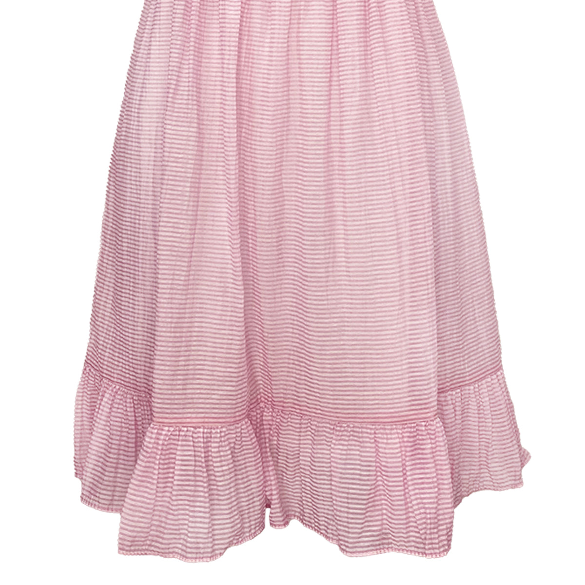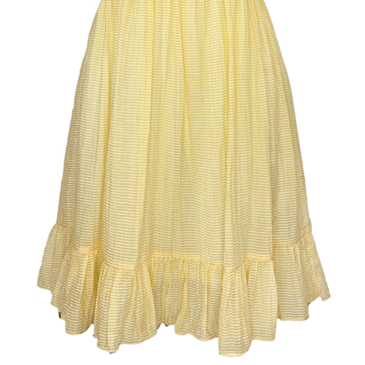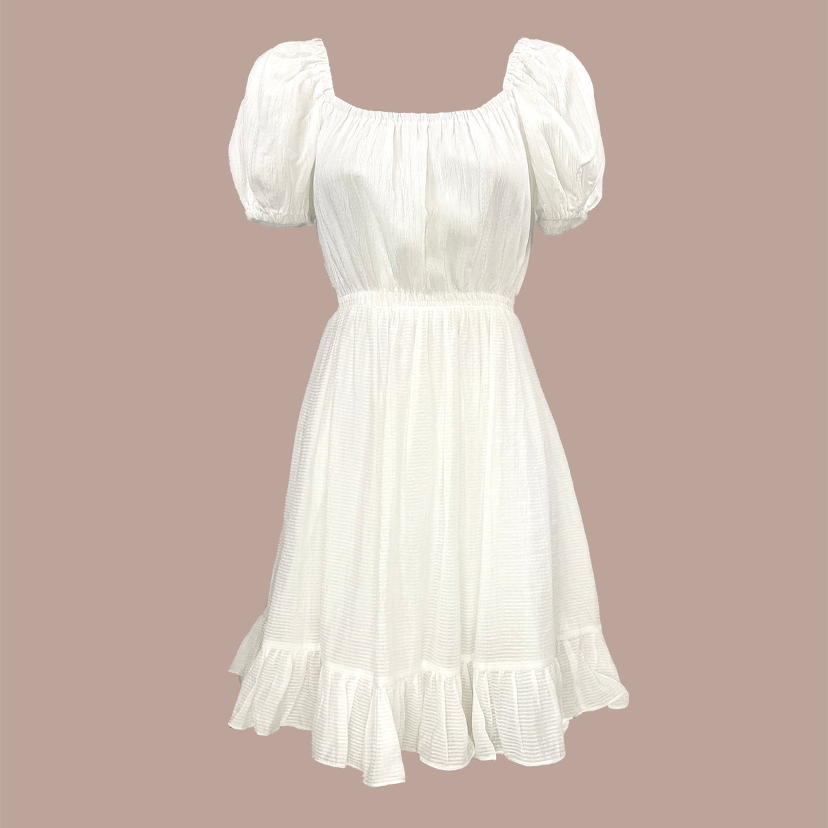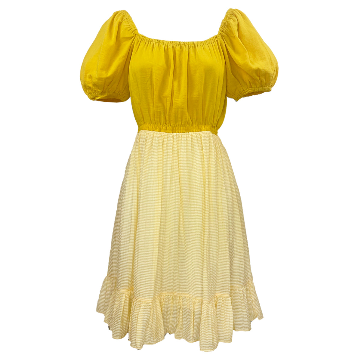This knee-length dress features a charming square neckline and playful puff sleeves, blending plain and striped crepe fabrics for a unique, stylish look. Lined for comfort, its light and airy design keeps you feeling fresh all day. Perfect for adding a fun, elegant touch to your wardrobe.