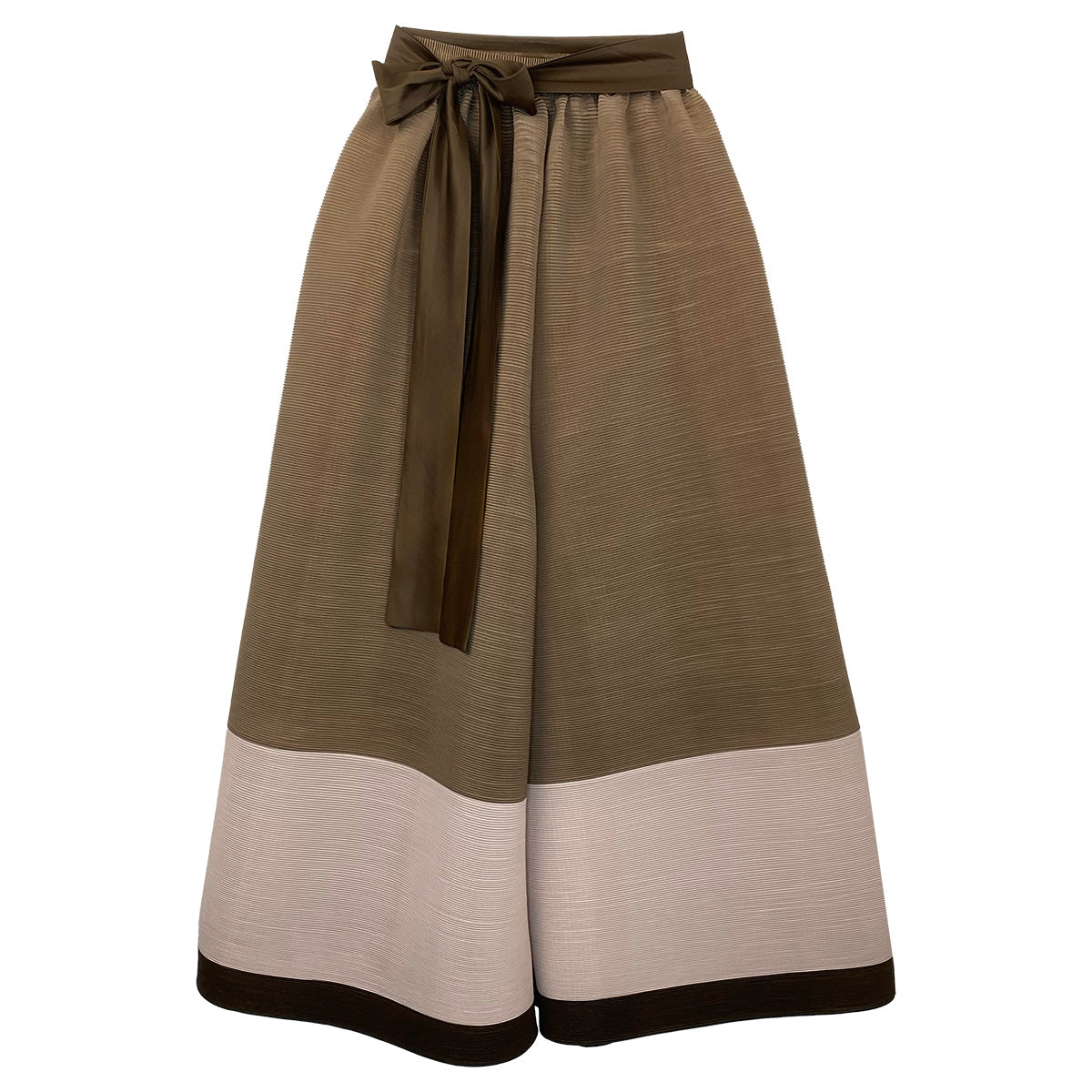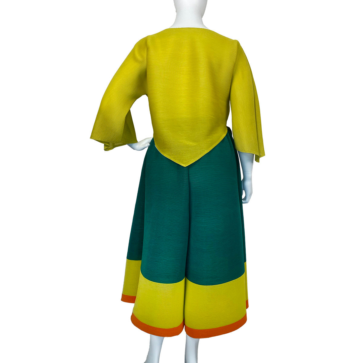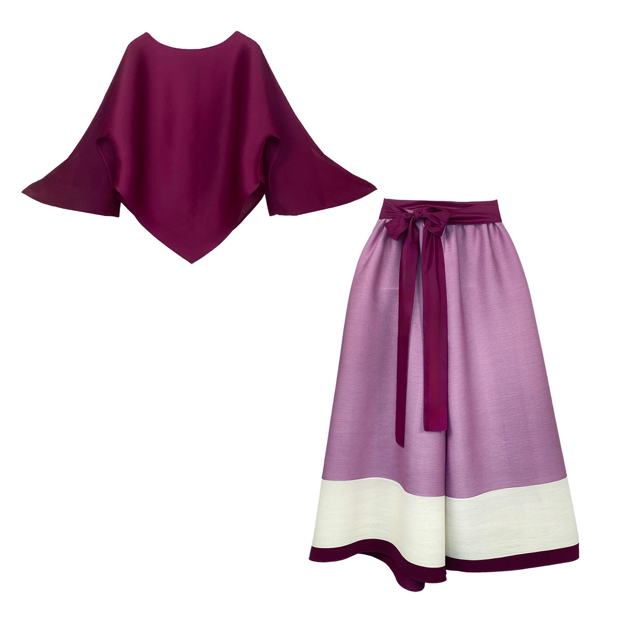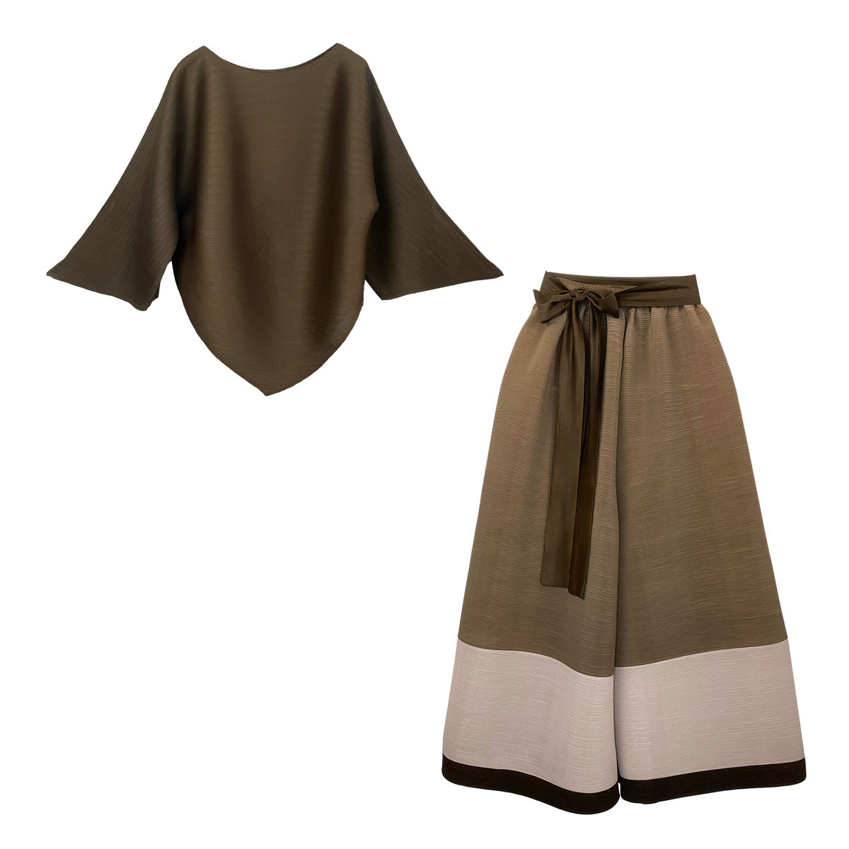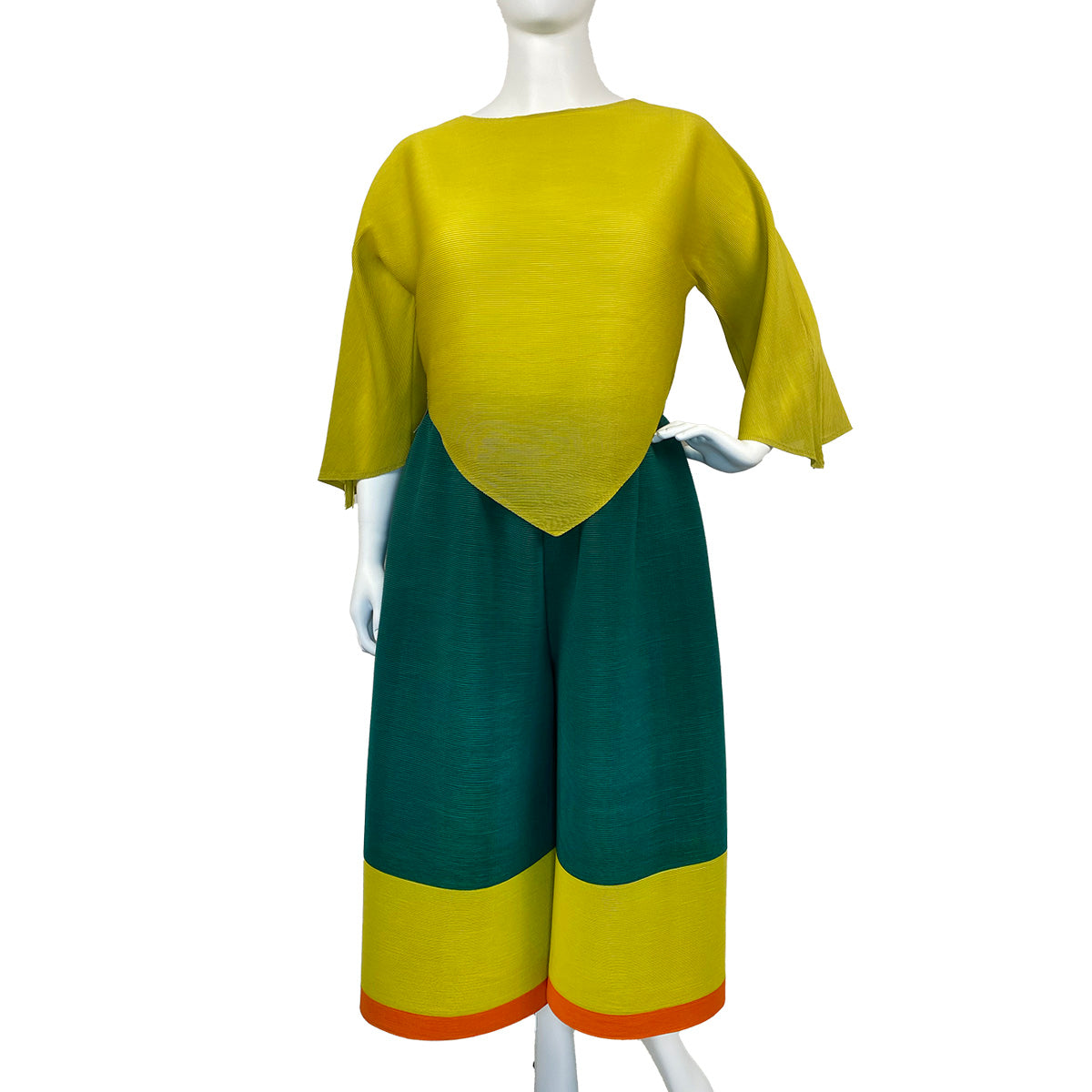 Make a statement with this color-blocked pleated blouse and wide-leg pants set. The asymmetrical blouse, paired with dramatic bell sleeves, brings a unique and contemporary edge, while the pants' flowy wide-leg silhouette offers comfort and versatility. Wear the pants with a belt for added structure or go without for a laid-back vibe.