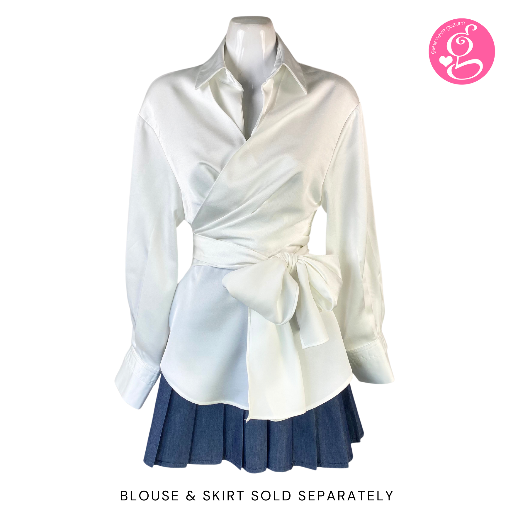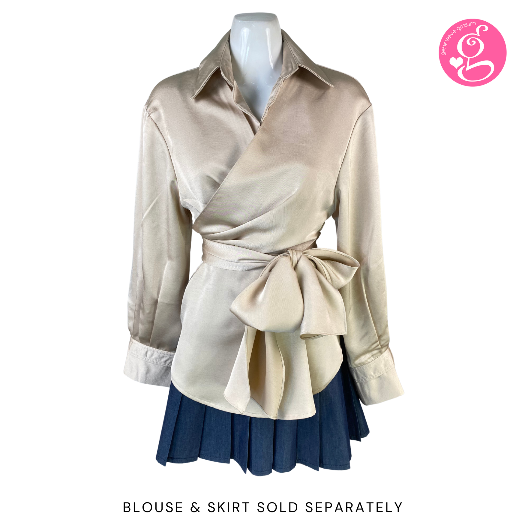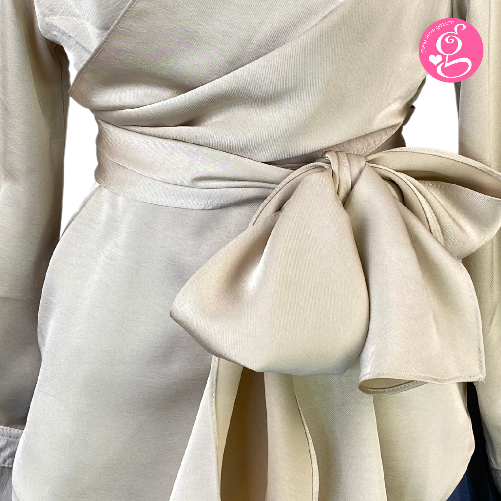This wrap around blouse is the perfect addition to any wardrobe. Made with soft charmeuse satin, it features a stylish collar, long sleeves with cuff detail, and a dramatic sash that adds a touch of elegance. Available in both white and beige, this blouse is versatile and can be dressed up or down for any occasion.