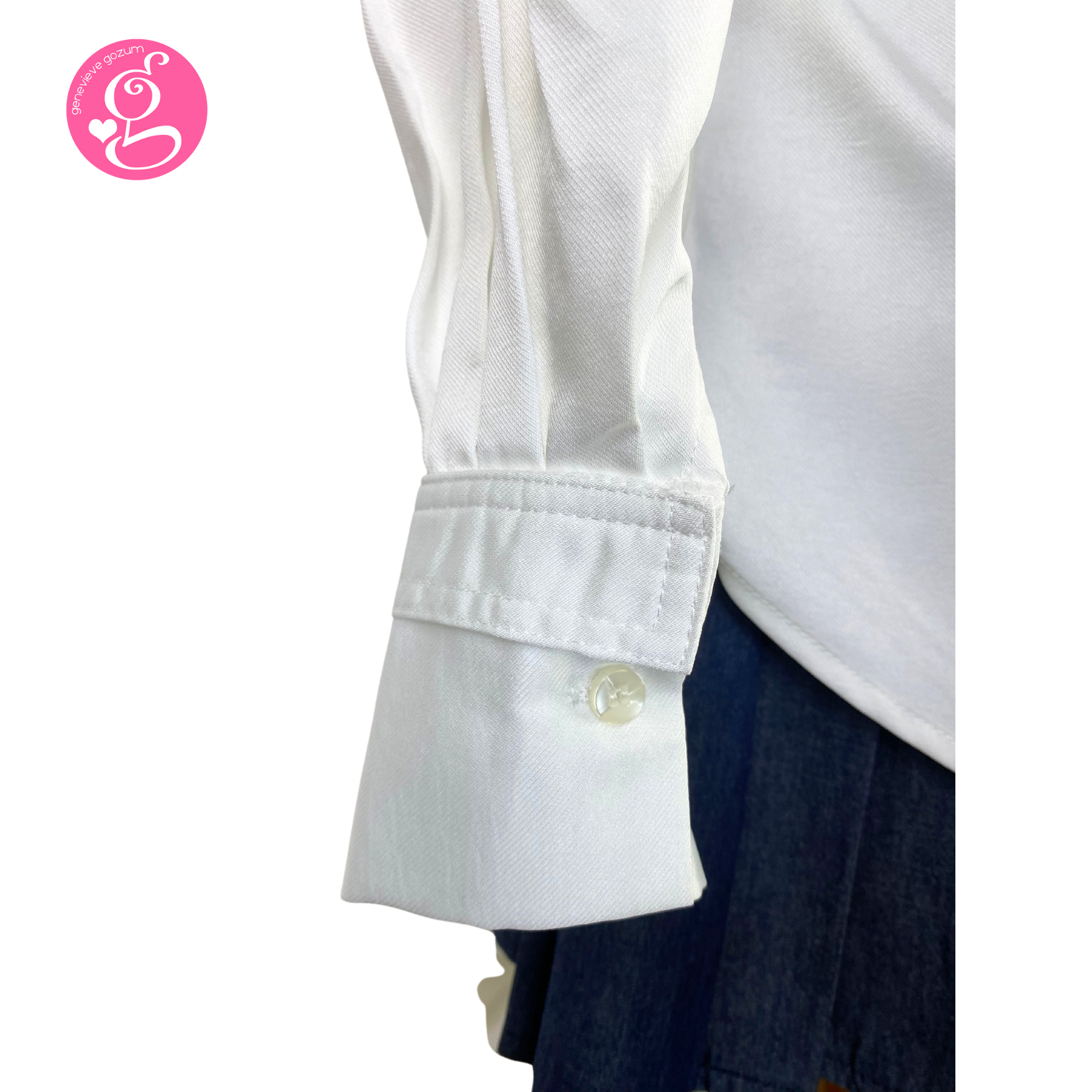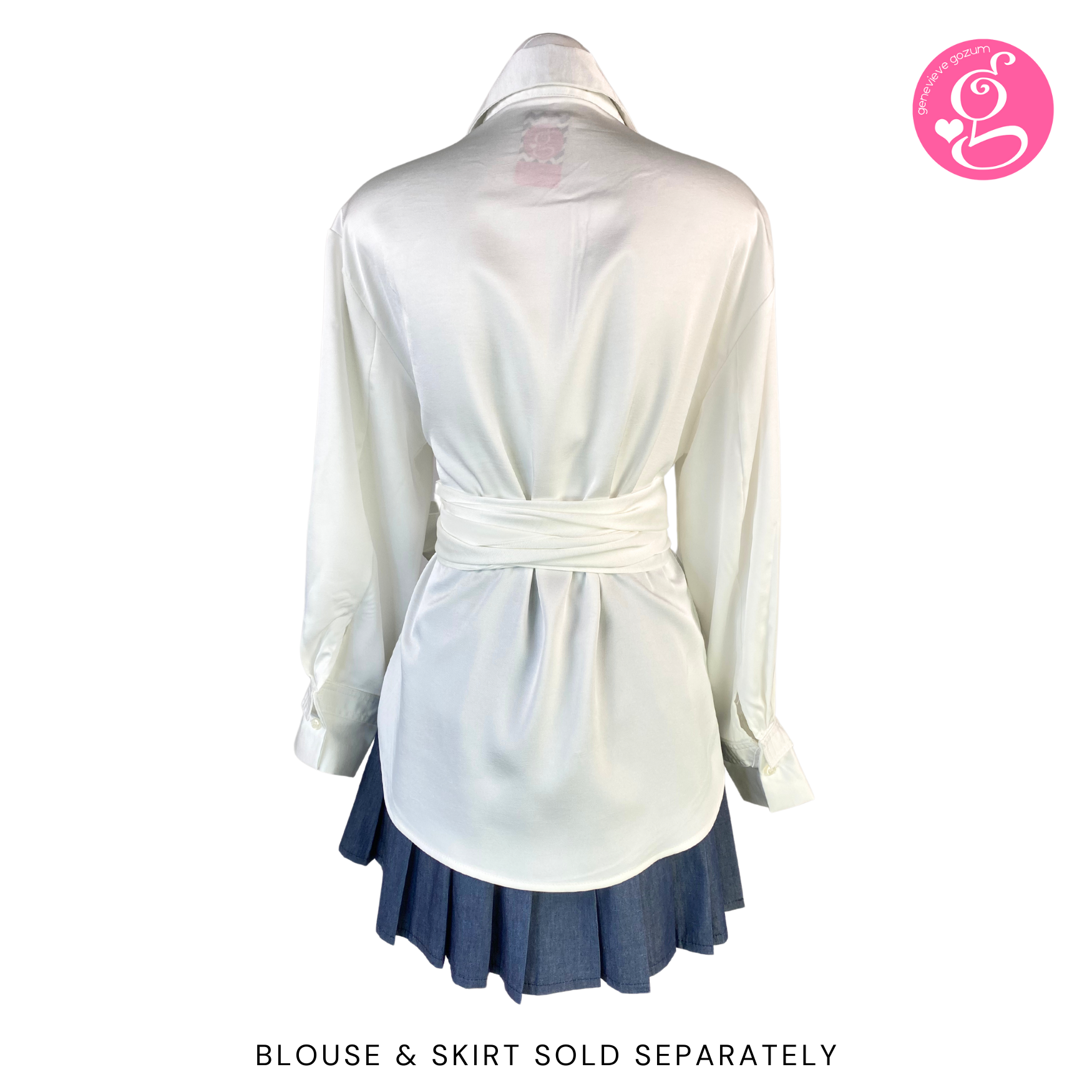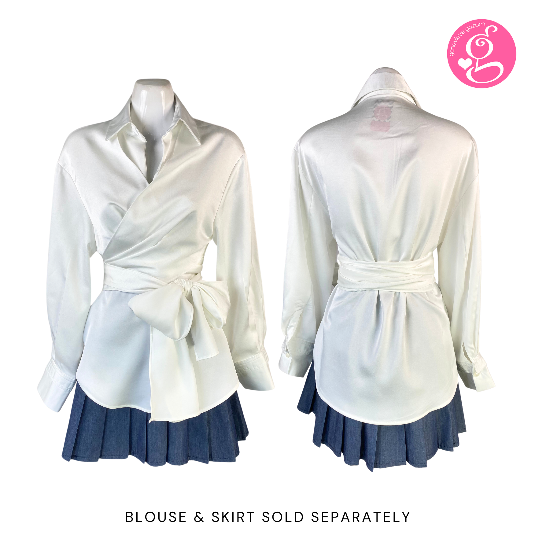 This wrap around blouse is the perfect addition to any wardrobe. Made with soft charmeuse satin, it features a stylish collar, long sleeves with cuff detail, and a dramatic sash that adds a touch of elegance. Available in both white and beige, this blouse is versatile and can be dressed up or down for any occasion.