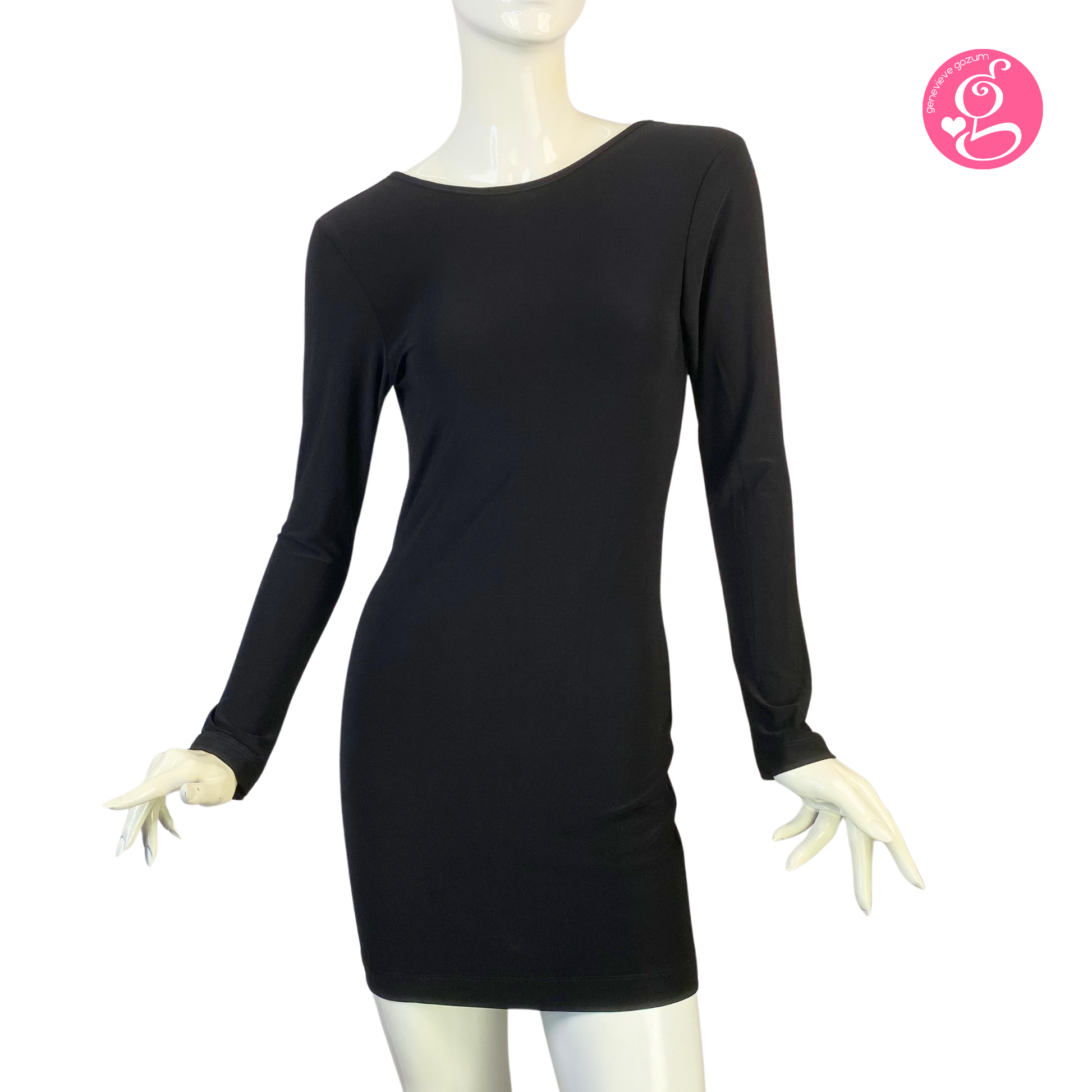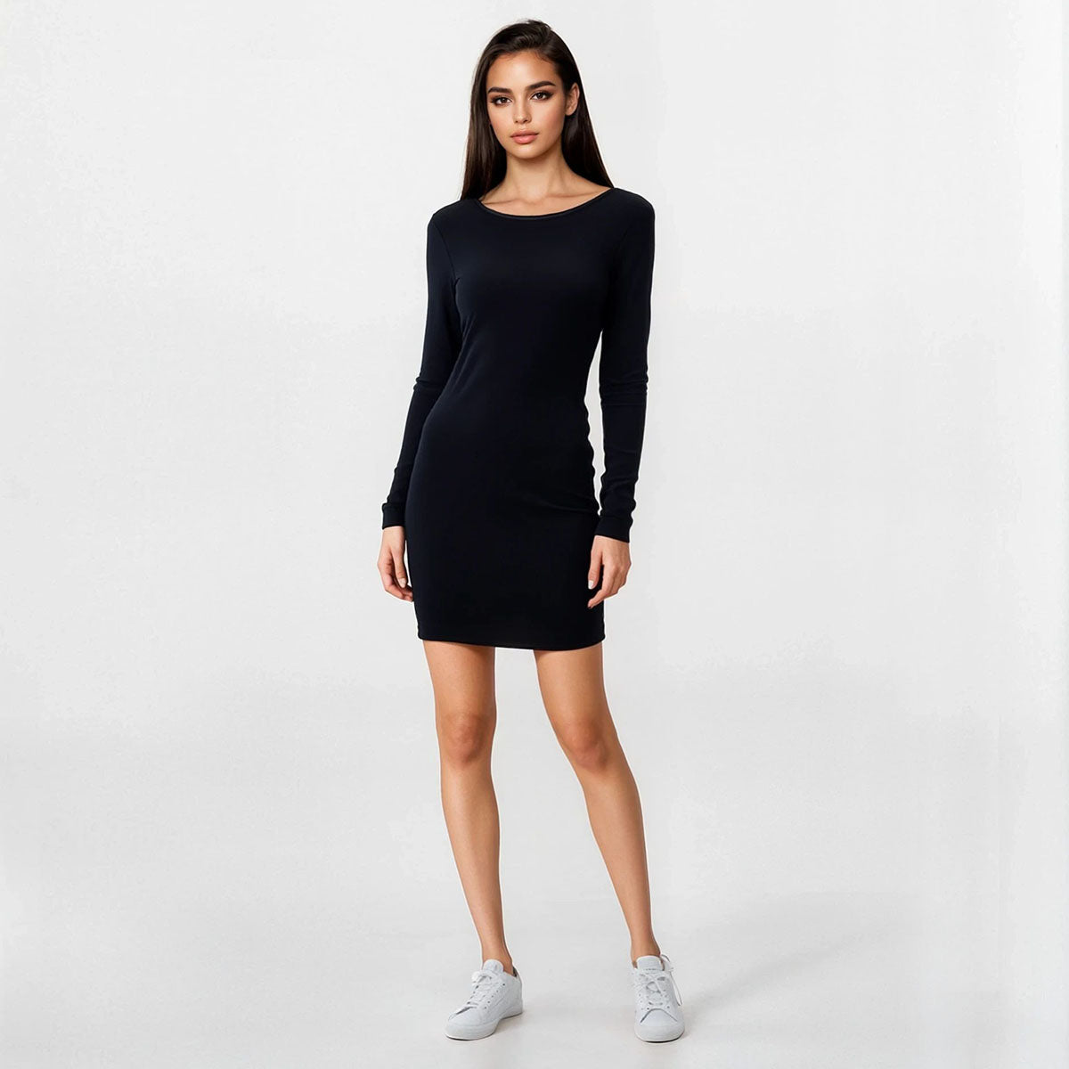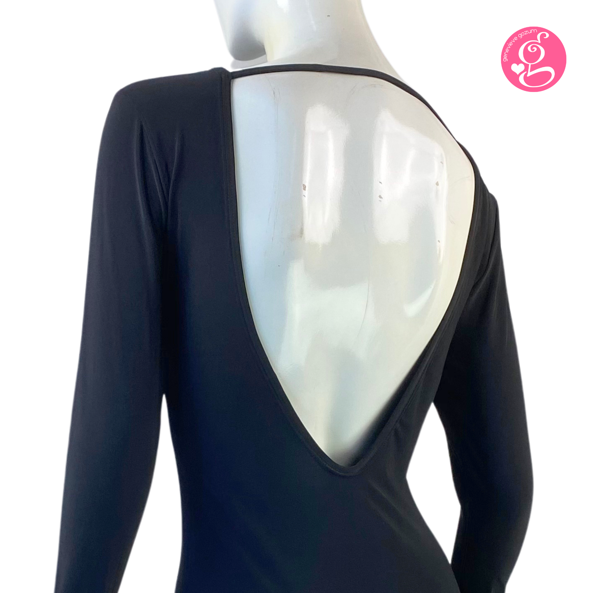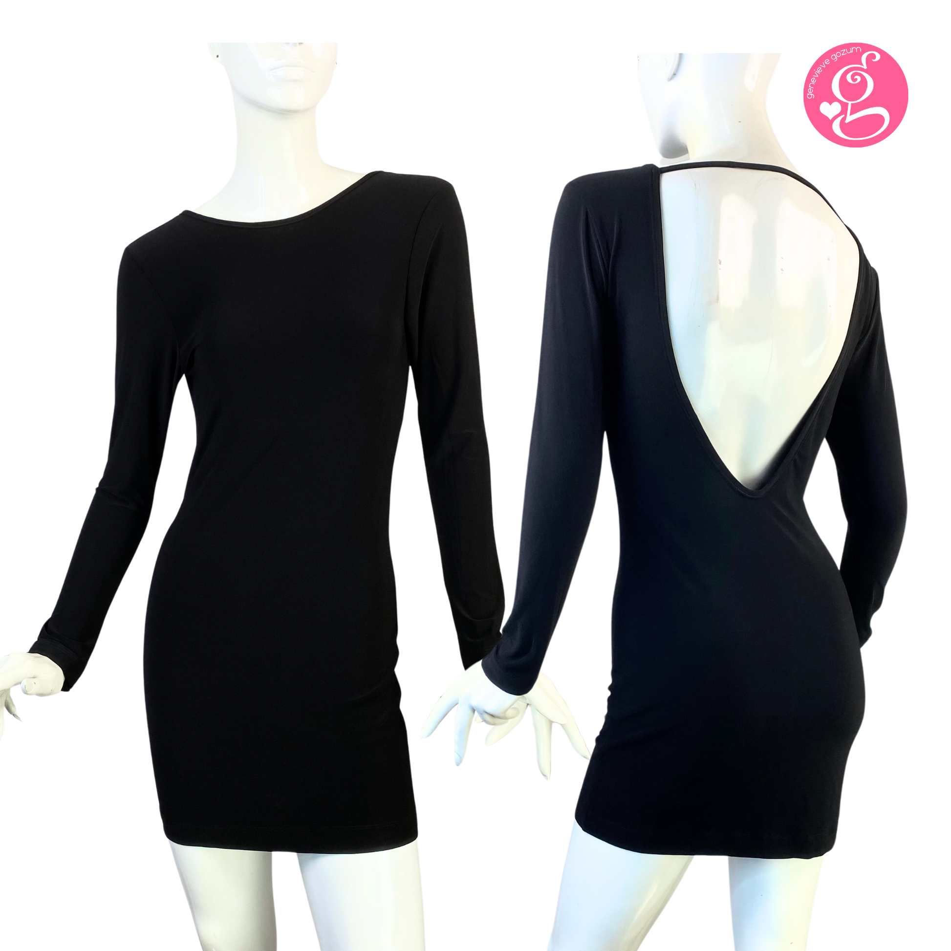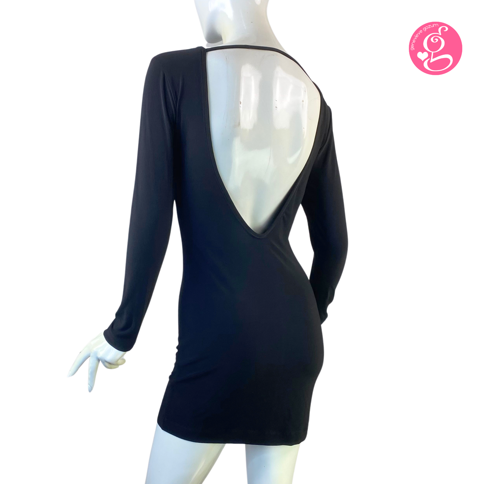 Bodycon, backless dress and falls above the knee. Long, fitted sleeves.