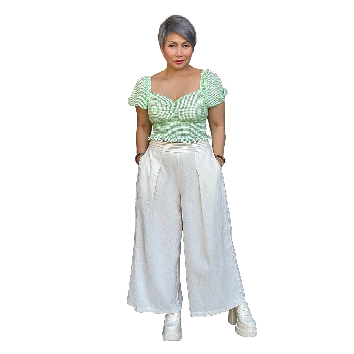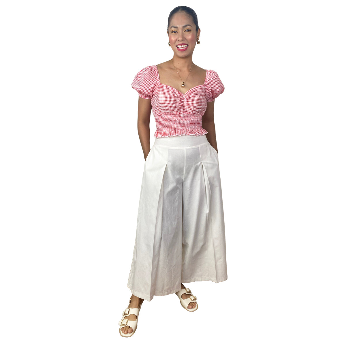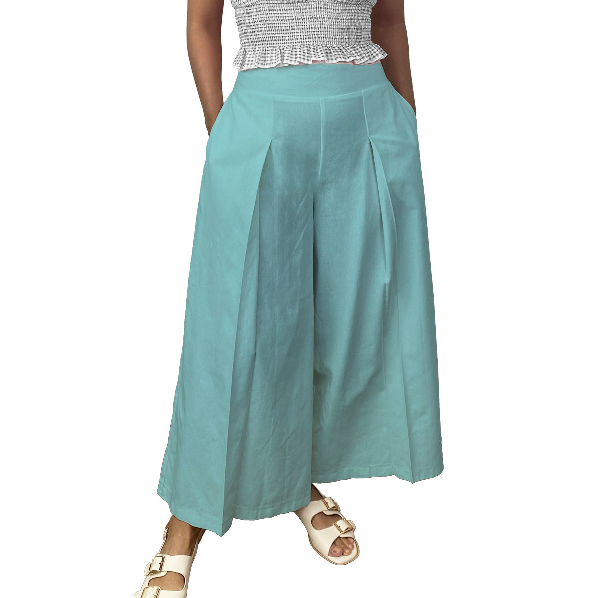 Wide-leg pants with pleats crafted from cotton linen fabric are a versatile wardrobe staple, seamlessly transitioning from day to night with effortless style. These pants boast a tailored yet relaxed silhouette, featuring a high waist that accentuates the figure while offering comfort and ease of movement.