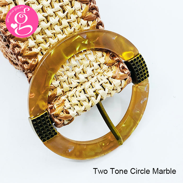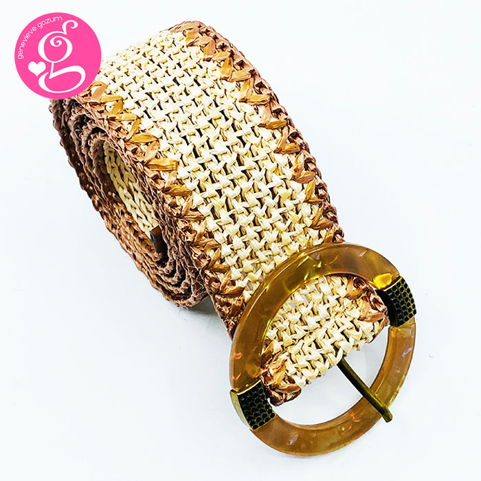 These belts are made of organic materials, doesn't stretch, and is intended to enhance one's figure. The belt may have a distinctive weave pattern and is secured with a resin buckle.