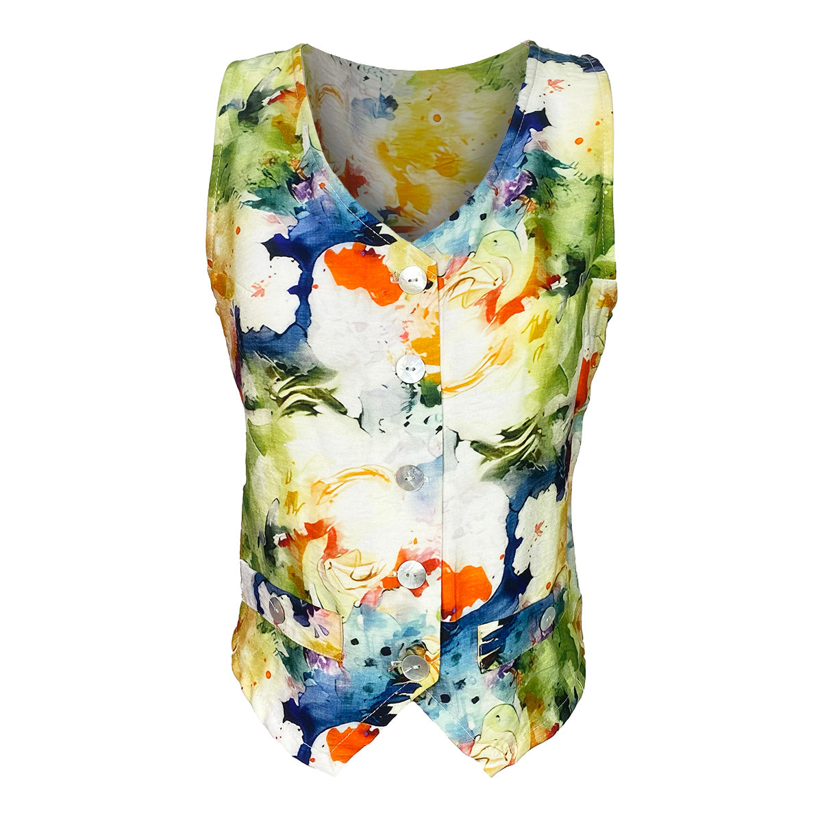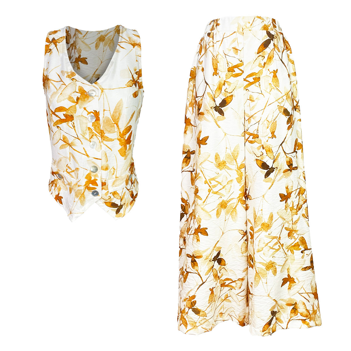 This vest and pants set, crafted from printed linen fabric, offers a classic style that's both versatile and stylish. Perfect for mix-and-match outfits and layering, it combines comfort with a timeless aesthetic, making it a must-have for creating effortless, chic looks.