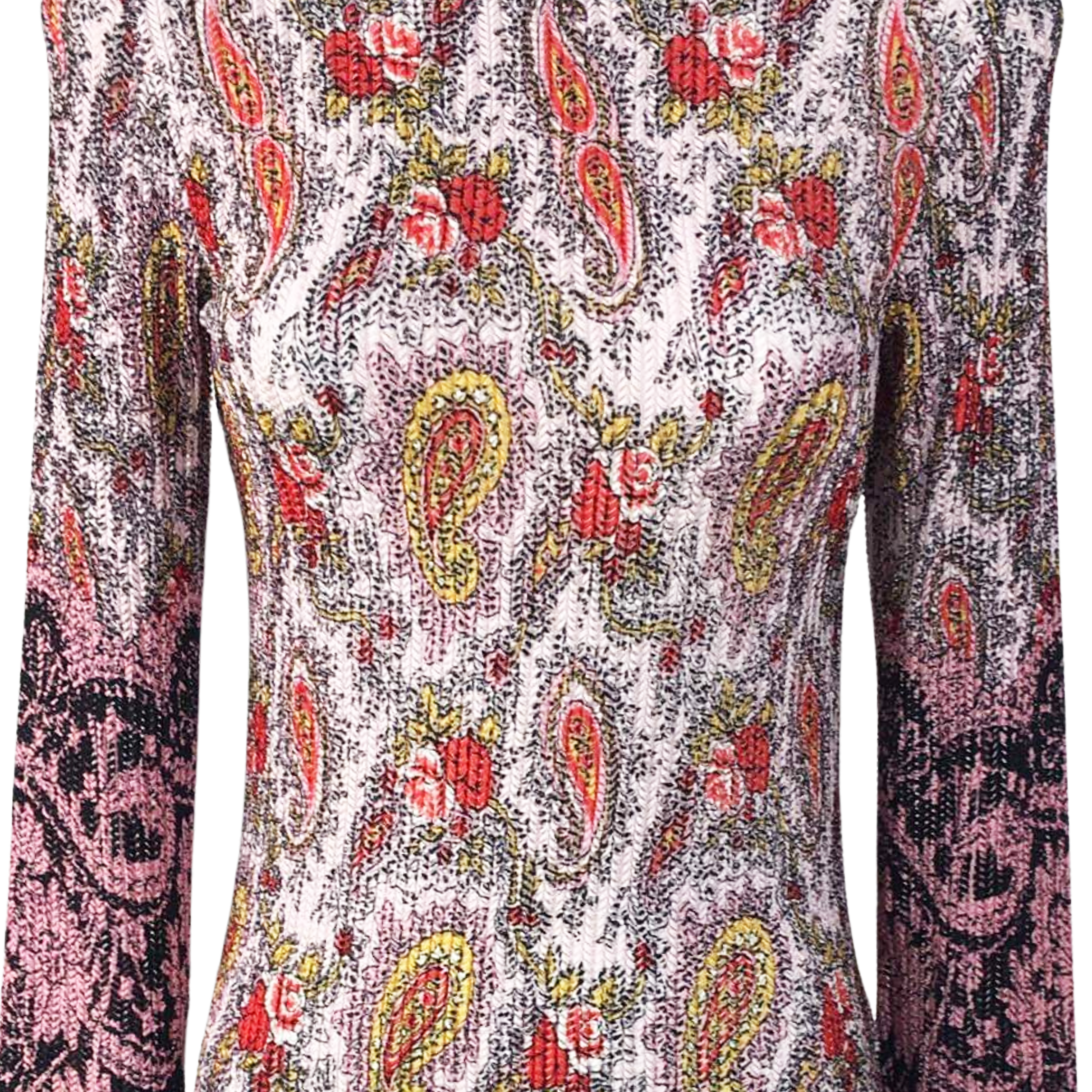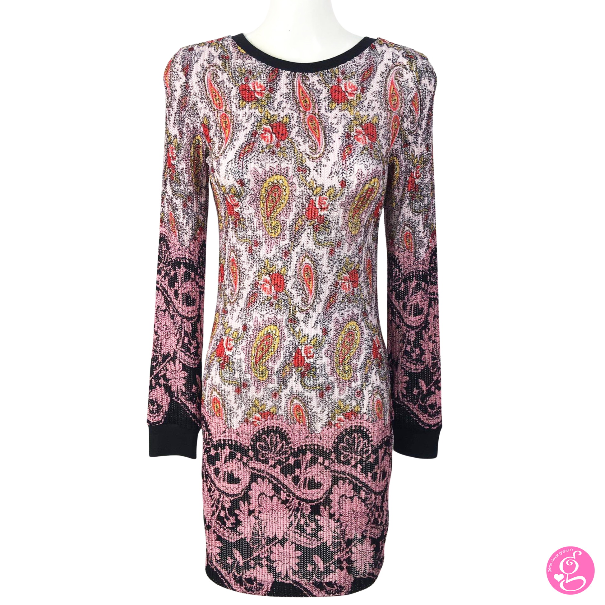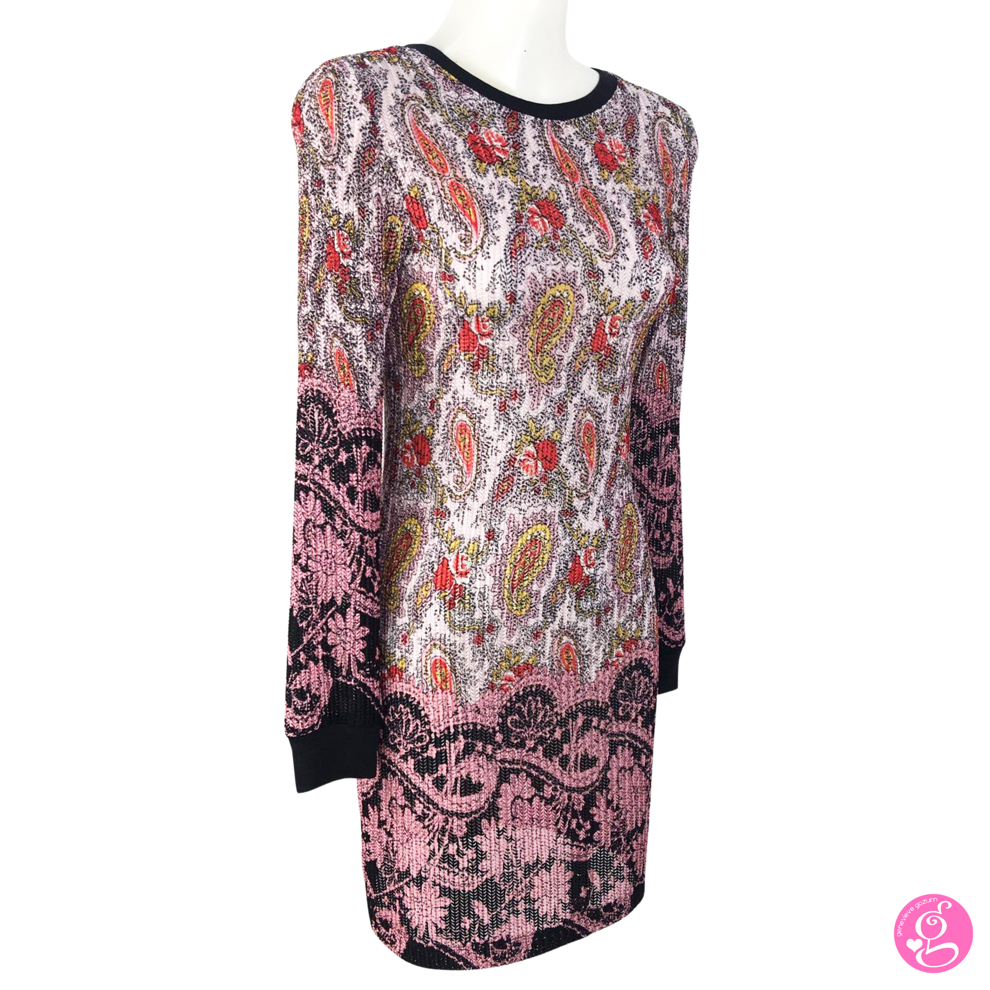 This dress features a textured knit with a paisley and border print. The print is all over paisley on the upper part of the dress and a unique border print on the lower skirt part.