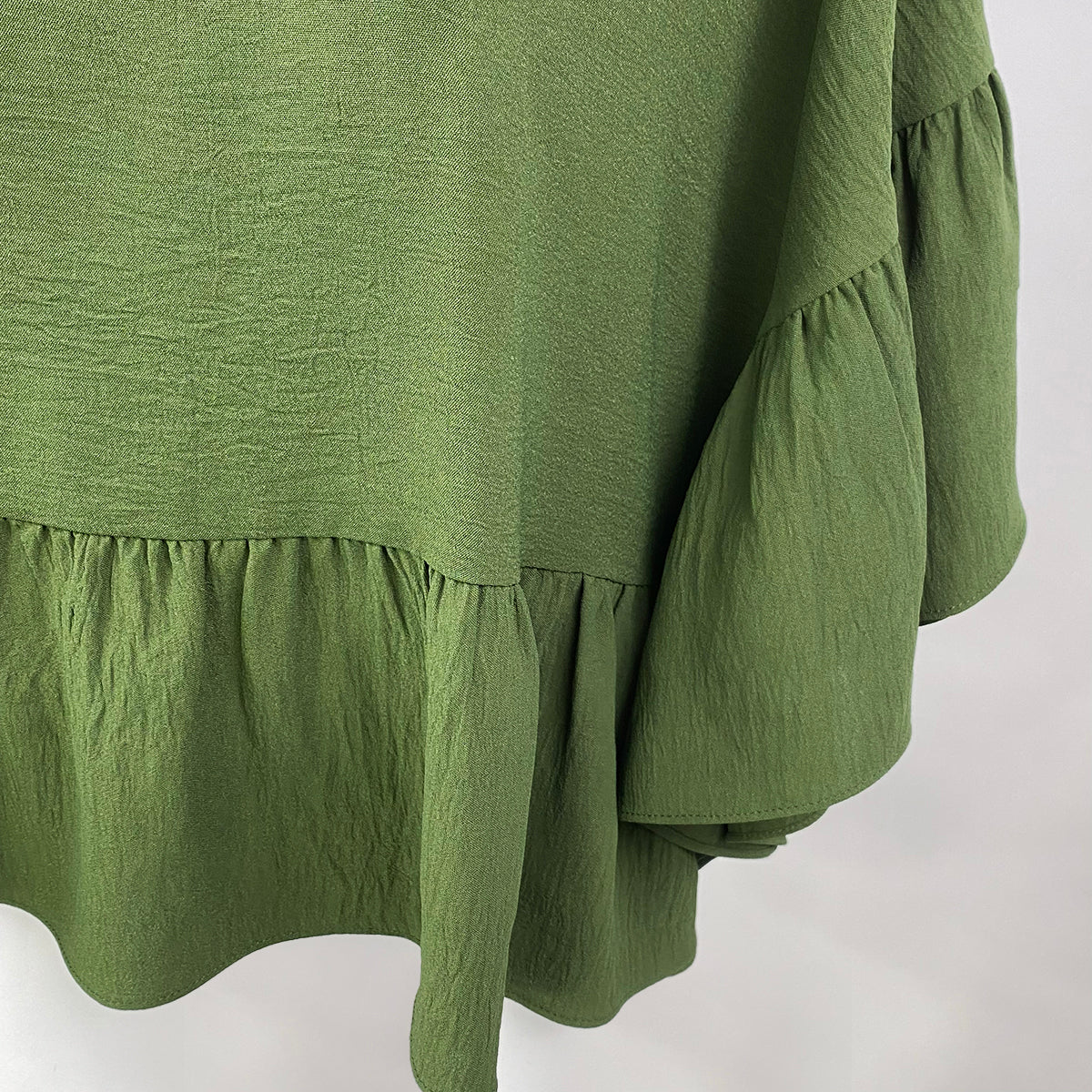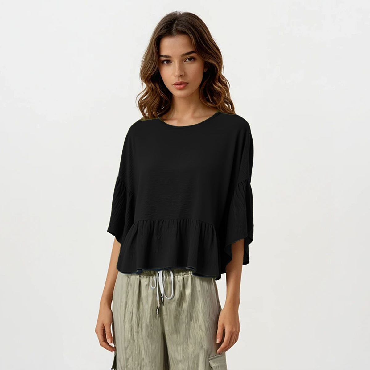 This cape blouse features delicately ruffled edges crafted from premium linen crepe fabric, offering a lightweight and breathable feel. Its figure-friendly design drapes elegantly, providing both comfort and a flattering silhouette. Ideal for those seeking a stylish yet effortless layering piece that moves gracefully with you.