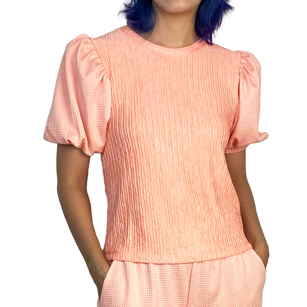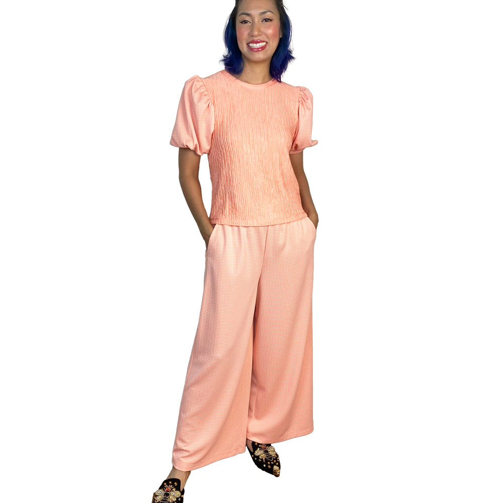 Sweet Waffle Combo Puff Sleeves Blouse and Pants Set