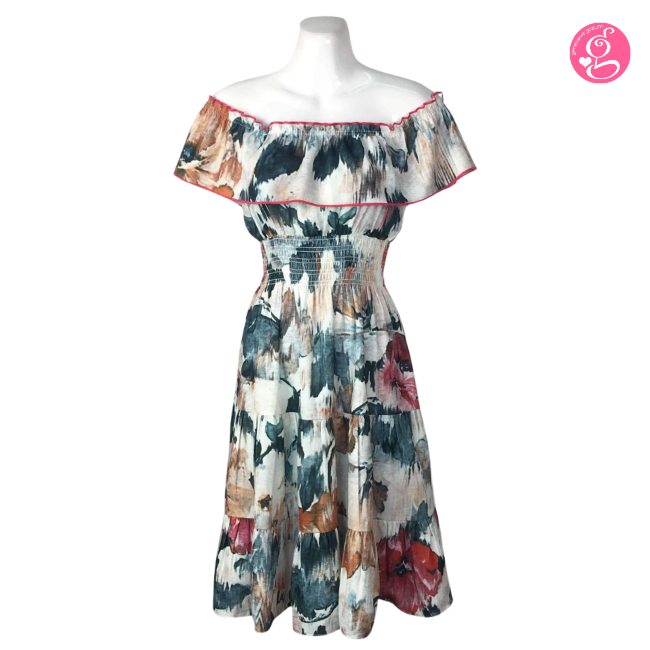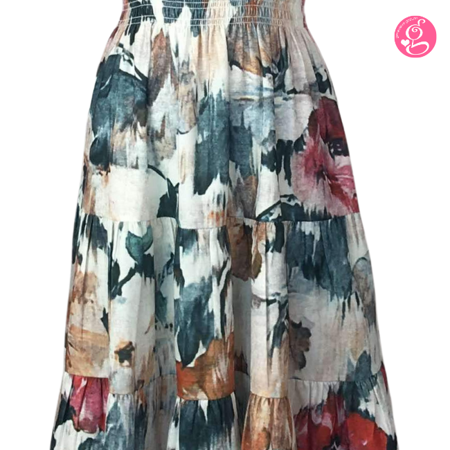 The Genevieve Gozum Watercolor Blooms Tea Length Dress is an elegant printed, knee length dress made of our signature organic linen fabric with floral print detail.