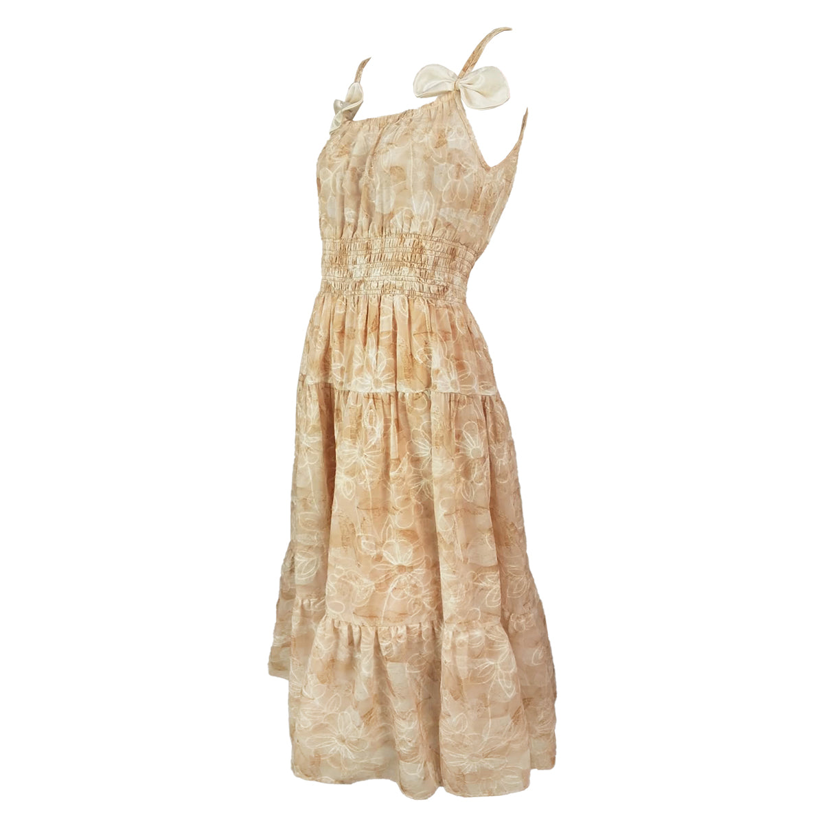 Elegant pastel eyelet spaghetti strap dress designed to flatter every figure. Delicate flower petal details adorn the straps, while strategic smocking at the waist creates a refined silhouette. The layered skirt adds graceful movement and dimension. Perfect for garden parties, weddings, or any occasion calling for effortless sophistication. Soft, romantic, and universally flattering.